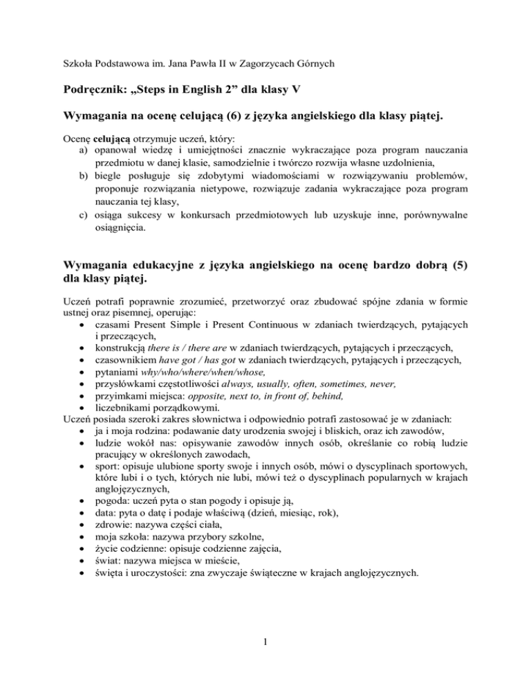Szkoła Podstawowa im. Jana Pawła II w Zagorzycach Górnych Podręcznik: „Steps in English 2” dla klasy V Wymagania na ocenę celującą (6) z języka angielskiego dla klasy piątej. Ocenę celującą otrzymuje uczeń, który: a) opanował wiedzę i umiejętności znacznie wykraczające poza program nauczania przedmiotu w danej klasie, samodzielnie i twórczo rozwija własne uzdolnienia, b) biegle posługuje się zdobytymi wiadomościami w rozwiązywaniu problemów, proponuje rozwiązania nietypowe, rozwiązuje zadania wykraczające poza program nauczania tej klasy, c) osiąga sukcesy w konkursach przedmiotowych lub uzyskuje inne, porównywalne osiągnięcia. Wymagania edukacyjne z języka angielskiego na ocenę bardzo dobrą (5) dla klasy piątej. Uczeń potrafi poprawnie zrozumieć, przetworzyć oraz zbudować spójne zdania w formie ustnej oraz pisemnej, operując: czasami Present Simple i Present Continuous w zdaniach twierdzących, pytających i przeczących, konstrukcją there is / there are w zdaniach twierdzących, pytających i przeczących, czasownikiem have got / has got w zdaniach twierdzących, pytających i przeczących, pytaniami why/who/where/when/whose, przysłówkami częstotliwości always, usually, often, sometimes, never, przyimkami miejsca: opposite, next to, in front of, behind, liczebnikami porządkowymi. Uczeń posiada szeroki zakres słownictwa i odpowiednio potrafi zastosować je w zdaniach: ja i moja rodzina: podawanie daty urodzenia swojej i bliskich, oraz ich zawodów, ludzie wokół nas: opisywanie zawodów innych osób, określanie co robią ludzie pracujący w określonych zawodach, sport: opisuje ulubione sporty swoje i innych osób, mówi o dyscyplinach sportowych, które lubi i o tych, których nie lubi, mówi też o dyscyplinach popularnych w krajach anglojęzycznych, pogoda: uczeń pyta o stan pogody i opisuje ją, data: pyta o datę i podaje właściwą (dzień, miesiąc, rok), zdrowie: nazywa części ciała, moja szkoła: nazywa przybory szkolne, życie codzienne: opisuje codzienne zajęcia, świat: nazywa miejsca w mieście, święta i uroczystości: zna zwyczaje świąteczne w krajach anglojęzycznych. 1 Wymagania edukacyjne na ocenę dobrą (4) z języka angielskiego dla klasy piątej. Uczeń potrafi na ogół poprawnie zrozumieć, przetworzyć oraz zbudować zdania w formie ustnej i pisemnej, w większości przypadków spójne, operuje większością prostych struktur: czasami Present Simple i Present Continuous w zdaniach twierdzących, pytających i przeczących, konstrukcją there is / there are w zdaniach twierdzących, pytających i przeczących, czasownikiem have got / has got w zdaniach twierdzących, pytających i przeczących, pytaniami why/who/where/when/whose, przysłówkami częstotliwości always, usually, often, sometimes, never, przyimkami miejsca: opposite, next to, in front of, behind, liczebnikami porządkowymi. Uczeń na ogół poprawnie stosuje słownictwo o szerokim zakresie z wymienionych dziedzin: ja i moja rodzina: podaje daty urodzenia swojej i bliskich, ich zawodów, ludzie wokół nas: opisuje zawody innych osób, określa co robią ludzie danych zawodów, sport: opisuje ulubione sporty swoje i innych osób, mówi o dyscyplinach sportowych, które lubi oraz o tych, których nie lubi, zna popularne dyscypliny sportowe krajów anglojęzycznych, pogoda: pyta o stan pogody, opisują ją, data: podaje datę (dzień, miesiąc, rok), pyta o datę, zdrowie: nazywa części ciała, moja szkoła: nazywa przybory szkolne, życie codzienne: opisuje codzienne zajęcia, świat: nazywa miejsca w mieście, święta i uroczystości: zna zwyczaje świąteczne popularne w krajach anglojęzycznych. Wymagania edukacyjne na ocenę dostateczną (3) z języka angielskiego dla klasy piątej. Uczeń potrafi czasami zrozumieć, przetworzyć oraz zbudować zdania w formie pisemnej i ustnej, są one raczej spójne, uczeń operując większością prostych struktur: czasami Present Simple i Present Continuous w zdaniach twierdzących, pytających i przeczących, konstrukcją there is / there are w zdaniach twierdzących, pytających i przeczących, czasownikiem have got / has got w zdaniach twierdzących, pytających i przeczących, pytaniami why/who/where/when/whose, przysłówkami częstotliwości always, usually, often, sometimes, never, przyimkami miejsca: opposite, next to, in front of, behind, liczebnikami porządkowymi. Uczeń czasami posługuje się słownictwem z niżej podanego zakresu, dysponując nim w ograniczonym stopniu, odpowiednio do zadania: ja i moja rodzina: podaje daty urodzenia swoją i bliskich, ich zawody, ludzie wokół nas: opisuje zawody innych osób, określa, co robią ludzie o danych zawodach, 2 sport: opisuje ulubione sporty swoje i innych osób, mówi o dyscyplinach sportowych, które lubi oraz o tych, których nie lubi, zna popularne dyscypliny sportowe krajów anglojęzycznych, pogoda: pyta o stan pogody, opisuje ją, data: podaje datę (dzień, miesiąc, rok), pyta o datę, zdrowie: nazywa części ciała, moja szkoła: nazywa przybory szkolne, życie codzienne: opisuje codzienne zajęcia, świat: nazywa miejsca w mieście, święta i uroczystości: zna zwyczaje świąteczne popularne w krajach anglojęzycznych. Wymagania edukacyjne na ocenę dopuszczającą (2) z języka angielskiego dla klasy piątej. Uczeń potrafi operować niewielką ilością wymienionych struktur, potrafi też zbudować zdania w formie pisemnej i ustnej, lecz w większości przypadków niespójne, w niewielu przypadkach potrafi poprawnie zrozumieć i przetworzyć tekst słuchany lub czytany, zawierający struktury z: czasami Present Simple i Present Continuous w zdaniach twierdzących, pytających i przeczących, konstrukcją there is / there are w zdaniach twierdzących, pytających i przeczących, czasownikiem have got / has got w zdaniach twierdzących, pytających i przeczących, pytaniami why/who/where/when/whose, przysłówkami