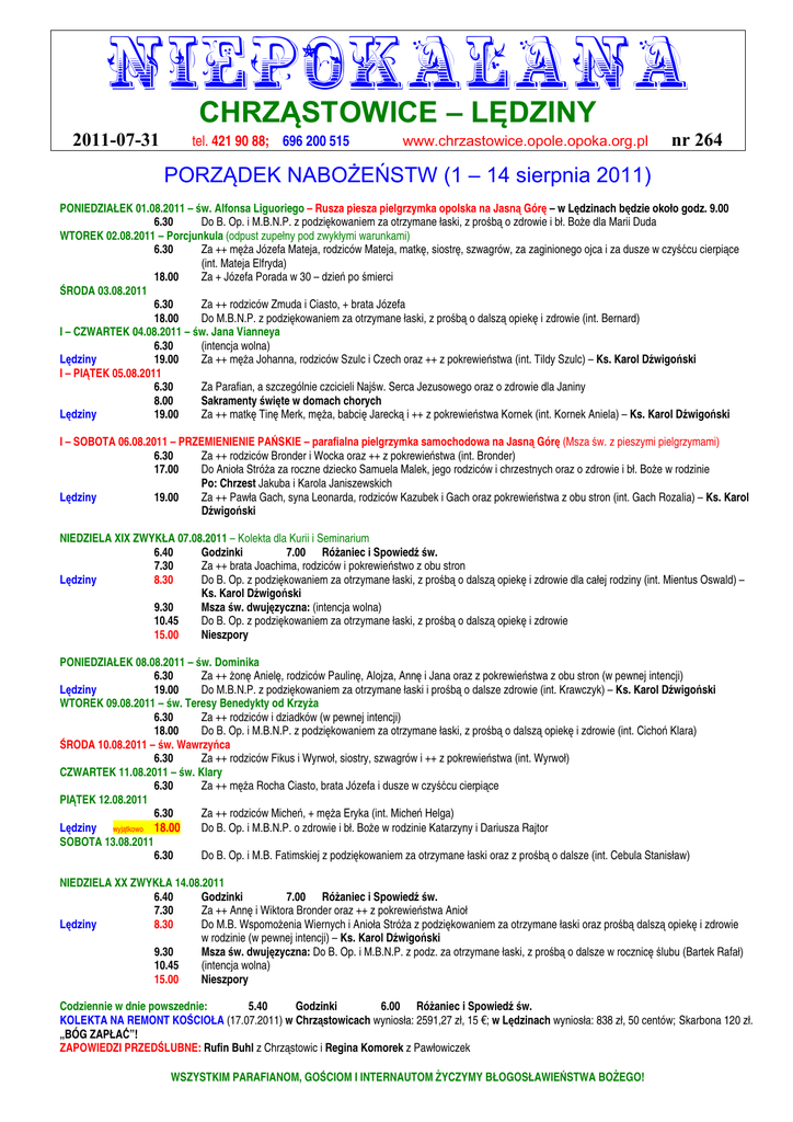 NIEPOKALANA CHRZĄSTOWICE – LĘDZINY 2011-07-31 tel. 421 90 88; 696 200 515 www.chrzastowice.opole.opoka.org.pl nr 264 PORZĄDEK NABOŻEŃSTW (1 – 14 sierpnia 2011) PONIEDZIAŁEK 01.08.2011 – św. Alfonsa Liguoriego – Rusza piesza pielgrzymka opolska na Jasną Górę – w Lędzinach będzie około godz. 9.00 6.30 Do B. Op. i M.B.N.P. z podziękowaniem za otrzymane łaski, z prośbą o zdrowie i bł. BoŜe dla Marii Duda WTOREK 02.08.2011 – Porcjunkula (odpust zupełny pod zwykłymi warunkami) 6.30 Za ++ męŜa Józefa Mateja, rodziców Mateja, matkę, siostrę, szwagrów, za zaginionego ojca i za dusze w czyśćcu cierpiące (int. Mateja Elfryda) 18.00 Za + Józefa Porada w 30 – dzień po śmierci ŚRODA 03.08.2011 6.30 Za ++ rodziców Zmuda i Ciasto, + brata Józefa 18.00 Do M.B.N.P. z podziękowaniem za otrzymane łaski, z prośbą o dalszą opiekę i zdrowie (int. Bernard) I – CZWARTEK 04.08.2011 – św. Jana Vianneya 6.30 (intencja wolna) Lędziny 19.00 Za ++ męŜa Johanna, rodziców Szulc i Czech oraz ++ z pokrewieństwa (int. Tildy Szulc) – Ks. Karol Dźwigoński I – PIĄTEK 05.08.2011 6.30 Za Parafian, a szczególnie czcicieli Najśw. Serca Jezusowego oraz o zdrowie dla Janiny 8.00 Sakramenty święte w domach chorych Lędziny 19.00 Za ++ matkę Tinę Merk, męŜa, babcię Jarecką i ++ z pokrewieństwa Kornek (int. Kornek Aniela) – Ks. Karol Dźwigoński I – SOBOTA 06.08.2011 – PRZEMIENIENIE PAŃSKIE – parafialna pielgrzymka samochodowa na Jasną Górę (Msza św. z pieszymi pielgrzymami) 6.30 Za ++ rodziców Bronder i Wocka oraz ++ z pokrewieństwa (int. Bronder) 17.00 Do Anioła StróŜa za roczne dziecko Samuela Malek, jego rodziców i chrzestnych oraz o zdrowie i bł. BoŜe w rodzinie Po: Chrzest Jakuba i Karola Janiszewskich Lędziny 19.00 Za ++ Pawła Gach, syna Leonarda, rodziców Kazubek i Gach oraz pokrewieństwa z obu stron (int. Gach Rozalia) – Ks. Karol Dźwigoński NIEDZIELA XIX ZWYKŁA 07.08.2011 – Kolekta dla Kurii i Seminarium 6.40 Godzinki 7.00 RóŜaniec i Spowiedź św. 7.30 Za ++ brata Joachima, rodziców i pokrewieństwo z obu stron Lędziny 8.30 Do B. Op. z podziękowaniem za otrzymane łaski, z prośbą o dalszą opiekę i zdrowie dla całej rodziny (int. Mientus Oswald) – Ks. Karol Dźwigoński 9.30 Msza św. dwujęzyczna: (intencja wolna) 10.45 Do B. Op. z podziękowaniem za otrzymane łaski, z prośbą o dalszą opiekę i zdrowie 15.00 Nieszpory PONIEDZIAŁEK 08.08.2011 – św. Dominika 6.30 Za ++ Ŝonę Anielę, rodziców Paulinę, Alojza, Annę i Jana oraz z pokrewieństwa z obu stron (w pewnej intencji) Lędziny 19.00 Do M.B.N.P. z podziękowaniem za otrzymane łaski i prośbą o dalsze zdrowie (int. Krawczyk) – Ks. Karol Dźwigoński WTOREK 09.08.2011 – św. Teresy Benedykty od KrzyŜa 6.30 Za ++ rodziców i dziadków (w pewnej intencji) 18.00 Do B. Op. i M.B.N.P. z podziękowaniem za otrzymane łaski, z prośbą o dalszą opiekę i zdrowie (int. Cichoń Klara) ŚRODA 10.08.2011 – św. Wawrzyńca 6.30 Za ++ rodziców Fikus i Wyrwoł, siostry, szwagrów i ++ z pokrewieństwa (int. Wyrwoł) CZWARTEK 11.08.2011 – św. Klary 6.30 Za ++ męŜa Rocha Ciasto, brata Józefa i dusze w czyśćcu cierpiące PIĄTEK 12.08.2011 6.30 Za ++ rodziców Micheń, + męŜa Eryka (int. Micheń Helga) Lędziny wyjątkowo 18.00 Do B. Op. i M.B.N.P. o zdrowie i bł. BoŜe w rodzinie Katarzyny i Dariusza Rajtor SOBOTA 13.08.2011 6.30 Do B. Op. i M.B. Fatimskiej z podziękowaniem za otrzymane łaski oraz z prośbą o dalsze (int. Cebula Stanisław) NIEDZIELA XX ZWYKŁA 14.08.2011 6.40 Godzinki 7.00 RóŜaniec i Spowiedź św. 7.30 Za ++ Annę i Wiktora Bronder oraz ++ z pokrewieństwa Anioł Lędziny 8.30 Do M.B. WspomoŜenia Wiernych i Anioła StróŜa z podziękowaniem za otrzymane łaski oraz prośbą dalszą opiekę i zdrowie w rodzinie (w pewnej intencji) – Ks. Karol Dźwigoński 9.30 Msza św. dwujęzyczna: Do B. Op. i M.B.N.P. z podz. za otrzymane łaski, z prośbą o dalsze w rocznicę ślubu (Bartek Rafał) 10.45 (intencja wolna) 15.00 Nieszpory Codziennie w dnie powszednie: 5.40 Godzinki 6.00 RóŜaniec i Spowiedź św. KOLEKTA NA REMONT KOŚCIOŁA (17.07.2011) w Chrząstowicach wyniosła: 2591,27 zł, 15 €; w Lędzinach wyniosła: 838 zł, 50 centów; Skarbona 120 zł. „BÓG ZAPŁAĆ”! ZAPOWIEDZI PRZEDŚLUBNE: Rufin Buhl z Chrząstowic i Regina Komorek z Pawłowiczek WSZYSTKIM PARAFIANOM, GOŚCIOM I INTERNAUTOM śYCZYMY BŁOGOSŁAWIEŃSTWA BOśEGO! PORZĄDEK NABOŻEŃSTW (15 – 28 sierpnia 2011) PONIEDZIAŁEK 15.08.2011 – UROCZYSTOŚĆ WNIEBOWZIĘCIA NAJŚW. MARYI PANNY – Kolekta na Wydział Teologiczny UO – Odpust w Szczedrzyku 7.30 Do B. Op. z podziękowaniem za otrzymane łaski oraz z prośbą o zdrowie (int. Cebula Karol) Lędziny 9.00 Do B. Op. z podz. za łaski, z prośbą o dalszą opiekę i zdrowie w int. rodziny Włodarczyk Tadeusz 10.45 Za ++ męŜa Piotra, rodziców z obu stron, siostrę i ++ z pokrewieństwa (int. Panek) 15.00 Nieszpory Maryjne WTOREK 16.08.2011 – Odpust św. Rocha w Dębiu – suma o 11.00 6.30 Za ++ Łucję Jończyk i rodziców Lędziny 19.00 Za + męŜa i ojca Ryszarda Bialucha w 3 – rocznicę śmierci oraz za ++ synów Jana i Józefa, rodziców z obu stron i dusze w czyśćcu cierpiące (int. Adelajdy Bialucha) – Ks. Karol Dźwigoński ŚRODA 17.08.2011 – UROCZYSTOŚĆ ŚW. JACKA 6.30 Za + męŜa Ryszarda Mateja w I – rocznicę śmierci (int. Gabrieli Mateja) CZWARTEK 18.08.2011 6.30 Za ++ rodziców Grund i Klisz, córkę Teresę i męŜa Józefa (int. Klisz) Lędziny 19.00 Za ++ rodziców Marię i Alojzego Sopa – Ks. Karol Dźwigoński PIĄTEK 19.08.2011 6.30 (intencja wolna) 18.00 Za ++ Łucję i Franciszka Malek oraz ++ z pokrewieństwa SOBOTA 20.08.2011 – św. Bernarda 6.30 Za ++ męŜa Jerzego rodziców, teściów i ++ z pokrewieństwa (int. Sowa Alicja) 17.00 – 18.00 OKAZJA DO SPOWIEDZI PRZED ODPUSTEM Lędziny 19.00 Msza św. niedzielna: Za ++ ojca Joac