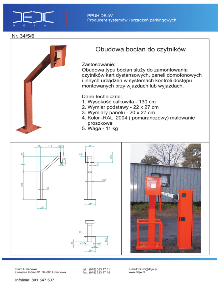 PPUH DEJW Producent systemów i urządzeń parkingowych D E J W Nr. 34/5/6 Obudowa bocian do czytników Zastosowanie: Obudowa typu bocian służy do zamontowania czytników kart dystansowych, paneli domofonowych i innych urządzeń w systemach kontroli dostępu montowanych przy wjazdach lub wyjazdach. Dane techniczne: 1. Wysokość całkowita - 130 cm 2. Wymiar podstawy - 22 x 27 cm 3. Wymiary panelu - 20 x 27 cm 4. Kolor -RAL 2004 ( pomarańczowy) malowanie proszkowe 5. Waga - 11 kg Biuro Limanowa: Łososina Górna 91, 34-600 Limanowa Infolinia: 801 547 537 tel: (018) 333 77 11 fax.: (018) 333 77 16 e-mail; [email protected] www.dejw.pl
