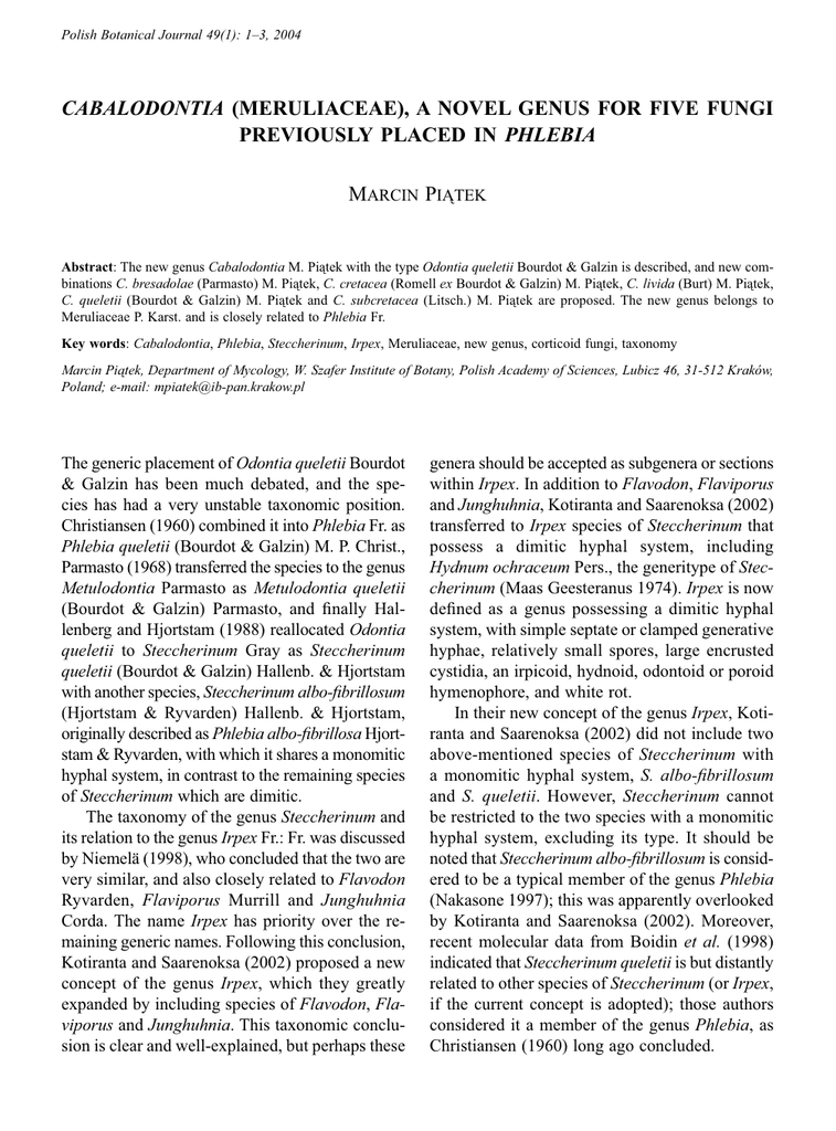 Polish Botanical Journal 49(1): 1–3, 2004 CABALODONTIA (MERULIACEAE), A NOVEL GENUS FOR FIVE FUNGI PREVIOUSLY PLACED IN PHLEBIA MARCIN PIĄTEK Abstract: The new genus Cabalodontia M. Piątek with the type Odontia queletii Bourdot & Galzin is described, and new combinations C. bresadolae (Parmasto) M. Piątek, C. cretacea (Romell ex Bourdot & Galzin) M. Piątek, C. livida (Burt) M. Piątek, C. queletii (Bourdot & Galzin) M. Piątek and C. subcretacea (Litsch.) M. Piątek are proposed. The new genus belongs to Meruliaceae P. Karst. and is closely related to Phlebia Fr. Key words: Cabalodontia, Phlebia, Steccherinum, Irpex, Meruliaceae, new genus, corticoid fungi, taxonomy Marcin Piątek, Department of Mycology, W. Szafer Institute of Botany, Polish Academy of Sciences, Lubicz 46, 31-512 Kraków, Poland; e-mail: [email protected] The generic placement of Odontia queletii Bourdot & Galzin has been much debated, and the species has had a very unstable taxonomic position. Christiansen (1960) combined it into Phlebia Fr. as Phlebia queletii (Bourdot & Galzin) M. P. Christ., Parmasto (1968) transferred the species to the genus Metulodontia Parmasto as Metulodontia queletii (Bourdot & Galzin) Parmasto, and finally Hallenberg and Hjortstam (1988) reallocated Odontia queletii to Steccherinum Gray as Steccherinum queletii (Bourdot & Galzin) Hallenb. & Hjortstam with another species, Steccherinum albo-fibrillosum (Hjortstam & Ryvarden) Hallenb. & Hjortstam, originally described as Phlebia albo-fibrillosa Hjortstam & Ryvarden, with which it shares a monomitic hyphal system, in contrast to the remaining species of Steccherinum which are dimitic. The taxonomy of the genus Steccherinum and its relation to the genus Irpex Fr.: Fr. was discussed by Niemelä (1998), who concluded that the two are very similar, and also closely related to Flavodon Ryvarden, Flaviporus Murrill and Junghuhnia Corda. The name Irpex has priority over the remaining generic names. Following this conclusion, Kotiranta and Saarenoksa (2002) proposed a new concept of the genus Irpex, which they greatly expanded by including species of Flavodon, Flaviporus and Junghuhnia. This taxonomic conclusion is clear and well-explained, but perhaps these genera should be accepted as subgenera or sections within Irpex. In addition to Flavodon, Flaviporus and Junghuhnia, Kotiranta and Saarenoksa (2002) transferred to Irpex species of Steccherinum that possess a dimitic hyphal system, including Hydnum ochraceum Pers., the generitype of Steccherinum (Maas Geesteranus 1974). Irpex is now defined as a genus possessing a dimitic hyphal system, with simple septate or clamped generative hyphae, relatively small spores, large encrusted cystidia, an irpicoid, hydnoid, odontoid or poroid hymenophore, and white rot. In their new concept of the genus Irpex, Kotiranta and Saarenoksa (2002) did not include two above-mentioned species of Steccherinum with a monomitic hyphal system, S. albo-fibrillosum and S. queletii. However, Steccherinum cannot be restricted to the two species with a monomitic hyphal system, excluding its type. It should be noted that Steccherinum albo-fibrillosum is considered to be a typical member of the genus Phlebia (Nakasone 1997); this was apparently overlooked by Kotiranta and Saarenoksa (2002). Moreover, recent molecular data from Boidin et al. (1998) indicated that Steccherinum queletii is but distantly related to other species of Steccherinum (or Irpex, if the current concept is adopted); those authors considered it a member of the genus Phlebia, as Christiansen (1960) long ago concluded. 2 On the basis of molecular analyses of 20 species of Phlebia, Parmasto and Hallenberg (2000) concluded that Phlebia queletii forms a separate clade together with Phlebia bresadolae Parmasto. The other clade is formed by Phlebia s. str. (central group or core), including the type of the generic name, Ph. radiata Fr., plus Ph. acerina Peck, Ph. lindtneri (Pilát) Parmasto, Ph. livida (Pers.: Fr.) Bres., Ph. rufa (Pers.: Fr.) M. P. Christ., Ph. subochracea (Bres.) J. Erikss. & Ryvarden, Ph. subserialis (Bourdot & Galzin) Donk, Ph. tremellosa (Schrad.: Fr.) Burds. & Nakasone and Ph. uda (Fr.: Fr.) Nakasone. Parmasto and Hallenberg (2000) thought that the Ph. bresadolae-Ph. queletii clade might be recognized as a separate genus, but they refrained from formally describing it. They also pointed out the difficulty of characterizing such a genus morphologically. Indeed, both species share many important characteristics with Phlebia s. str., such as ceraceous basidiomes, a monomitic hyphal system, narrowly clavate basidia, and ellipsoidal, non-amyloid basidiospores. Phlebia queletii has an odontoid hymenophore and numerous encrusted cystidia, while Phlebia bresadolae has a tuberculate hymenium and lacks cystidia, but such differences can be observed between other species of Phlebia. However, both Ph. bresadolae and Ph. queletii differ from the central group of Phlebia by having normal nuclear behavior, whereas the core show astatocoenocytic (exceptionally heterocytic or holocoenocytic) behavior, which according to Boidin (1971) characterizes the genus Phlebia. There are also three other species with normal nuclear behavior: Phlebia cretacea (Romell ex Bourdot & Galzin) J. Erikss. & Hjortstam, Phlebia segregata (Bourdot & Galzin) Parmasto and Phlebia subcretacea (Litsch.) M. P. Christ. (Hallenberg 1987, 1990; Wu & Chen 1992). These three species have been also included in the genus Jacksonomyces Jülich (Jülich 1982; Wu & Chen 1992), but the type of this genus, Peniophora phlebioides H. S. Jacks. & Dearden, on the basis of morphological characters and interfertility tests, is considered to be synonym of Phlebia subserialis (Nakasone et al. 1982), which has astatocoenocytic nuclear behavior. Therefore, the genus Jacksonomyces is probably a synonym of Phlebia s. str. POLISH BOTANICAL JOURNAL 49(1). 2004 Taken together, normal nuclear behavior in the above-
