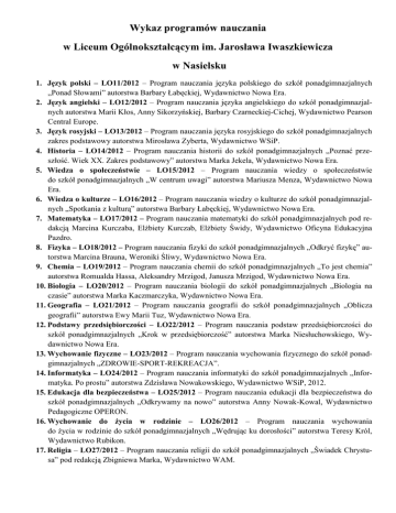 Wykaz programów nauczania w Liceum Ogólnokształcącym im. Jarosława Iwaszkiewicza w Nasielsku 1. Język polski – LO11/2012 – Program nauczania języka polskiego do szkół ponadgimnazjalnych „Ponad Słowami” autorstwa Barbary Łabęckiej, Wydawnictwo Nowa Era. 2. Język angielski – LO12/2012 – Program nauczania języka angielskiego do szkół ponadgimnazjalnych autorstwa Marii Kłos, Anny Sikorzyńskiej, Barbary Czarneckiej-Cichej, Wydawnictwo Pearson Central Europe. 3. Język rosyjski – LO13/2012 – Program nauczania języka rosyjskiego do szkół ponadgimnazjalnych zakres podstawowy autorstwa Mirosława Zyberta, Wydawnictwo WSiP. 4. Historia – LO14/2012 – Program nauczania historii do szkół ponadgimnazjalnych „Poznać przeszłość. Wiek XX. Zakres podstawowy” autorstwa Marka Jekela, Wydawnictwo Nowa Era. 5. Wiedza o społeczeństwie – LO15/2012 – Program nauczania wiedzy o społeczeństwie do szkół ponadgimnazjalnych „W centrum uwagi” autorstwa Mariusza Menza, Wydawnictwo Nowa Era. 6. Wiedza o kulturze – LO16/2012 – Program nauczania wiedzy o kulturze do szkół ponadgimnazjalnych „Spotkania z kulturą” autorstwa Barbary Łabęckiej, Wydawnictwo Nowa Era. 7. Matematyka – LO17/2012 – Program nauczania matematyki do szkół ponadgimnazjalnych pod redakcją Marcina Kurczaba, Elżbiety Kurczab, Elżbiety Świdy, Wydawnictwo Oficyna Edukacyjna Pazdro. 8. Fizyka – LO18/2012 – Program nauczania fizyki do szkół ponadgimnazjalnych „Odkryć fizykę” autorstwa Marcina Brauna, Weroniki Śliwy, Wydawnictwo Nowa Era. 9. Chemia – LO19/2012 – Program nauczania chemii do szkół ponadgimnazjalnych „To jest chemia” autorstwa Romualda Hassa, Aleksandry Mrzigod, Janusza Mrzigod, Wydawnictwo Nowa Era. 10. Biologia – LO20/2012 – Program nauczania biologii do szkół ponadgimnazjalnych „Biologia na czasie” autorstwa Marka Kaczmarczyka, Wydawnictwo Nowa Era. 11. Geografia – LO21/2012 – Program nauczania geografii do szkół ponadgimnazjalnych „Oblicza geografii” autorstwa Ewy Marii Tuz, Wydawnictwo Nowa Era. 12. Podstawy przedsiębiorczości – LO22/2012 – Program nauczania podstaw przedsiębiorczości do szkół ponadgimnazjalnych „Krok w przedsiębiorczość” autorstwa Marka Niesłuchowskiego, Wydawnictwo Nowa Era. 13. Wychowanie fizyczne – LO23/2012 – Program nauczania wychowania fizycznego do szkół ponadgimnazjalnych „ZDROWIE-SPORT-REKREACJA”. 14. Informatyka – LO24/2012 – Program nauczania informatyki do szkół ponadgimnazjalnych „Informatyka. Po prostu” autorstwa Zdzisława Nowakowskiego, Wydawnictwo WSiP, 2012. 15. Edukacja dla bezpieczeństwa – LO25/2012 – Program nauczania edukacji dla bezpieczeństwa do szkół ponadgimnazjalnych „Odkrywamy na nowo” autorstwa Anny Nowak-Kowal, Wydawnictwo Pedagogiczne OPERON. 16. Wychowanie do życia w rodzinie – LO26/2012 – Program nauczania wychowania do życia w rodzinie do szkół ponadgimnazjalnych „Wędrując ku dorosłości” autorstwa Teresy Król, Wydawnictwo Rubikon. 17. Religia – LO27/2012 – Program nauczania religii do szkół ponadgimnazjalnych „Świadek Chrystusa” pod redakcją Zbigniewa Marka, Wydawnictwo WAM.