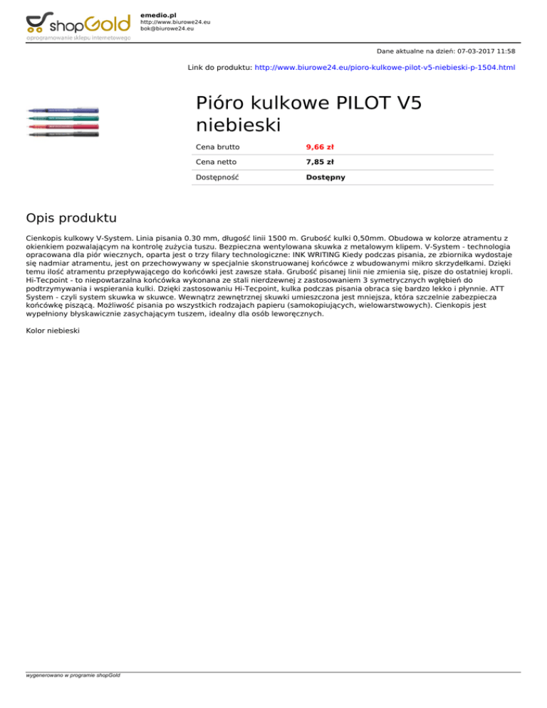 emedio.pl http://www.biurowe24.eu [email protected] Dane aktualne na dzień: 07-03-2017 11:58 Link do produktu: http://www.biurowe24.eu/pioro-kulkowe-pilot-v5-niebieski-p-1504.html Pióro kulkowe PILOT V5 niebieski Cena brutto 9,66 zł Cena netto 7,85 zł Dostępność Dostępny Opis produktu Cienkopis kulkowy V-System. Linia pisania 0.30 mm, długość linii 1500 m. Grubość kulki 0,50mm. Obudowa w kolorze atramentu z okienkiem pozwalającym na kontrolę zużycia tuszu. Bezpieczna wentylowana skuwka z metalowym klipem. V-System - technologia opracowana dla piór wiecznych, oparta jest o trzy filary technologiczne: INK WRITING Kiedy podczas pisania, ze zbiornika wydostaje się nadmiar atramentu, jest on przechowywany w specjalnie skonstruowanej końcówce z wbudowanymi mikro skrzydełkami. Dzięki temu ilość atramentu przepływającego do końcówki jest zawsze stała. Grubość pisanej linii nie zmienia się, pisze do ostatniej kropli. Hi-Tecpoint - to niepowtarzalna końcówka wykonana ze stali nierdzewnej z zastosowaniem 3 symetrycznych wgłębień do podtrzymywania i wspierania kulki. Dzięki zastosowaniu Hi-Tecpoint, kulka podczas pisania obraca się bardzo lekko i płynnie. ATT System - czyli system skuwka w skuwce. Wewnątrz zewnętrznej skuwki umieszczona jest mniejsza, która szczelnie zabezpiecza końcówkę piszącą. Możliwość pisania po wszystkich rodzajach papieru (samokopiujących, wielowarstwowych). Cienkopis jest wypełniony błyskawicznie zasychającym tuszem, idealny dla osób leworęcznych. Kolor niebieski wygenerowano w programie shopGold Powered by TCPDF (www.tcpdf.org)