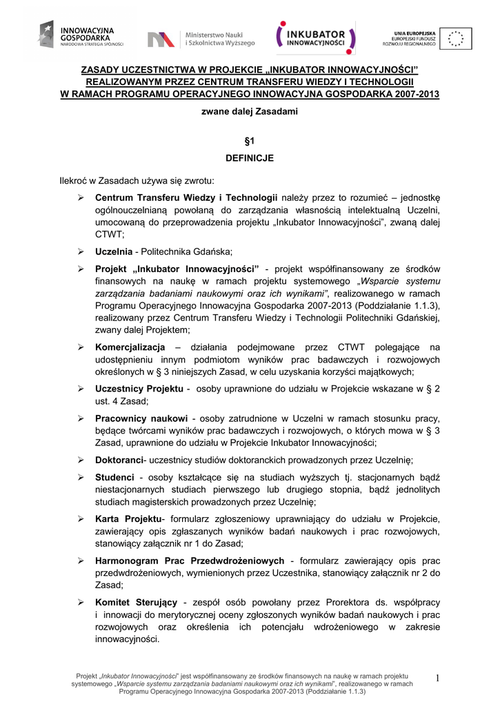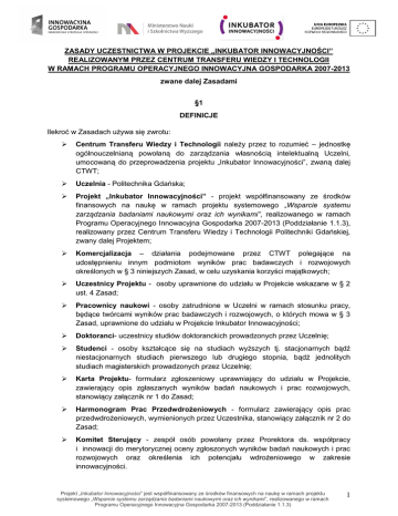 ZASADY UCZESTNICTWA W PROJEKCIE „INKUBATOR INNOWACYJNOŚCI” REALIZOWANYM PRZEZ CENTRUM TRANSFERU WIEDZY I TECHNOLOGII W RAMACH PROGRAMU OPERACYJNEGO INNOWACYJNA GOSPODARKA 2007-2013 zwane dalej Zasadami §1 DEFINICJE Ilekroć w Zasadach używa się zwrotu: Centrum Transferu Wiedzy i Technologii należy przez to rozumieć – jednostkę ogólnouczelnianą powołaną do zarządzania własnością intelektualną Uczelni, umocowaną do przeprowadzenia projektu „Inkubator Innowacyjności”, zwaną dalej CTWT; Uczelnia - Politechnika Gdańska; Projekt „Inkubator Innowacyjności” - projekt współfinansowany ze środków finansowych na naukę w ramach projektu systemowego „Wsparcie systemu zarządzania badaniami naukowymi oraz ich wynikami”, realizowanego w ramach Programu Operacyjnego Innowacyjna Gospodarka 2007-2013 (Poddziałanie 1.1.3), realizowany przez Centrum Transferu Wiedzy i Technologii Politechniki Gdańskiej, zwany dalej Projektem; Komercjalizacja – działania podejmowane przez CTWT polegające na udostępnieniu innym podmiotom wyników prac badawczych i rozwojowych określonych w § 3 niniejszych Zasad, w celu uzyskania korzyści majątkowych; Uczestnicy Projektu - osoby uprawnione do udziału w Projekcie wskazane w § 2 ust. 4 Zasad; Pracownicy naukowi - osoby zatrudnione w Uczelni w ramach stosunku pracy, będące twórcami wyników prac badawczych i rozwojowych, o których mowa w § 3 Zasad, uprawnione do udziału w Projekcie Inkubator Innowacyjności; Doktoranci- uczestnicy studiów doktoranckich prowadzonych przez Uczelnię; Studenci - osoby kształcące się na studiach wyższych tj. stacjonarnych bądź niestacjonarnych studiach pierwszego lub drugiego stopnia, bądź jednolitych studiach magisterskich prowadzonych przez Uczelnię; Karta Projektu- formularz zgłoszeniowy uprawniający do udziału w Projekcie, zawierający opis zgłaszanych wyników badań naukowych i prac rozwojowych, stanowiący załącznik nr 1 do Zasad; Harmonogram Prac Przedwdrożeniowych - formularz zawierający opis prac przedwdrożeniowych, wymienionych przez Uczestnika, stanowiący załącznik nr 2 do Zasad; Komitet Sterujący - zespół osób powołany przez Prorektora ds. współpracy i innowacji do merytorycznej oceny zgłoszonych wyników badań naukowych i prac rozwojowych oraz określenia ich potencjału wdrożeniowego w zakresie innowacyjności. Projekt „Inkubator Innowacyjności” jest współfinansowany ze środków finansowych na naukę w ramach projektu systemowego „Wsparcie systemu zarządzania badaniami naukowymi oraz ich wynikami”, realizowanego w ramach Programu Operacyjnego Innowacyjna Gospodarka 2007-2013 (Poddziałanie 1.1.3) 1 §2 POSTANOWIENIA OGÓLNE 1. Niniejsze Zasady określają warunki uczestnictwa w Projekcie, w szczególności etap zgłaszania wyników badań naukowych i prac rozwojowych osób uprawnionych do udziału w Projekcie. 2. Projekt jest współfinansowany ze środków finansowanych na naukę w ramach projektu systemowego „Wsparcie systemu zarządzania badaniami naukowymi oraz ich wynikami”, realizowanego w ramach Programu Operacyjnego Innowacyjna Gospodarka 2007-2013. 3. Podmiotem kierującym Projektem jest CTWT, które zapewnia jego kompleksową obsługę organizacyjno - administracyjną. 4. W Projekcie mogą brać udział: pracownicy naukowi Uczelni, doktoranci, studenci. 5. Głównym celem Projektu jest promocja i komercjalizacja wyników badań naukowych i prac rozwojowych jego uczestników oraz nawiązanie współpracy z otoczeniem biznesowym uczelni. 6. Realizacja Projektu powinna przyczynić się do promocji osiągnięć naukowych, zwiększenia ich wpływu na rozwój innowacyjności oraz wzmocnienia współpracy między środowiskiem naukowym a otoczeniem biznesowym. §3 WYNIKI BADAŃ NAUKOWYCH I PRAC ROZWOJOWYCH ZGŁASZANE DO PROJEKTU 1. Przedmiotem zgłoszenia do Projektu są wszelkie gospodarczo użyteczne wyniki badań naukowych i prac rozwojowych wymienione w § 2 Regulaminu zarządzania i komercjalizacji własności intelektualnej na Politechnice Gdańskiej, które nie zostały dotychczas skomercjalizowane. 2. Przedmiotem zgłoszenia, o którym mowa w ust. 1 mogą być wyniki badań, co do których prawa własności intelektualnej należą do Uczelni w całości lub części o ile Uczelnia uprawniona jest do ich komercjalizacji w drodze umowy z pozostałymi uprawnionymi. §4 OFEROWANE OBSZARY WSPARCIA W RAMACH PROJEKTU W ramach Projektu oferowane jest wsparcie prac B+R w następujących obszarach: 1. Promocja oferty technologicznej oraz udział w wystawach i targach typu „science to business” - w związku z poszukiwaniem podmiotów zainteresowanych wdrożeniem wyników badań i prac rozwojowych oferuje się zakwalifikowanym uczestnikom Projektu udział w targach typu „science to business” oraz promocję oferty technologicznej. Projekt „Inkubator Innowacyjności” jest współfinansowany ze środków finansowych na naukę w ramach projektu systemowego „Wsparcie systemu zarządzania badaniami naukowymi oraz ich wynikami”, realizowanego w ramach Programu Operacyjnego Innowacyjna Gospodarka 2007-2013 (Poddziałanie 1.1.3) 2 2. Wsparcie komercjalizacji wyników prac B+R - obejmuje przygotowanie m. in. analiz potencjału rynkowego wynalazków, analizy ich gotowości wdrożeniowej, a także wyceny praw własności przemysłowej. 3. Badania rynku w celu projektowania prac B+R – obejmuje m. in. analizy potrzeb rynku służące wyborowi tematów badań naukowych lub prac rozwojowych oraz badanie stanu techniki przed rozpoczęciem badań lub prac; analizy możliwości uzyskania ochrony patentowej oraz możliwości komercjalizacji wyników badań naukowych i prac rozwojowych przed ich opublikowaniem 4. Wsparcie finansowania prac przedwdrożeniowych - uczestnicy Projektu mogą skorzystać ze wsparcia finansowego pozwalającego na prowadzenie prac przedwdrożeniowych, w tym dodatkowych testów laboratoryjnych lub dostoso