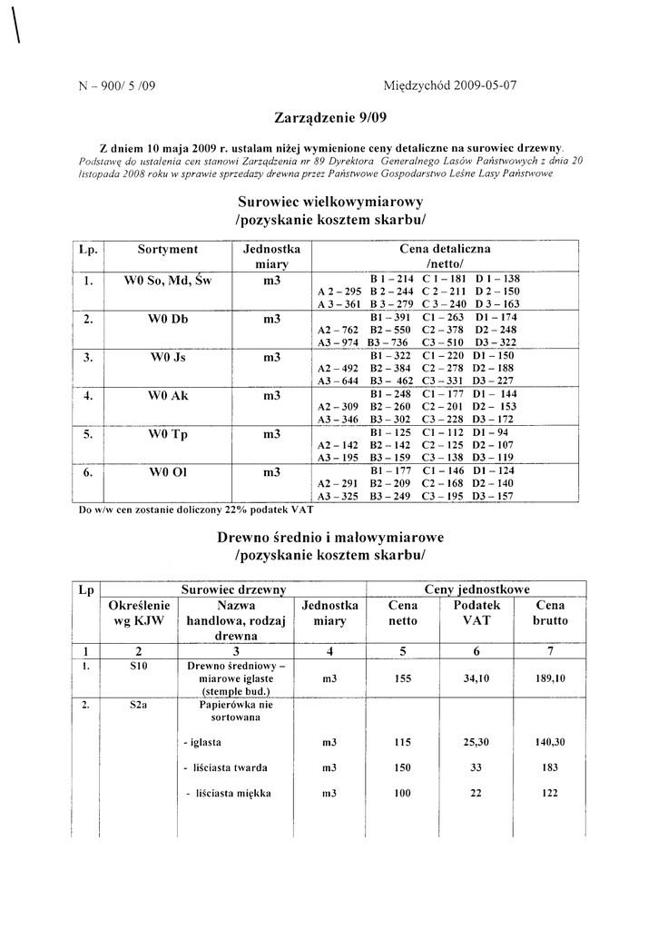 \ N-900/s/09 Międzychod 2009-05-07 Zarządzenie 9/09 Z dniem l0 maja 2009 r. ustalam niżejwymienioneceny deta|icznena surowiec drzewny. Podstawę do ustąlenia cen stanowi Zarządzenia nr 89 Dyrektora Generalnego Lasów po,l,'|yyąwych z dnią 20 listopada 2008 rokuw sprawie sprzedazy drewna przez Państwowe Gospodarstwo Leśne Lasy Państu,owe' Su rowiec wielkowymia rowy /pozyskaniekosztemskarbu/ Lp. SorĘment Jednostka miary I W0 So. Md, Sw m3 f. w0 Db m3 W0 Js m3 4. w0 Ak m3 5. W0 Tp m3 6. w0 0l m3 1 J. A2-295 A3-361 A2-762 A3-974 A2 - 492 ^3-644 42-309 ^3-346 A2-t42 43-195 Af-291 A3 -325 Cena detaliczna lnettol Bl-214 Cl-181 Dl-138 Bf -244 Cf -fll D2-150 B3-219 C3-240 D3-163 Br-391 Cr-263 Dt-174 82-550 CZ-378 D2-248 B.3-736 C3-510 D3-3f2 Br -3f2 Cl -f20 Dl - 150 82 -384 C2 -278 D2 - 188 B.3- 462 C3-331 D3-f27 B 1- f 4 8 C r - 1 7 1 D t - 1 4 4 B2-260 C2-201 D2- r53 83-302 C3-228 D3-l1Z 81-125 Cl - t2 Dt-94 B 2 - 1 4 2 C 2 - t s D2 - t07 8 3 - 1 5 9 C 3 - 38 D 3 - l 1 9 B l - 1 7 7 C r - 46 Dl - t24 B 2 - 2 0 9 C 2 - ó8 Df - 140 83 -249 C3 - 9 5 D3 - 157 Do rv/wcen zostanie doliczony 22oh podatek VAT Drewno średnioi małowymiarowe /pozyskaniekosztemskarbu/ Lp I I 2. Surowiec drzewnv Nazwa określenie wg KJW handlowa, rodzaj drewna f sl0 S2a Ceny iednostkowe Podatek Cena VAT brutto Jednostka miary Cena netto 4 5 6 m3 t55 34,10 18 9 , 10 - iglasta m3 ll5 25,30 140,30 - | i Ś c i a s t at w a r d a m3 150 - l i ś c i a s tm a ię|<ka m3 r00 - J D r e w n o ś r e d n i o w -y miaroweiglaste ( s t e m o l eb u d . ) Papierówka nie sortowana 7 r83 ,,) t22 s2b 4. s3b 5. S4 o. S 3 a ,M l Papierów|<a sortowana - iglasta m3 r68 36'9ó f04,96 - Iiściasta m3 t75 38,50 213,50 Zerdzie gospodarcze I . I I l < | a s sar u b o Ś c i Drewno opalowe - iglaste m3 159 34,98 r 93,98 m3 100 7 107 - | i ś c i a s ttew a r d e m3 r26 8,82 134,82 | i ś c i a s tm e i ę k k i e- o | m3 r00 1 107 - |iściaste miękkie lpozostalel Zerdzie i drobnicado p r z e r o b u ,i g l . ' I i ś ć . m3 74 5,18 79,18 m3 94 20,68 I r 4,68 Drewno średnioi małowvm arowe /pozyskanie kosztem nabywcy/" 7. S4 8. vtf 9. M2 10. Stroisz Drewno opalowe - iglaste m3 54 3,78 57,78 - l i ś c i a s ttew a r d e m3 10 4,90 74 , 9 0 - | i ś c i a s tm e i ę k k i eo | m3 5,t 3,78 57,78 - l i ś c i a s tm e iękkie /pozostalel Drobnica opalowa igl.Iiść. m3 39 )11 11.73 m3 z4 I,68 25,68 mJ 4 0,28 4,f8 mp 50 It 6r Drobnisaopalowaigl. przy Iiść. p o r z ą d l t o w a n i up o w . Rb.II iIII przypadkachza zgodą Nadleśniczego W indywidLraInych mozliwa jest sprzedazsortymentównie ujętychw/w przypadkach cenniku' W takich cena tych sortymentÓwzostanieustalonaw oparciu o ZarządzenieDyrektora g e n e r a l n e g8o9 z d n i a 2 0 l i s t o p a d a2 0 0 8 r . W przypadkudrewnaopałowego,w uzasadnionychsytuacjachtrudności ze zbytem. Nadleśniczymoze obnizyć cenędetalicznąna ten sortymęnt. SprzedaŻsortymentuS2a Db, Ak > 2,5mb (słupkigrodzeniowe)tylko za zgodąNadleŚniczegopo zaspokojeniu potrzebwłasnychNadIęŚnictwa' Zarządzenie niniejsze anuluje Zarzqdzenie NadleśniczegN o a d | e ś n i c t w aM i ę d z y c h ó d n r 2 1 0 9 z d n i a 2 s t v c z n i a2 0 0 9 r o h u . N"dIó!;;'.;) m g r i n ż .'::,,"'';;; ' SprzedazSLlrowca53a i Ml dotyczy tylko pozostałości tych sortymentówpo zakoI.lczonym wywozie _ spI.zedaz za zgodąNadIeŚniczego . S a r n o w y r ó bn i e l n o z e d o t y c z y Ćc z y n n o Ś c iz w l ę a n y c h z m e c h a n i c z nś ą c i n kd ąr z e w .