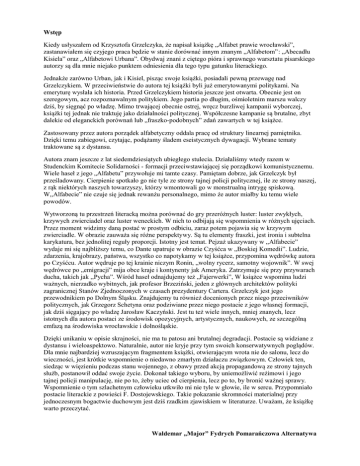 Wstęp Kiedy usłyszałem od Krzysztofa Grzelczyka, że napisał książkę „Alfabet prawie wrocławski”, zastanawiałem się czyjego praca będzie w stanie dorównać innym znanym „Alfabetom”: „Abecadłu Kisiela” oraz „Alfabetowi Urbana”. Obydwaj znani z ciętego pióra i sprawnego warsztatu pisarskiego autorzy są dla mnie niejako punktem odniesienia dla tego typu gatunku literackiego. Jednakże zarówno Urban, jak i Kisiel, pisząc swoje książki, posiadali pewną przewagę nad Grzelczykiem. W przeciwieństwie do autora tej książki byli już emerytowanymi politykami. Na emeryturę wysłała ich historia. Przed Grzelczykiem historia jeszcze jest otwarta. Obecnie jest on szeregowym, acz rozpoznawalnym politykiem. Jego partia po długim, ośmioletnim marszu walczy dziś, by sięgnąć po władzę. Mimo trwającej obecnie ostrej, wręcz burzliwej kampanii wyborczej, książki tej jednak nie traktuję jako działalności politycznej. Współczesne kampanie są brutalne, zbyt dalekie od eleganckich porównań lub „fraszko-podobnych” zdań zawartych w tej książce. Zastosowany przez autora porządek alfabetyczny oddala pracę od struktury linearnej pamiętnika. Dzięki temu zabiegowi, czytając, podążamy śladem eseistycznych dywagacji. Wybrane tematy traktowane są z dystansu. Autora znam jeszcze z lat siedemdziesiątych ubiegłego stulecia. Działaliśmy wtedy razem w Studenckim Komitecie Solidarności - formacji przeciwstawiającej się porządkowi komunistycznemu. Wiele haseł z jego „Alfabetu” przywołuje mi tamte czasy. Pamiętam dobrze, jak Grzelczyk był prześladowany. Cierpienie spotkało go nie tyle ze strony tajnej policji politycznej, ile ze strony naszej, z rąk niektórych naszych towarzyszy, którzy wmontowali go w monstrualną intrygę spiskową. W,,Alfabecie” nie czuje się jednak rewanżu personalnego, mimo że autor miałby ku temu wiele powodów. Wytworzoną tu przestrzeń literacką można porównać do gry przeróżnych luster: luster zwykłych, krzywych zwierciadeł oraz luster weneckich. W nich to odbijają się wspomnienia w różnych ujęciach. Przez moment widzimy daną postać w prostym odbiciu, zaraz potem pojawia się w krzywym zwierciadle. W obrazie zauważa się różne perspektywy. Są tu elementy fraszki, jest ironia i subtelna karykatura, bez jednolitej reguły proporcji. Istotny jest temat. Pejzaż ukazywany w ,,Alfabecie” wydaje mi się najbliższy temu, co Dante upatruje w obrazie Czyśćca w „Boskiej Komedii”. Ludzie, zdarzenia, krajobrazy, państwa, wszystko co napotykamy w tej książce, przypomina wędrówkę autora po Czyśćcu. Autor wędruje po tej krainie niczym Ronin, „wolny rycerz, samotny wojownik”. W swej wędrówce po „emigracji” mija obce kraje i kontynenty jak Ameryka. Zatrzymuje się przy przywarach ducha, takich jak ,,Pycha”. Wśród haseł odnajdujemy też „Fajerwerki”, W książce wspomina ludzi ważnych, nierzadko wybitnych, jak profesor Brzeziński, jeden z głównych architektów polityki zagranicznej Stanów Zjednoczonych w czasach prezydentury Cartera. Grzelczyk jest jego przewodnikiem po Dolnym Śląsku. Znajdujemy tu również docenionych przez niego przeciwników politycznych, jak Grzegorz Schetyna oraz podziwiane przez niego postacie z jego własnej formacji, jak dziś sięgający po władzę Jarosław Kaczyński. Jest tu też wiele innych, mniej znanych, lecz istotnych dla autora postaci ze środowisk opozycyjnych, artystycznych, naukowych, ze szczególną emfazą na środowiska wrocławskie i dolnośląskie. Dzięki unikaniu w opisie skrajności, nie ma tu patosu ani brutalnej degradacji. Postacie są widziane z dystansu i wieloaspektowo. Naturalnie, autor nie kryje przy tym swoich konserwatywnych poglądów. Dla mnie najbardziej wzruszającym fragmentem książki, otwierającym wrota nie do salonu, lecz do wieczności, jest krótkie wspomnienie o niedawno zmarłym działaczu związkowym. Człowiek ten, siedząc w więzieniu podczas stanu wojennego, z obawy przed akcją propagandową ze strony tajnych służb, postanowił oddać swoje życie. Dokonał takiego wyboru, by uniemożliwić reżimowi i jego tajnej policji manipulację, nie po to, żeby uciec od cierpienia, lecz po to, by bronić ważnej sprawy. Wspomnienie o tym szlachetnym człowieku utkwiło mi nie tyle w głowie, ile w sercu. Przypomniało postacie literackie z powieści F. Dostojewskiego. Takie pokazanie skromności materialnej przy jednoczesnym bogactwie duchowym jest dziś rzadkim zjawiskiem w literaturze. Uważam, że książkę warto przeczytać. Waldemar „Major” Fydrych Pomarańczowa Alternatywa