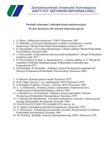 Zachodniopomorski Uniwersytet Technologiczny INSTYTUT INŻYNIERII MATERIAŁOWEJ Powłoki ochronne i zabezpieczenia antykorozyjne Wykaz literatury do ćwiczeń laboratoryjnych 1. A. Śliwa: „Obliczenia chemiczne”, PWN; Warszawa 1987 2. Z. Jabłoński: „Ćwiczenia laboratoryjne z chemii i rachunkowe z chemii technicznej”; Skrypt Politechniki Szczecińskiej; Szczecin 1991 3. E. Jagodzińska: „Ćwiczenia laboratoryjne z chemii ogólnej” Skrypt Politechniki Szczecińskiej; Szczecin 2005 4. A. Korczyński: „Laboratorium chemiczne dla mechaników”; Skrypt Politechniki Łódzkiej; Łódź 1977 5. H. Przewłodzka, H. Bala, A. Banaszkiewicz: „Chemia ogólna, cz. I” Skrypt dla studentów Wydziału Metalurgicznego, Politechnika Częstochowska, Częstochowa 1977 6. M. Kamiński, B. Ważyński: „Podstawy chemii dla inżynierii materiałowej” Oficyna Wydawnicza Politechniki Warszawskiej; Warszawa 2004 7. S. Mrowec, Korozja gazowa metali, Katowice 1975 8. H.H. Uhlig, Korozja i jej zapobieganie, WNT Warszawa 1976 9. G.Wranglen, Podstawy korozji i ochrony, WNT Warszawa 1985 10. L. A. Dobrzański, Podstawy nauki o materiałach i metaloznawstwo, Wydawnictwo Politechniki Śląskiej, Gliwice 1993 11. J. Baszkiewicz, M. Kamiński, Podstawy korozji materiałów, Oficyna Wydawnicza Politechniki Warszawskiej, Warszawa 1997 12. J. Głuszek, M. Danielewski, Ćwiczenia rachunkowe z korozji i ochrony przed korozją, Politechnika Wrocławska, Wrocław 1990 13. PN-EN ISO 9227:2007; PN-H-04603:1976 (do ćw. 6). 14. A. Appen, Żaroodporne powłoki nieorganiczne, Warszawa 1970 15. T. Hryniewicz, Technologia powierzchni i powłok, Wydawnictwo Uczelniane Politechniki Koszalińskiej, Koszalin 1999 16. M. Pourbaix, Wykłady z korozji elektrochemicznej, PWN, Warszawa 1978.