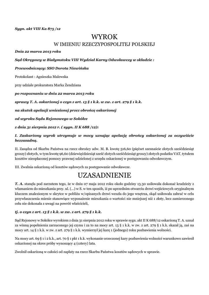 Sygn. akt VIII Ka 875 /12 WYROK W IMIENIU RZECZYPOSPOLITEJ POLSKIEJ Dnia 22 marca 2013 roku Sąd Okręgowy w Białymstoku VIII Wydział Karny Odwoławczy w składzie : Przewodniczący: SSO Dorota Niewińska Protokolant : Agnieszka Malewska przy udziale prokuratora Marka Żendziana po rozpoznaniu w dniu 22 marca 2013 roku sprawy T. A. oskarżonej o czyn z art. 13 § 1 k.k. w zw. z art. 279 § 1 k.k. na skutek apelacji wniesionej przez obrońcę oskarżonej od wyroku Sądu Rejonowego w Sokółce z dnia 31 sierpnia 2012 r. ( sygn. II K 688 /12): I. Zaskarżony wyrok utrzymuje w mocy uznając apelację obrońcy oskarżonej za oczywiście bezzasadną. II. Zasądza od Skarbu Państwa na rzecz obrońcy adw. M. B. kwotę 516,60 (pięćset szesnaście złotych sześćdziesiąt groszy) złotych, w tym kwotę 96,60 (dziewięćdziesiąt sześć złotych sześćdziesiąt groszy) złotych podatku VAT, tytułem kosztów nieopłaconej pomocy prawnej udzielonej z urzędu oskarżonej w postępowaniu odwoławczym. III. Zwalnia oskarżoną od kosztów sądowych za postępowanie odwoławcze. UZASADNIENIE T. A. stanęła pod zarzutem tego, że w dniu 07 maja 2012 roku około godziny 13.30 usiłowała dokonać kradzieży z włamaniem do mieszkania przy. ul. (...) w S. w ten sposób, iż po uprzednim otwarciu drzwi wejściowych oryginalnym kluczem znalezionym w skrytce w pobliżu w/opisanych drzwi weszła do jego wnętrza, skąd usiłowała zabrać w celu przywłaszczenia mienie stanowiące wyposażenie mieszkania o wartości nie mniejszej niż 1 złoty, lecz zamierzonego celu nie dokonała z uwagi na powrót właścicieli, tj. o czyn z art. 13 § 1 k.k. w zw. z art. 279 § 1 k.k. Sąd Rejonowy w Sokółce wyrokiem z dnia 31 sierpnia 2012 roku w sprawie sygn. akt II K 688/12 oskarżoną T. A. uznał za winną popełnienia zarzuconego jej czynu i za to na mocy art. 13 § 1 k.k. w zw. z art. 279 § 1 k.k. skazał ją, zaś na mocy art. 14 § 1 k.k. w zw. z art. 279 § 1 k.k. wymierzył jej karę 1 (jednego) roku pozbawienia wolności. Na mocy art. 69 § 1 i 2 k.k., art. 70 § 1 pkt 1 k.k. wykonanie orzeczonej kary pozbawienia wolności warunkowo zawiesił oskarżonej na okres próby wynoszący 4 (cztery) lata. Zwolnił oskarżoną w całości od zapłaty na rzecz Skarbu Państwa kosztów sądowych w sprawie. Zasądził od Skarbu Państwa na rzecz adwokata M. B. kwotę 664,20 (sześciuset sześćdziesięciu czterech zł 20/100 gr) złotych, w tym kwotę 124,20 (stu dwudziestu czterech zł 20/100 gr) złotych jako kwotę należnego podatku od towarów i usług, tytułem wynagrodzenia za obronę z urzędu oskarżonej. Powyższy wyrok na podstawie art. 444 k.p.k. i art. 425 § 1 – 3 k.p.k. zaskarżył obrońca oskarżonej w całości, zarzucając mu: 1) obrazę przepisów prawa materialnego, tj. art. 279 k.k. poprzez przypisanie oskarżonej usiłowania przestępstwa kierunkowego, pomimo braku jakiegokolwiek dowodu uzasadniającego przyjęcie, iż oskarżona wchodząc do mieszkania pokrzywdzonych pod ich nieobecność działała w celu przywłaszczenia mienia ruchomego; 2) błąd w ustaleniach faktycznych przyjętych za podstawę orzeczenia, mogący mieć wpływ na treść tego wyroku, a polegający na niesłusznym przyjęciu wbrew ujawnionemu materiałowi dowodowemu, iż oskarżona w dniu 07 maja 2012 roku w celu wejścia do domu pokrzywdzonych posłużyła się znalezionym uprzednio w skrytce kluczem, pomimo braku jakichkolwiek dowodów wskazujących na fakt bezpośredniego posługiwania się przez oskarżoną przedmiotowym kluczem, co skutkowało przyjęciem przez Sąd I instancji, iż oskarżona wypełniła swoim działaniem znamiona usiłowania popełnienia kradzieży z włamaniem. Na podstawie art. 427 § 1 k.p.k. i art. 437 § 2 k.p.k. obrońca T. A. wniósł o zmianę wyroku poprzez zmianę kwalifikacji prawnej przypisanego oskarżonej przestępstwa z art. 279 § 1 k.k. na artykuł 193 k.k. i wymierzenie oskarżonej za przedmiotowy czyn kary grzywny, ewentualnie o uchylenie wyroku w całości i przekazanie sprawy do ponownego rozpoznania Sądowi I instancji. Sąd Okręgowy zważył, co następuje: W świetle zgromadzonego materiału dowodowego żadne racjonalne powody nie przemawiały za uwzględnieniem wniesionego środka odwoławczego, który uznany został za oczywiście bezzasadny. Ani bowiem podniesione w apelacji zarzuty, ani przytoczona na ich poparcie argumentacja, nie przekonała Sądu odwoławczego o istnieniu przesłanek procesowych, czy celowościowych, pozwalających na uwzględnienie zgłoszonych w apelacji wniosków o zmianę zaskarżonego wyroku poprzez przypisanie T. A. przestępstwa z art. 193 k.k., czy też uchylenie zaskarżonego wyroku w całości i przekazanie sprawy do ponownego rozpoznania Sądowi I instancji. Mając na uwadze, że autor apelacji podniósł jednocześnie zarzuty obrazy przepisów prawa materialnego i błędu w ustaleniach faktycznych konieczne jest poczynienie kilku uwag o charakterze ogólnym odnoszących się do przyjętego sposobu formułowania zarzutów. Z punktu widzenia kontroli odwoławczej istotne jest bowiem rozróżnianie pierwotnych źródeł uchybienia i ich następstw. Należy stanowczo podkreślić, iż nie ma obrazy prawa materialnego, gdy wada orzeczenia jest wynikiem błędnych ustaleń faktycznych. Tylko niewłaściwa subsumcja niekwestionowanych ustaleń faktycznych pod konkretny przepis prawa materialnego daje podstawę do formułowania zarzutu obrazy prawa materialnego. Jeżeli więc skarżący kwestionuje ustalenia faktyczne, które Sąd Rejonowy włączył do podstawy faktycznej swojego wyroku, co dotyczy w szczególności posłużenia się przez T. A. znalezionym uprzednio w skrytce kluczem oraz zamiaru z jakim działała oskarżona, to kwestionowanie orzeczenia powinno opierać się na podstawie odwoławczej wskazanej w art. 438 pkt 3 k.p.k., tzn. dotyczyć błędu w ustaleniach faktycznych przyjętych za podstawę orzeczenia, jeżeli mógł o