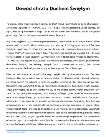 Dowód chrztu Duchem Świętym Ta grupa, która może słuchać i słucha, co Duch mówi i przyjmuje do tego objawienie, jest grupą, opisaną w 1. Korynt. 2, 6 – 16. To są ci, którzy posiadają Ducha Bożego. To są ci, którzy są narodzeni z Boga. Oni są we chrzczeni do ciała Pana Jezusa Chrystusa przez Jego Ducha. Oni są ochrzczeni Duchem Świętym. Aby dalej wyjaśnić to, co właśnie powiedziałem, i aby również użyć miejsc Pisma, które mamy mieć na myśli, kiedy mówimy o tym, kim są ci, którzy są ochrzczeni Duchem Świętym, spójrzmy, co mówi Jezus w ew. Jana 6, 45: „Napisano bowiem u proroków: 1 będą WSZYSCY pouczeni przez Boga.” Zwróćmy się jednak do Izajasza 54, 13, skąd to jest wzięte, i tutaj czytamy. „A wszystkie twoje dzieci będą wyuczone przez Pana. ” Ci WSZYSCY od Boga to DZIECI Boże. Zatem jako dowód tego, że ktoś jest prawdziwym dzieckiem Bożym, (na którego zstąpił Duch i zamieszkał w nim), jest znowu przedłożone to, że ktoś jest nauczany w Słowie przez Ducha świętego. Obecnie zaczynacie rozumieć, dlaczego języki nie są dowodem chrztu Duchem Świętym. Nie jest powiedziane w żadnym wieku, że „kto ma język, niechaj mówi to, co mówi Duch.” To odkłada języki, ich wykład, proroctwo itd. jako dowód na bok. Dowodem jest SŁUCHANIE tego, co mówi Duch. Duch mówi. Tak, Duch święty naucza. Jezus powiedział, że to jest dokładnie to, co on będzie czynił, kiedy przyjdzie. Ew. Jana 14, 26: „Lecz Pocieszyciel, Duch święty, którego Ojciec pośle w imieniu moim, nauczy was wszystkiego i przypomni wam wszystko, co wam powiedziałem. ” A to jest właśnie to, co się stało. W ten właśnie sposób zostały napisane Ewangelie. Tym ludziom przypomniały się w ich myślach dzięki Duchowi świętemu dokładnie te Słowa, które wypowiedział Jezus. Dlatego te ewangelie są tak wierne. One są doskonale. Lecz Duch nie tylko przypomniał im wszystkie te sprawy, lecz dale j nauczał ich te j prawdy, którą oni już znali. Oto, w jaki sposób Paweł otrzymał swoje objawienie. on powiedział odnośnie tego : „A oznajmiam wam, bracia, że ewangelia, którą ja zwiastowałem, nie jest pochodzenia ludzkiego ; albowiem nie otrzymałem jej od człowieka, ani mnie jej WWW.POSELSTWO.VXM.PL 1 nie nauczono (przez człowieka), lecz otrzymałem ją przez objawienie Jezusa Chrystusa. ” Gal. 1, 11 – 12. on był nauczany przez Ducha świętego. Pewnego dnia, kiedy Jezus był na ziemi, pewien poważany człowiek przyszedł do Niego w odwiedziny. Ten mężczyzna powiedział : „Rabbi, my wiemy, że jesteś nauczycielem, posłanym od Boga”. Wy jednak zauważycie, że Jezus mu przerwał. On zwrócił się do Nikodema, a te Słowa, które on powiedział, można powiedzieć innymi słowy w ten sposób: „Ja NIE jestem nauczycielem. Ja jestem Barankiem Ofiarnym za grzech. Ja daję możliwość do Znowuzrodzenia przez Mego Ducha. Ale oto przychodzi Ktoś, Kto jest Nauczycielem. Jest to Duch święty. ‚, Kiedy Jezus był na ziemi, On przyszedł jako Baranek i jako Prorok. Lecz kiedy On powrócił do Kościoła przez Swego Ducha, stał się Nauczycielem. A dla każdego wieku słyszymy tą samą prawdę. „Kto ma uszy, niechaj słucha, co Duch mówi do zborów.” Lecz tylko napełniony Duchem człowiek może usłyszeć objawienie na dany wiek. Nikt inny nie może. W żadnym wypadku. Oni nie mogą, bowiem to jest dokładnie to, co powiedział Paweł w 1. Korynt. 2, 6 16. Otóż, to powinno was rozradować. Istnieje najbardziej osobliwa doktryna, która jest rozpowszechniona, która jest powodem wielu nieporozumień i ciężkiej urazy. Bowiem kiedy zielonoświątkowcy mówią: „Ty MUSISZ mówić w językach, inaczej nie zostałeś ochrzczony przez Ducha świętego”, to oni albo zaprzeczają temu, że tacy wybitni mężowie jak Knox, Moody, Taylor, Goforth, i inni, przyjęli Ducha świętego, albo mówią, że oni wszyscy mówili potajemnie w obcych językach, i nie zdawali sobie sprawy z tego, co się dzieje. Otóż, to nie jest prawdą. W żadnym wypadku. To jest wielka pomyłka. Języki nie są oznaką napełnienia Duchem Świętym. Jest to po prostu jeden z dziewięciu przejawów, o których jest mowa w 1. Kor. 12. Nie ma miejsca Pisma, które mówi, że przyjmujesz Ducha świętego kiedy mówisz w językach, albo że przyjmujesz Ducha przez mówienie w językach. Ale jest napisane : „Kiedy zostali napełnieni Duchem Świętym, mówili językami”, a później jest powiedziane, że oni prorokowali. Dzisiaj między wieloma ludźmi jest przyjęte jako oczywista rzecz, że wszyscy, którzy twierdzą, że przyjęli Ducha świętego przez mówienie w językach, mówią w WWW.POSELSTWO.VXM.PL 2 autentycznym Duchowym języku. Ale tak nie jest, bowiem wiele ludzi mówi w znanym języku, lecz pod wpływem przewrotnego ducha. Otóż, powiedzmy, że znajdujemy się na zgromadzeniu, a wszyscy ludzie mówią w językach. Jak możecie poznać, który jest z Ducha, a który z diabła? Byłem między poganami, których czarownicy pili krew z czaszki, mówili w językach, wykładali je i prorokowali. Oni nawet potrafili pisać w językach. Otóż, jeżeli języki są TYM dowodem przyjęcia Ducha świętego, to każdy język musiał by być od Boga. Lecz nawet ludzie, którzy uważają języki za dowód, przyznają, że istnieją fałszywe i prawdziwe języki, bowiem Bóg ma te autentyczne, a szatan ma te fałszywe. Więc moim pytaniem jest : „Kto pozna, co jest prawdziwe? Kto zrozumie ten język, aby wiedzieć, co było mówione? Kto ma dar rozpoznania, aby to rozpoznać?” Otóż, jeżeli otrzymamy na to odpowiedź, będziemy mieć coś, aby się móc posunąć dalej, lecz aż do tego czasu musimy się zastanawiać nad tym, skąd pochodzą te języki. Możecie to zaraz zobaczyć: jeżeli uznajecie języki jako dowód, a nie wiecie, co było powiedziane, to w końcu dojdziecie do takiego przekonania, że wszystkie języki mu
