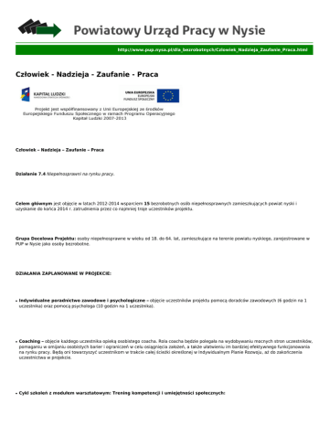 http://www.pup.nysa.pl/dla_bezrobotnych/Czlowiek_Nadzieja_Zaufanie_Praca.html Człowiek - Nadzieja - Zaufanie - Praca Człowiek – Nadzieja – Zaufanie – Praca Działanie 7.4 Niepełnosprawni na rynku pracy. Celem głównym jest objęcie w latach 2012-2014 wsparciem 15 bezrobotnych osób niepełnosprawnych zamieszkujących powiat nyski i uzyskanie do końca 2014 r. zatrudnienia przez co najmniej troje uczestników projektu. Grupa Docelowa Projektu: osoby niepełnosprawne w wieku od 18. do 64. lat, zamieszkujące na terenie powiatu nyskiego, zarejestrowane w PUP w Nysie jako osoby bezrobotne. DZIAŁANIA ZAPLANOWANE W PROJEKCIE: ● ● ● Indywidualne poradnictwo zawodowe i psychologiczne – objęcie uczestników projektu pomocą doradców zawodowych (6 godzin na 1 uczestnika) oraz pomocą psychologa (10 godzin na 1 uczestnika). Coaching – objęcie każdego uczestnika opieką osobistego coacha. Rola coacha będzie polegała na wydobywaniu mocnych stron uczestników, pomaganiu w omijaniu osobistych barier i ograniczeń w celu osiągnięcia założeń, a także ułatwieniu im bardziej efektywnego funkcjonowania na rynku pracy. Będą oni towarzyszyć uczestnikom w trakcie całej ścieżki określonej w Indywidualnym Planie Rozwoju, aż do zakończenia uczestnictwa w projekcie. Cykl szkoleń z modułem warsztatowym: Trening kompetencji i umiejętności społecznych: 1. UWIERZ W SIEBIE – 40h szkol. - prowadzone przez psychologa obejmujące zagadnienia takie jak: - samopoznanie i budowanie poczucia własnej wartości, - trening asertywności, - komunikacja interpersonalna, - konstruktywne rozwiązywanie problemów/konfliktów, - umiejętność radzenia sobie z emocjami i stresem. 2. ZDOBYWAM RYNEK – 60h szkol. - prowadzone przez doradców zawodowych obejmujące zagadnienia takie jak: - tworzenie profesjonalnych dokumentów aplikacyjnych, - metody rekrutacji, - autoprezentacja w kontakcie z pracodawcą, - skuteczna komunikacja i praca zespołowa. W celu przybliżenia uczestnikom optymalnego środowiska jakie panuje w trakcie rozmów kwalifikacyjnych planuje się ich przeprowadzenie na warsztatach z udziałem zaproszonych pracodawców i przedstawicieli agencji zatrudnieniowych. 3. ŚWIADOMY PRACOWNIK - 20h szkol. - prowadzone przez profesjonalnych trenerów obejmujące zagadnienia: a) prawa i uprawnienia osób niepełnosprawnych na rynku pracy, b) podstawy prawa pracy i prawa gospodarczego, z uwzględnieniem osób niepełnosprawnych, w tym; - zatrudnianie (przywileje i obowiązki) - czas pracy, - dofinansowanie do wynagrodzenia pracowników niepełnosprawnych - refundacja składek na ubezpieczenie społeczne, - ulgi w podatkach i opłatach lokalnych związane z prawem pracy. ● Szkolenia zawodowe - każdy z uczestników odbędzie szkolenie zawodowe. ● Staże - Uczestnicy będą kierowani na 12-miesięczne staże do pracodawców. Rodzaj wykonywanej pracy będzie zależał od indywidualnych możliwości i predyspozycji oraz profilu zrealizowanego szkolenia zawodowego. Okres realizacji projektu: 01.11.2012 – 31.10.2014 r. Szczegółowe informacje: Ewa Gola- Specjalista ds. programów, II piętro, pokój 22, Tel. 77 448 99 28, e-mail: Nazwa pliku Rozmiar Pobierz Kategoria: Czlowiek - nadzieja - zaufanie - praca [ 4 ] Ankieta aplikacyjna do projektu Oświadczenie - zgoda na przetwarzanie danych osobowych Regulamin uczestnictwa w projekcie z dnia 02.11.2012 r. Zakres danych osobowych Uczestnika/ Uczestniczki projektu 153.5KB pobierz 47KB pobierz 101.5KB pobierz 164KB pobierz