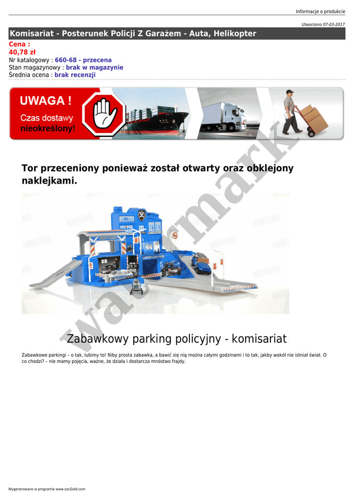 Informacje o produkcie Utworzono 07-03-2017 Komisariat - Posterunek Policji Z Garażem - Auta, Helikopter Cena : 40,78 zł er m ar k Nr katalogowy : 660-68 - przecena Stan magazynowy : brak w magazynie Średnia ocena : brak recenzji w at Tor przeceniony ponieważ został otwarty oraz obklejony naklejkami. Zabawkowy parking policyjny - komisariat Zabawkowe parkingi – o tak, lubimy to! Niby prosta zabawka, a bawić się nią można całymi godzinami i to tak, jakby wokół nie istniał świat. O co chodzi? – nie mamy pojęcia, ważne, że działa i dostarcza mnóstwo frajdy. Wygenerowano w programie www.oscGold.com er m ar k Mnóstwo elementów Zabawa parkingiem jest tym ciekawsza, im bardziej jest on rozbudowany jest i im więcej gadżetów posiada. A ten policyjny parking posiada ich wystarczająco dużo, by każda minuta zabawy była najwspanialszym momentem dnia: w at • komisariat policyjny • 4 pojazdy - 2 samochody, 2 autobusy • helikopter • podjazdy na piętro • sygnalizatory uliczne • rogatki • akcesoria • naklejki Tajemnica dobrej zabawy Cała sztuka w zabawie parkingiem polega na tym, by dostrzec wszystkie niesamowite możliwości, jakie daje. Wyobraźmy to sobie na przykładzie 2 policjantów – Gienka i Zenka, którzy po pracy jadą na parking, by odstawić samochody. Zenek to spokojny facet – po tym, jak już złapał wszystkich złoczyńców w mieście, przepisową prędkością snuje się przez miasto, ze stoickim spokojem pokonuje zakręty parkingu, podjeżdża na myjnię, gdzie dokładnie pucuje każdy centymetr karoserii i podwozia, a następnie odstawia auto i pogwizdując wesoło idzie do domu. Gienek to jego całkowite przeciwieństwo – lubi, gdy coś się dzieje. Szaleńcze pościgi, adrenalina, prędkość, a wszystko to w rytm… klasycznej muzyki. Wariatuńcio! Gienek wracający na policyjny parking, wykorzystuje każdy centymetr tej absolutnie cudownej infrastruktury drogowej – drifting na zakrętach, ekstremalne zjazdy po zjeżdżalniach, pisk opon, kurz i dym. Informacje o produkcie er m ar k Gienek i Zenek to policyjni partnerzy i, wbrew wszelkim pozorom, doskonale się uzupełniają. Doskonały i niedrogi prezent dla dziecka! w at Przekonaj się na własnej skórze, jak wiele radości daje zabawa parkingiem. Pobaw się w policjantów, ścigaj przestępców, urządź pościg, a nawet… kup po drodze pączki – baw się w najlepsze! Wygenerowano w programie www.oscGold.com Jakość i bezpieczeństwo W trosce o najmłodszych, parking i samochodziki wykonano z wysokiej jakości tworzywa. Żywa kolorystyka i estetyczne wykonanie skutecznie zachęcają do zabawy. Zabawka nie posiada żadnych ostrych krawędzi ani elementów, którymi dziecko mogłoby się skaleczyć. Pełne bezpieczeństwo użytkowania potwierdza Europejski Certyfikat bezpieczeństwa CE. at er m ar k Zabawka przeznaczona dla dzieci powyżej 3 lat. Zawartość zestawu: w • parking policyjny • 4 pojazdy - samochody i autobusy • helikopter • akcesoria • oryginalne opakowanie Wymiary: Opakowanie: 52 x 34,5 x 7 cm Zestaw po złożeniu: 50 x 46 x 18 cm Autka: 7,5 x 3,3 cm, 6,5 x 3,5cm Informacje o produkcie 8 x 2,5 cm Helikopter: 9 x 7 cm w at er m ar k Autobusy: Wygenerowano w programie www.oscGold.com