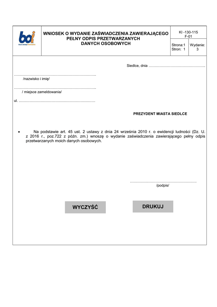 KI -130-115 WNIOSEK O WYDANIE ZAŚWIADCZENIA ZAWIERAJĄCEGO F-01 PEŁNY ODPIS PRZETWARZANYCH DANYCH OSOBOWYCH Strona:1 Wydanie: Stron: 1 3 Siedlce, dnia ……………………………………….. ………………………………………………………….. /nazwisko i imię/ ………………………………………………………….. / miejsce zameldowania/ ul. ……………………………………………………… PREZYDENT MIASTA SIEDLCE • Na podstawie art. 45 ust. 2 ustawy z dnia 24 września 2010 r. o ewidencji ludności (Dz. U. z 2016 r., poz.722 z późn. zm.) wnoszę o wydanie zaświadczenia zawierającego pełny odpis przetwarzanych moich danych osobowych. ………………………………………………. /podpis/ WYCZYŚĆ DRUKUJ