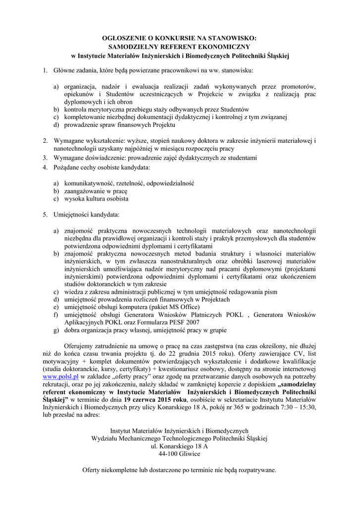 OGŁOSZENIE O KONKURSIE NA STANOWISKO: SAMODZIELNY REFERENT EKONOMICZNY w Instytucie Materiałów Inżynierskich i Biomedycznych Politechniki Śląskiej 1. Główne zadania, które będą powierzane pracownikowi na ww. stanowisku: a) organizacja, nadzór i ewaluacja realizacji zadań wykonywanych przez promotorów, opiekunów i Studentów uczestniczących w Projekcie w związku z realizacją prac dyplomowych i ich obron b) kontrola merytoryczna przebiegu staży odbywanych przez Studentów c) kompletowanie niezbędnej dokumentacji dydaktycznej i kontrolnej z tym związanej d) prowadzenie spraw finansowych Projektu 2. Wymagane wykształcenie: wyższe, stopień naukowy doktora w zakresie inżynierii materiałowej i nanotechnologii uzyskany najpóźniej w miesiącu rozpoczęciu pracy 3. Wymagane doświadczenie: prowadzenie zajęć dydaktycznych ze studentami 4. Pożądane cechy osobiste kandydata: a) komunikatywność, rzetelność, odpowiedzialność b) zaangażowanie w pracę c) wysoka kultura osobista 5. Umiejętności kandydata: a) znajomość praktyczna nowoczesnych technologii materiałowych oraz nanotechnologii niezbędna dla prawidłowej organizacji i kontroli staży i praktyk przemysłowych dla studentów potwierdzona odpowiednimi dyplomami i certyfikatami b) znajomość praktyczna nowoczesnych metod badania struktury i własności materiałów inżynierskich, w tym zwłaszcza nanostrukturalnych oraz obróbki laserowej materiałów inżynierskich umożliwiająca nadzór merytoryczny nad pracami dyplomowymi (projektami inżynierskimi) potwierdzona odpowiednimi dyplomami i certyfikatami oraz ukończeniem studiów doktoranckich w tym zakresie c) wiedza z zakresu administracji publicznej w tym umiejętność redagowania pism d) umiejętność prowadzenia rozliczeń finansowych w Projektach e) umiejętność obsługi komputera (pakiet MS Office) f) umiejętność obsługi Generatora Wniosków Płatniczych POKL , Generatora Wniosków Aplikacyjnych POKL oraz Formularza PESF 2007 g) dobra organizacja pracy własnej, umiejętność pracy w grupie Oferujemy zatrudnienie na umowę o pracę na czas zastępstwa (na czas określony, nie dłużej niż do końca czasu trwania projektu tj. do 22 grudnia 2015 roku). Oferty zawierające CV, list motywacyjny + komplet dokumentów potwierdzających wykształcenie i dodatkowe kwalifikacje (studia doktoranckie, kursy, certyfikaty) + kwestionariusz osobowy, dostępny na stronie internetowej www.polsl.pl w zakładce „oferty pracy” oraz zgodę na przetwarzanie danych osobowych na potrzeby rekrutacji, oraz po jej zakończeniu, należy składać w zamkniętej kopercie z dopiskiem „samodzielny referent ekonomiczny w Instytucie Materiałów Inżynierskich i Biomedycznych Politechniki Śląskiej” w terminie do dnia 19 czerwca 2015 roku, osobiście w sekretariacie Instytutu Materiałów Inżynierskich i Biomedycznych przy ulicy Konarskiego 18 A, pokój nr 365 w godzinach 7:30 – 15:30, lub przesłać na adres: Instytut Materiałów Inżynierskich i Biomedycznych Wydziału Mechanicznego Technologicznego Politechniki Śląskiej ul. Konarskiego 18 A 44-100 Gliwice Oferty niekompletne lub dostarczone po terminie nie będą rozpatrywane.