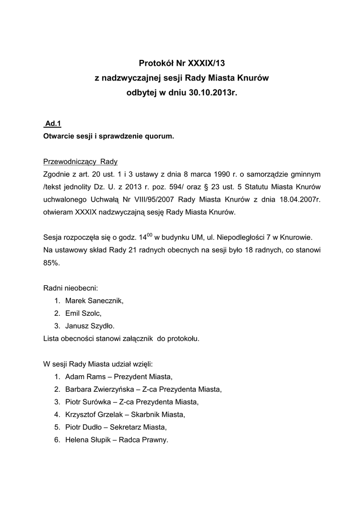 Protokół Nr XXXIX/2013 z sesji Rady Miasta Knurów w dniu 30.10