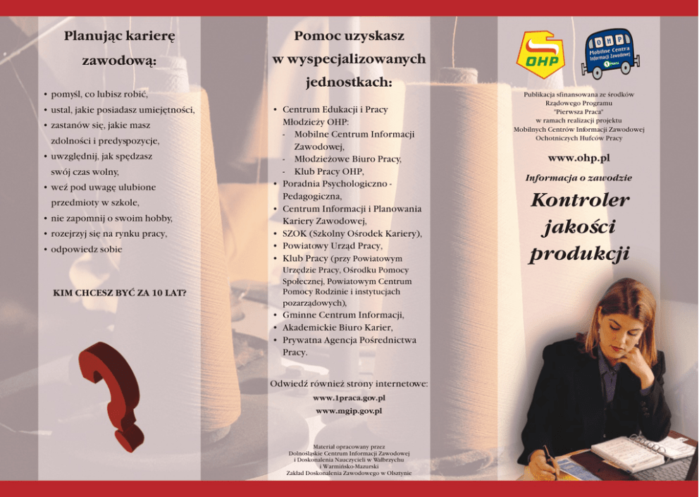 Planuj¹c karierê Pomoc uzyskasz zawodow¹: w wyspecjalizowanych jednostkach: • pomyœl, co lubisz robiæ, • ustal, jakie posiadasz umiejêtnoœci, • zastanów siê, jakie masz zdolnoœci i predyspozycje, • uwzglêdnij, jak spêdzasz swój czas wolny, • weŸ pod uwagê ulubione przedmioty w szkole, • nie zapomnij o swoim hobby, • rozejrzyj siê na rynku pracy, • odpowiedz sobie KIM CHCESZ BYÆ ZA 10 LAT? • Centrum Edukacji i Pracy M³odzie¿y OHP: - Mobilne Centrum Informacji Zawodowej, - M³odzie¿owe Biuro Pracy, - Klub Pracy OHP, • Poradnia Psychologiczno Pedagogiczna, • Centrum Informacji i Planowania Kariery Zawodowej, • SZOK (Szkolny Oœrodek Kariery), • Powiatowy Urz¹d Pracy, • Klub Pracy (przy Powiatowym Urzêdzie Pracy, Oœrodku Pomocy Spo³ecznej, Powiatowym Centrum Pomocy Rodzinie i instytucjach pozarz¹dowych), • Gminne Centrum Informacji, • Akademickie Biuro Karier, • Prywatna Agencja Poœrednictwa Pracy. OdwiedŸ równie¿ strony internetowe: www.1praca.gov.pl www.mgip.gov.pl Materia³ opracowany przez Dolnoœl¹skie Centrum Informacji Zawodowej i Doskonalenia Nauczycieli w Wa³brzychu i Warmiñsko-Mazurski Zak³ad Doskonalenia Zawodowego w Olsztynie Publikacja sfinansowana ze œrodków Rz¹dowego Programu "Pierwsza Praca" w ramach realizacji projektu Mobilnych Centrów Informacji Zawodowej Ochotniczych Hufców Pracy www.ohp.pl Informacja o zawodzie Kontroler jakoœci produkcji Funkcje i zadania: Kontroler jakoœci produkcji ocenia i odbiera pod wzglêdem jakoœciowym wyroby wytwarzane w danej firmie. Kontroler jakoœci obecny jest w toku ca³ego procesu produkcyjnego. Jego zadaniem jest wykonywanie czynnoœci sprawdzaj¹cych: • kontrola wejœciowa sprawdza jakoœæ przeznaczonych do produkcji surowców, pó³produktów i produktów, • kontrola miêdzyoperacyjna sprawdza jakoœæ produkowanych wyrobów w czasie trwania procesu produkcyjnego, • kontrola wyjœciowa to ostatni etap, podczas którego sprawdza siê czy wyprodukowany wyrób odpowiada przyjêtym normom produkcyjnym. Sprawdzeniu podlega równie¿ jego opakowanie. Koñcowym efektem pracy kontrolera jakoœci jest zmniejszenie nap³ywaj¹cych do firmy iloœci reklamacji, poprawa efektów wytwarzania produkcji, a poœrednio poprawa pozycji marketingowej firmy. Warunki pracy: Kontroler jakoœci pracuje w zak³adach produkcyjnych. Poniewa¿ jest zaanga¿owany w ca³y proces produkcji, mo¿na go spotkaæ w halach produkcyjnych, magazynach, laboratoriach, a tak¿e w biurze. Wydzia³ kontroli jakoœci, choæ jest bardzo zwi¹zany z produkcj¹, nie nale¿y do pionu produkcji w zak³adzie, lecz jest bezpoœrednio podporz¹dkowany dyrektorowi naczelnemu. Chodzi tu o zapewnienie kontrolerom jakoœci niezale¿noœci w pracy. Predyspozycje do zawodu: Do wykonywania zawodu niezbêdna jest: • profesjonalna wiedza, zwi¹zana z dziedzin¹ produkcji, któr¹ kontroluje, • znajomoœæ metod kontroli jakoœci, • znajomoœæ systemów zapewnienia jakoœci. Ponadto kontroler jakoœci musi byæ: • obowi¹zkowym i dok³adnym, • spostrzegawczym, • energicznym, • powinien mieæ sprawne narz¹dy zmys³ów, (przy czym wymagania te s¹ zró¿nicowane, w zale¿noœci od tego, w jakiej bran¿y i na jakim stanowisku pracy kontroler jakoœci jest zatrudniony). Mo¿liwoœci zatrudnienia: Stanowiska kontrolerów jakoœci znajduj¹ siê we wszystkich zak³adach produkcyjnych. Dokonuj¹cy siê postêp techniczny eliminuje z pracy tradycyjnych brakarzy. Rozpowszechnianie siê systemu ISO 9000 sprawia, ¿e poszukiwane s¹ osoby wysokokwalifikowane, z certyfikatem jakoœci ISO. Wykszta³cenie zale¿y w du¿ym stopniu od rodzaju zak³adu i kontrolowanego produktu. W czasach ogromnej konkurencji, jakoœæ wytwarzanej produkcji ma ogromne znaczenie. To od jakoœci produkcji zale¿y, czy firma utrzyma siê, na coraz bardziej wymagaj¹cym rynku pracy, czy bêdzie w oczach klienta firm¹ atrakcyjn¹. Dlatego zawód kontrolera jakoœci jest niezbêdny. Ulega on jednak zmianie, a zawodem z przysz³oœci¹ jest menad¿er jakoœci. Osobê powinna cechowaæ: • niezale¿noœæ, • odpornoœæ na stres. Nie mo¿e ulegaæ presji innych osób. Wymagania fizyczne i zdrowotne s¹ zindywidualizowane. Na niektórych stanowiskach mog¹ pracowaæ osoby niepe³nosprawne. Wiêcej szczegó³ów znajdziesz w teczce informacji o zawodzie