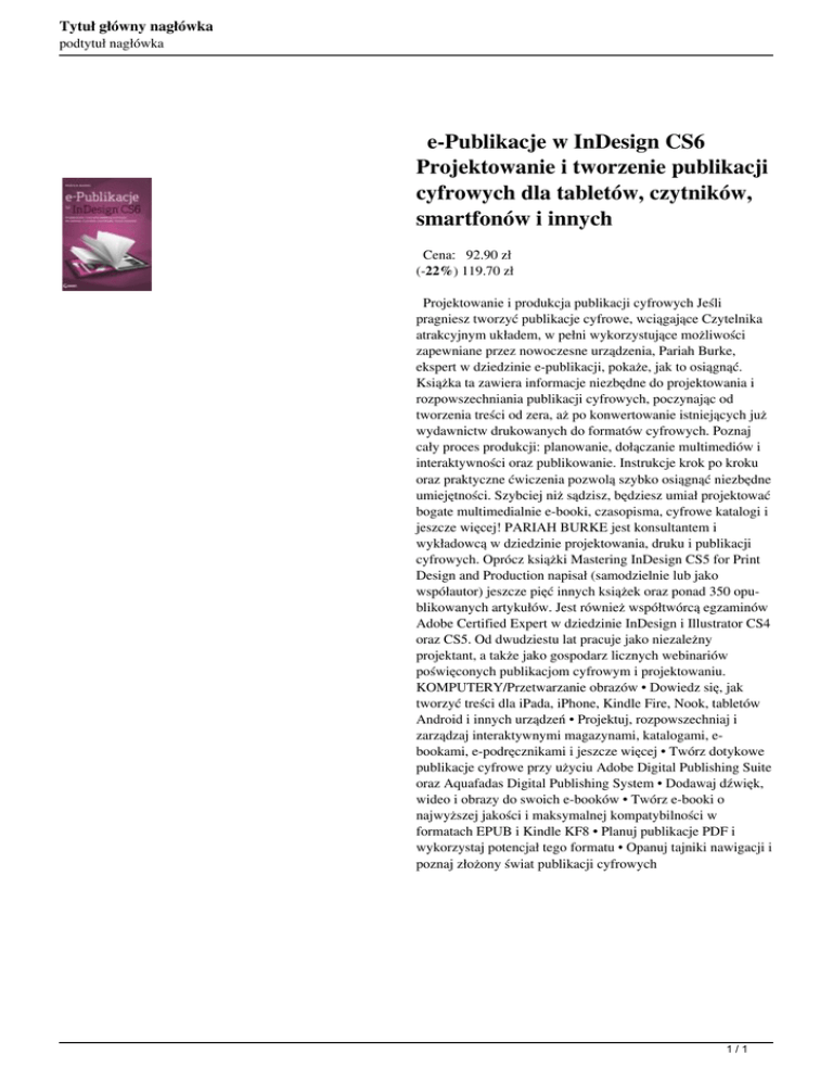 Tytuł główny nagłówka podtytuł nagłówka e-Publikacje w InDesign CS6 Projektowanie i tworzenie publikacji cyfrowych dla tabletów, czytników, smartfonów i innych Cena: 92.90 zł (-22%) 119.70 zł Projektowanie i produkcja publikacji cyfrowych Jeśli pragniesz tworzyć publikacje cyfrowe, wciągające Czytelnika atrakcyjnym układem, w pełni wykorzystujące możliwości zapewniane przez nowoczesne urządzenia, Pariah Burke, ekspert w dziedzinie e-publikacji, pokaże, jak to osiągnąć. Książka ta zawiera informacje niezbędne do projektowania i rozpowszechniania publikacji cyfrowych, poczynając od tworzenia treści od zera, aż po konwertowanie istniejących już wydawnictw drukowanych do formatów cyfrowych. Poznaj cały proces produkcji: planowanie, dołączanie multimediów i interaktywności oraz publikowanie. Instrukcje krok po kroku oraz praktyczne ćwiczenia pozwolą szybko osiągnąć niezbędne umiejętności. Szybciej niż sądzisz, będziesz umiał projektować bogate multimedialnie e-booki, czasopisma, cyfrowe katalogi i jeszcze więcej! PARIAH BURKE jest konsultantem i wykładowcą w dziedzinie projektowania, druku i publikacji cyfrowych. Oprócz książki Mastering InDesign CS5 for Print Design and Production napisał (samodzielnie lub jako współautor) jeszcze pięć innych książek oraz ponad 350 opublikowanych artykułów. Jest również współtwórcą egzaminów Adobe Certified Expert w dziedzinie InDesign i Illustrator CS4 oraz CS5. Od dwudziestu lat pracuje jako niezależny projektant, a także jako gospodarz licznych webinariów poświęconych publikacjom cyfrowym i projektowaniu. KOMPUTERY/Przetwarzanie obrazów • Dowiedz się, jak tworzyć treści dla iPada, iPhone, Kindle Fire, Nook, tabletów Android i innych urządzeń • Projektuj, rozpowszechniaj i zarządzaj interaktywnymi magazynami, katalogami, ebookami, e-podręcznikami i jeszcze więcej • Twórz dotykowe publikacje cyfrowe przy użyciu Adobe Digital Publishing Suite oraz Aquafadas Digital Publishing System • Dodawaj dźwięk, wideo i obrazy do swoich e-booków • Twórz e-booki o najwyższej jakości i maksymalnej kompatybilności w formatach EPUB i Kindle KF8 • Planuj publikacje PDF i wykorzystaj potencjał tego formatu • Opanuj tajniki nawigacji i poznaj złożony świat publikacji cyfrowych 1/1 Powered by TCPDF (www.tcpdf.org)