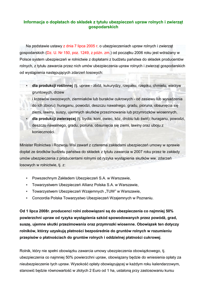 Informacja o dop atach do sk adek z tytu u ubezpiecze upraw rolnych i zwierz t gospodarskich Na podstawie ustawy z dnia 7 lipca 2005 r. o ubezpieczeniach upraw rolnych i zwierz t gospodarskich (Dz. U. Nr 150, poz. 1249, z pó n. zm.) od pocz tku 2006 roku jest wdra any w Polsce system ubezpiecze w rolnictwie z dop atami z bud etu pa stwa do sk adek producentów rolnych, z tytu u zawarcia przez nich umów ubezpieczenia upraw rolnych i zwierz t gospodarskich od wyst pienia nast puj cych zdarze losowych: dla produkcji ro linnej (tj. upraw - zbó , kukurydzy, rzepaku, rzepiku, chmielu, warzyw gruntowych, drzew i krzewów owocowych, ziemniaków lub buraków cukrowych - od zasiewu lub wysadzenia do ich zbioru): huraganu, powodzi, deszczu nawalnego, gradu, pioruna, obsuni cia si ziemi, lawiny, suszy, ujemnych skutków przezimowania lub przymrozków wiosennych, dla produkcji zwierz cej (tj. byd a, koni, owiec, kóz, drobiu lub wi ): huraganu, powodzi, deszczu nawalnego, gradu, pioruna, obsuni cia si ziemi, lawiny oraz uboju z konieczno ci. Minister Rolnictwa i Rozwoju Wsi zawar z czterema zak adami ubezpiecze umowy w sprawie dop at ze rodków bud etu pa stwa do sk adek z tytu u zawarcia w 2007 roku przez te zak ady umów ubezpieczenia z producentami rolnymi od ryzyka wyst pienia skutków ww. zdarze losowych w rolnictwie, tj. z: Powszechnym Zak adem Ubezpiecze S.A. w Warszawie, Towarzystwem Ubezpiecze Allianz Polska S.A. w Warszawie, Towarzystwem Ubezpiecze Wzajemnych „TUW” w Warszawie, Concordia Polska Towarzystwo Ubezpiecze Wzajemnych w Poznaniu. Od 1 lipca 2008r. producenci rolni zobowi zani s do ubezpieczenia co najmniej 50% powierzchni upraw od ryzyka wyst pienia szkód spowodowanych przez powód , grad, susz , ujemne skutki przezimowania oraz przymrozki wiosenne. Obowi zek ten dotyczy rolników, którzy uzyskuj p atno ci bezpo rednie do gruntów rolnych w rozumieniu przepisów o p atno ciach do gruntów rolnych i oddzielnej p atno ci cukrowej. Rolnik, który nie spe ni obowi zku zawarcia umowy ubezpieczenia obowi zkowego, tj. ubezpieczenia co najmniej 50% powierzchni upraw, obowi zany b dzie do wniesienia op aty za nieubezpieczenie tych upraw. Wysoko stanowi b dzie równowarto op aty obowi zuj cej w ka dym roku kalendarzowym, w z otych 2 Euro od 1 ha, ustalon przy zastosowaniu kursu redniego og aszanego przez Narodowy Bank Polski wed ug tabeli kursów nr 1 w roku kontroli. Op ata za niespe nienie obowi zku zawarcia umowy ubezpieczenia obowi zkowego b dzie wnoszona na rzecz gminy w Powy sze sankcje nie b ciwej ze wzgl du na miejsce zamieszkania albo siedzib rolnika. jednak stosowane wobec rolników w przypadku: 1) niezawarcia przez ministra w ciwego do spraw rolnictwa umów w sprawie dop at do ubezpiecze upraw rolnych i zwierz t gospodarskich, 2) gdy rolnik nie zawrze umowy ubezpieczenia obowi zkowego z powodu pisemnej odmowy przez co najmniej dwa zak ady ubezpiecze , które zawar y z ministrem w ciwym do spraw rolnictwa umowy w sprawie dop at, w szczególno ci z powodu zaoferowania ubezpieczenia w stawkach taryfowych przekraczaj cych 6% sumy ubezpieczenia. Nale y podkre li , i niezawarcie przez rolników umów ubezpieczenia upraw rolnych lub zwierz t gospodarskich nie b dzie mia o wp ywu na ubieganie si przez nich o p atno ci bezpo rednie. Wprowadzenie obowi zku ubezpieczenia upraw rolnych jest konieczne w zwi zku z unijnym obowi zkiem posiadania polis ubezpieczenia 50% upraw rolnych przez rolników, którzy od 2010 r. ubiega si o inne formy wsparcia z bud etu krajowego w przypadku wyst pienia kl sk. ród o: Ministerstwo Rolnictwa i Rozwoju wsi