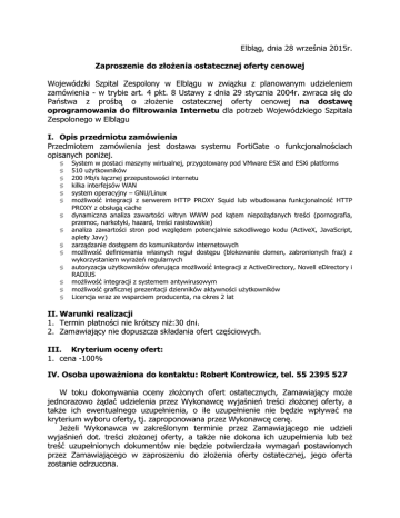 Elbląg, dnia 28 września 2015r. Zaproszenie do złożenia ostatecznej oferty cenowej Wojewódzki Szpital Zespolony w Elblągu w związku z planowanym udzieleniem zamówienia - w trybie art. 4 pkt. 8 Ustawy z dnia 29 stycznia 2004r. zwraca się do Państwa z prośbą o złożenie ostatecznej oferty cenowej na dostawę oprogramowania do filtrowania Internetu dla potrzeb Wojewódzkiego Szpitala Zespolonego w Elblągu I. Opis przedmiotu zamówienia Przedmiotem zamówienia jest dostawa systemu FortiGate o funkcjonalnościach opisanych poniżej. § § § § § § § § § § § § § § System w postaci maszyny wirtualnej, przygotowany pod VMware ESX and ESXi platforms 510 użytkowników 200 Mb/s łącznej przepustowości internetu kilka interfejsów WAN system operacyjny – GNU/Linux możliwość integracji z serwerem HTTP PROXY Squid lub wbudowana funkcjonalność HTTP PROXY z obsługą cache dynamiczna analiza zawartości witryn WWW pod kątem niepożądanych treści (pornografia, przemoc, narkotyki, hazard, treści rasistowskie) analiza zawartości stron pod względem potencjalnie szkodliwego kodu (ActiveX, JavaScript, aplety Javy) zarządzanie dostępem do komunikatorów internetowych możliwość definiowania własnych reguł dostępu (blokowanie domen, zabronionych fraz) z wykorzystaniem wyrażeń regularnych autoryzacja użytkowników oferująca możliwość integracji z ActiveDirectory, Novell eDirectory i RADIUS możliwość integracji z systemem antywirusowym możliwość graficznej prezentacji dzienników aktywności użytkowników Licencja wraz ze wsparciem producenta, na okres 2 lat II. Warunki realizacji 1. Termin płatności nie krótszy niż:30 dni. 2. Zamawiający nie dopuszcza składania ofert częściowych. III. Kryterium oceny ofert: 1. cena -100% IV. Osoba upoważniona do kontaktu: Robert Kontrowicz, tel. 55 2395 527 W toku dokonywania oceny złożonych ofert ostatecznych, Zamawiający może jednorazowo żądać udzielenia przez Wykonawcę wyjaśnień treści złożonej oferty, a także ich ewentualnego uzupełnienia, o ile uzupełnienie nie będzie wpływać na kryterium wyboru oferty, tj. zaproponowana przez Wykonawcę cenę. Jeżeli Wykonawca w zakreślonym terminie przez Zamawiającego nie udzieli wyjaśnień dot. treści złożonej oferty, a także nie dokona ich uzupełnienia lub też treść uzupełnionych dokumentów nie będzie potwierdzała wymagań postawionych przez Zamawiającego w zaproszeniu do złożenia oferty ostatecznej, jego oferta zostanie odrzucona. W przypadku, gdy nie zostanie złożona żadna oferta lub oferty złożone zostaną odrzucone, lub pojawi się błąd, który uniemożliwi podpisanie ważnej umowy wówczas Zamawiający unieważni postępowanie. Oferta powinna być podpisana przez osoby umocowane do składania oświadczeń woli i zaciągania zobowiązań w imieniu Wykonawcy. Umocowanie do złożenia ofert winno być dołączone do oferty o ile nie wynika ono wprost z innych dokumentów załączonych do oferty. Formularz ofertowy stanowi załącznik nr 1 do zaproszenia do złożenia ostatecznej oferty cenowej. Ofertę opatrzoną następującym napisem: „Dostawa oprogramowania do filtrowania Internetu” prosimy przesłać w terminie do dnia 5 października 2015r., na adres: Sekcja Informatyki i Telekomunikacji Wojewódzki Szpital Zespolony w Elblągu ul. Królewiecka 146 82-300 Elbląg Telefon kontaktowy: 55 2395 527 lub 55 2395 717 lub w formie elektronicznej (wypełniony, podpisany i zeskanowany formularz ofertowy w postaci pliku pdf) przesłany na adres [email protected] Zamawiający zastrzega sobie prawo do unieważnienia postępowania bez podania przyczyny