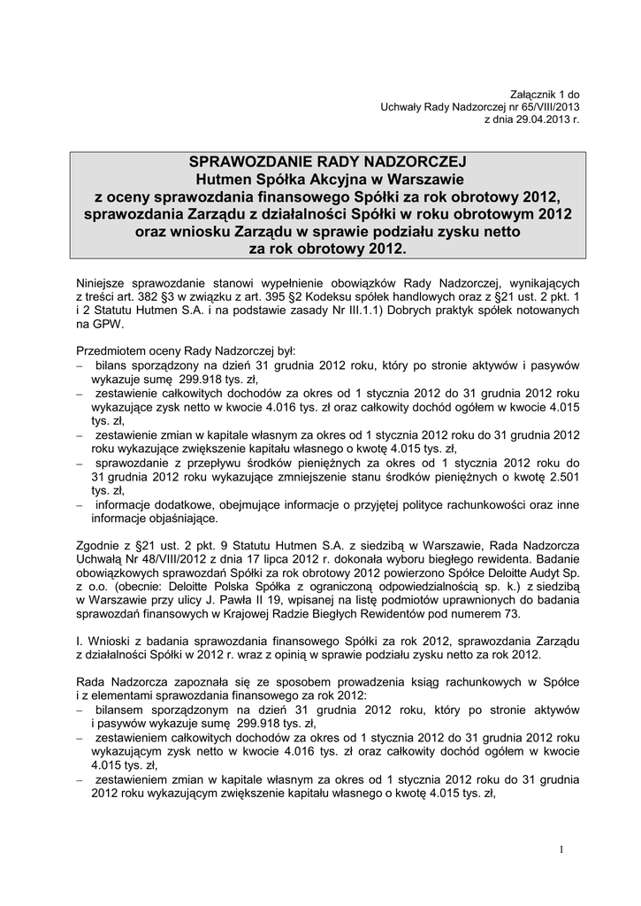 Załącznik 1 do Uchwały Rady Nadzorczej nr 65/VIII/2013 z dnia 29.04.2013 r. SPRAWOZDANIE RADY NADZORCZEJ Hutmen Spółka Akcyjna w Warszawie z oceny sprawozdania finansowego Spółki za rok obrotowy 2012, sprawozdania Zarządu z działalności Spółki w roku obrotowym 2012 oraz wniosku Zarządu w sprawie podziału zysku netto za rok obrotowy 2012. Niniejsze sprawozdanie stanowi wypełnienie obowiązków Rady Nadzorczej, wynikających z treści art. 382 §3 w związku z art. 395 §2 Kodeksu spółek handlowych oraz z §21 ust. 2 pkt. 1 i 2 Statutu Hutmen S.A. i na podstawie zasady Nr III.1.1) Dobrych praktyk spółek notowanych na GPW. Przedmiotem oceny Rady Nadzorczej był: bilans sporządzony na dzień 31 grudnia 2012 roku, który po stronie aktywów i pasywów wykazuje sumę 299.918 tys. zł, zestawienie całkowitych dochodów za okres od 1 stycznia 2012 do 31 grudnia 2012 roku wykazujące zysk netto w kwocie 4.016 tys. zł oraz całkowity dochód ogółem w kwocie 4.015 tys. zł, zestawienie zmian w kapitale własnym za okres od 1 stycznia 2012 roku do 31 grudnia 2012 roku wykazujące zwiększenie kapitału własnego o kwotę 4.015 tys. zł, sprawozdanie z przepływu środków pieniężnych za okres od 1 stycznia 2012 roku do 31 grudnia 2012 roku wykazujące zmniejszenie stanu środków pieniężnych o kwotę 2.501 tys. zł, informacje dodatkowe, obejmujące informacje o przyjętej polityce rachunkowości oraz inne informacje objaśniające. Zgodnie z §21 ust. 2 pkt. 9 Statutu Hutmen S.A. z siedzibą w Warszawie, Rada Nadzorcza Uchwałą Nr 48/VIII/2012 z dnia 17 lipca 2012 r. dokonała wyboru biegłego rewidenta. Badanie obowiązkowych sprawozdań Spółki za rok obrotowy 2012 powierzono Spółce Deloitte Audyt Sp. z o.o. (obecnie: Deloitte Polska Spółka z ograniczoną odpowiedzialnością sp. k.) z siedzibą w Warszawie przy ulicy J. Pawła II 19, wpisanej na listę podmiotów uprawnionych do badania sprawozdań finansowych w Krajowej Radzie Biegłych Rewidentów pod numerem 73. I. Wnioski z badania sprawozdania finansowego Spółki za rok 2012, sprawozdania Zarządu z działalności Spółki w 2012 r. wraz z opinią w sprawie podziału zysku netto za rok 2012. Rada Nadzorcza zapoznała się ze sposobem prowadzenia ksiąg rachunkowych w Spółce i z elementami sprawozdania finansowego za rok 2012: bilansem sporządzonym na dzień 31 grudnia 2012 roku, który po stronie aktywów i pasywów wykazuje sumę 299.918 tys. zł, zestawieniem całkowitych dochodów za okres od 1 stycznia 2012 do 31 grudnia 2012 roku wykazującym zysk netto w kwocie 4.016 tys. zł oraz całkowity dochód ogółem w kwocie 4.015 tys. zł, zestawieniem zmian w kapitale własnym za okres od 1 stycznia 2012 roku do 31 grudnia 2012 roku wykazującym zwiększenie kapitału własnego o kwotę 4.015 tys. zł, 1 sprawozdaniem z przepływu środków pieniężnych za okres od 1 stycznia 2012 roku do 31 grudnia 2012 roku wykazującym zmniejszenie stanu środków pieniężnych o kwotę 2.501 tys. zł, informacjami dodatkowymi, obejmującymi informacje o przyjętej polityce rachunkowości oraz inne informacjami objaśniającymi. Rada Nadzorcza stwierdza, że sprawozdanie finansowe zostało sporządzone we wszystkich istotnych aspektach, w ustalonym przepisami czasie, w sposób rzetelny i prawidłowy oraz jest zgodne co do formy i treści z obowiązującymi przepisami prawa, tj.: ustawą z dnia 29 września 1994r. o rachunkowości, kodeksem spółek handlowych, Statutem Spółki oraz rozporządzeniem Ministra Finansów z dnia 19 lutego 2009 roku w sprawie informacji bieżących i okresowych przekazywanych przez emitentów papierów wartościowych oraz warunków uznawania za równoważne informacji wymaganych przepisami prawa państwa nie będącego państwem członkowskim. (Dz.U.2010 r. Nr 33 poz. 259,) Sprawozdanie finansowe jest zgodne zarówno z księgami i dokumentami, jak i ze stanem faktycznym, odzwierciedla jasno i rzetelnie stan majątkowy i kondycję finansową podmiotu na dzień 31.12.2012 r. Rada Nadzorcza zapoznała się z opinią i raportem biegłego rewidenta, a także dokonała analizy ekonomiczno-finansowej funkcjonowania Spółki Hutmen S.A. w 2012 roku. Rada Nadzorcza stwierdza, że zakres prac związany z badaniem sprawozdania finansowego, określony w umowie zawartej między Zarządem Hutmen S.A., a Deloitte Audyt Sp. z o.o. (obecnie: Deloitte Polska Spółka z ograniczoną odpowiedzialnością sp. k.) z siedzibą w Warszawie, został przez tę firmę zrealizowany. Biegli rewidenci działający w imieniu ww. podmiotu wydali pozytywną opinię do przedłożonego sprawozdania finansowego, stwierdzając, że sporządzone zostało zgodnie z zasadami rachunkowości, na podstawie prawidłowo prowadzonych ksiąg rachunkowych. Sprawozdanie finansowe jest zgodne co do formy i treści z obowiązującymi przepisami prawa i Statutem Spółki i przedstawia rzetelnie i jasno wszystkie informacje istotne dla oceny rentowności oraz wyniku finansowego działalności gospodarczej za okres od 1 stycznia 2012 roku do 31 grudnia 2012 roku, jak też sytuacji majątkowej i finansowej badanej Spółki na dzień 31.12.2012 r. 3. Rada Nadzorcza stwierdza, że sprawozdanie Zarządu z działalności Spółki zawiera informacje wymagane przepisami ustawy o rachunkowości, w szczególności określone w art. 49 ust. 2 ustawy. Dane finansowe prezentowane w sprawozdaniu przez Zarząd są zgodne z danymi zawartymi w sprawozdaniu finansowym. Rada Nadzorcza w swoim sprawozdaniu odstępuje od szczegółowej prezentacji wyników ekonomiczno-finansowych, ponieważ uznaje, że wyżej wymienione wyniki zostały szczegółowo i kompetentnie przedstawione w sprawozdaniu z działalności Spółki – sporządzonym przez Zarząd Spółki oraz w opinii biegłego rewidenta. 4. Rada Nadzorcza pozytywnie opiniuje propozycję Zarządu wyrażoną w uchwale Zarządu nr 6/13 z dnia 19 kwietnia 2013 r. w sprawie podziału zysku netto za rok obrotow