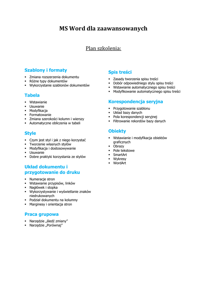 MS Word dla zaawansowanych Plan szkolenia: Szablony i formaty Zmiana rozszerzenia dokumentu Różne typy dokumentów Wykorzystanie szablonów dokumentów Tabela Wstawianie Usuwanie Modyfikacja Formatowanie Zmiana szerokości kolumn i wierszy Automatyczne obliczenia w tabeli Style Czym jest styl i jak z niego korzystać Tworzenie własnych stylów Modyfikacja i dostosowywanie Usuwanie Dobre praktyki korzystania ze stylów Układ dokumentu i przygotowanie do druku Numeracje stron Wstawianie przypisów, linków Nagłówek i stopka Wykorzystywanie i wyświetlanie znaków niedrukowanych Podział dokumentu na kolumny Marginesy i orientacja stron Praca grupowa Narzędzie „śledź zmiany” Narzędzie „Porównaj” Spis treści Zasady tworzenia spisu treści Dobór odpowiedniego stylu spisu treści Wstawianie automatycznego spisu treści Modyfikowanie automatycznego spisu treści Korespondencja seryjna Przygotowanie szablonu Układ bazy danych Pola korespondencji seryjnej Filtrowanie rekordów bazy danych Obiekty Wstawianie i modyfikacja obiektów graficznych Obrazy Pole tekstowe SmartArt Wykresy WordArt