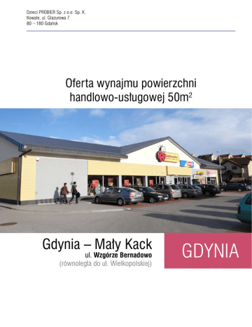 Dzieci PROBIER Sp. z o.o. Sp. K. Kowale, ul. Glazurowa 7 80 – 180 Gdańsk Oferta wynajmu powierzchni handlowo-usługowej 50m2 Gdynia – Mały Kack ul. Wzgórze Bernadowo (równoległa do ul. Wielkopolskiej) GDYNIA Szczegóły oferty: • całkowita powierzchnia: 50 m2 • czynsz najmu: 4000 zł netto • kaucja gwarancyjna: do ustalenia • termin wydania lokalu: 1 stycznia 2013r. Podstawowe atuty lokalizacji nieruchomości: 1. centralna część aglomeracji gdyńskiej, 2. bezpośrednie sąsiedztwo osiedla Bernadowskiego, osiedla Cadena Park, Cadena Milenium, osiedla Leśnego, Dzieci PROBIER Sp. z o.o. Sp. K. Kowale, ul. Glazurowa 7 80 – 180 Gdańsk 3. sąsiedztwo sklepu BIEDRONKA, PEPCO, Kolporter, Gzella, Kwiaciarnia Imbir, dużego parkingu oraz projektowanych kortów tenisowych 4. sąsiedztwo przystanku komunikacji miejskiej. 2 1. Lokalizacja Powierzchnia handlowo-usługowa o doskonałej lokalizacji znajduje się w nowo wybudowanym obiekcie handlowym. W obiekcie jest sklep spożywczy BIEDRONKA, sklep PEPCO oraz mniejsze lokale handlowo-usługowe, jak sklep mięsny GZELLA, salon prasowy Kolporter czy kwiaciarnia Imbir. Na 96% powierzchni obiektu są już zawarte umowy najmu. Dodatkowym atutem nieruchomości jest duży ogólnodostępny parking oraz planowana budowa centrum rekreacyjnego z kortami tenisowymi. W bezpośrednim sąsiedztwie nieruchomości znajdują się również inne małe punkty handlowo-usługowe. Niewątpliwym walorem położenia jest bliskość ulicy Wielkopolskiej będącej jedną z głównych arterii komunikacyjnych Gdyni. Na uwagę zasługuje również fakt, że ciągi piesze skierowane do przystanków komunikacji miejskiej prowadzą tuż obok oferowanej powierzchni. Nieruchomość zlokalizowana jest także w bezpośrednim sąsiedztwie osiedla Wzgórze Bernadowo, osiedla Cadena Parka, Cadena Milenium, osiedla Leśnego. 2. Otoczenie Nieruchomość znajduje się w dynamicznie rozwijającej części miasta. Mały Kack stanowi jedną z centralnych części aglomeracji Gdyńskiej. Jest to dzielnica typowo mieszkalna, licząca około 8 tys. mieszkańców. Obszar charakteryzuje się współczynnikiem gęstości zaludnienia 936 os/km. W promieniu 2,5 km od oferowanego lokalu znajdują się następujące dzielnice w których łącznie mieszka 47 tyś. mieszkańców: (źródło: www.gdynia.pl). • • • • • Karwiny (ok. 11 tys. mieszkańców), Wielki Kack (ok. 11 tys. mieszkańców), Orłowo (ok. 7 tys. mieszkańców), Redłowo (ok. 8 tys. mieszkańców), Witomino (ok. 10 tys. mieszkańców). Dzieci PROBIER Sp. z o.o. Sp. K. Kowale, ul. Glazurowa 7 80 – 180 Gdańsk 3 3. Kontakt W celu uzyskania dodatkowych informacji dotyczących wynajmu lub sprzedaży zaprezentowanej nieruchomości prosimy o kontakt. Filip Rojek Franciszek Rojek 501 027 183 502 664 682 [email protected] [email protected] lub wizytę w naszej siedzibie: Dzieci Probier sp. z o.o. sp. k. ul. Jaśkowa Dolina 17 80-252 Gdańsk Niniejszy prospekt nie stanowi oferty w rozumieniu Kodeksu Cywilnego Dzieci PROBIER Sp. z o.o. Sp. K. Kowale, ul. Glazurowa 7 80 – 180 Gdańsk 4