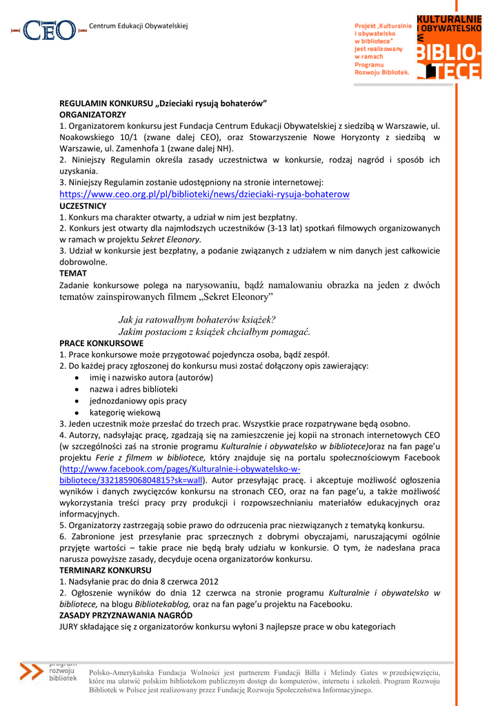 Centrum Edukacji Obywatelskiej REGULAMIN KONKURSU „Dzieciaki rysują bohaterów” ORGANIZATORZY 1. Organizatorem konkursu jest Fundacja Centrum Edukacji Obywatelskiej z siedzibą w Warszawie, ul. Noakowskiego 10/1 (zwane dalej CEO), oraz Stowarzyszenie Nowe Horyzonty z siedzibą w Warszawie, ul. Zamenhofa 1 (zwane dalej NH). 2. Niniejszy Regulamin określa zasady uczestnictwa w konkursie, rodzaj nagród i sposób ich uzyskania. 3. Niniejszy Regulamin zostanie udostępniony na stronie internetowej: https://www.ceo.org.pl/pl/biblioteki/news/dzieciaki-rysuja-bohaterow UCZESTNICY 1. Konkurs ma charakter otwarty, a udział w nim jest bezpłatny. 2. Konkurs jest otwarty dla najmłodszych uczestników (3-13 lat) spotkań filmowych organizowanych w ramach w projektu Sekret Eleonory. 3. Udział w konkursie jest bezpłatny, a podanie związanych z udziałem w nim danych jest całkowicie dobrowolne. TEMAT Zadanie konkursowe polega na narysowaniu, bądź namalowaniu obrazka na jeden z dwóch tematów zainspirowanych filmem „Sekret Eleonory” Jak ja ratowałbym bohaterów książek? Jakim postaciom z książek chciałbym pomagać. PRACE KONKURSOWE 1. Prace konkursowe może przygotować pojedyncza osoba, bądź zespół. 2. Do każdej pracy zgłoszonej do konkursu musi zostać dołączony opis zawierający: imię i nazwisko autora (autorów) nazwa i adres biblioteki jednozdaniowy opis pracy kategorię wiekową 3. Jeden uczestnik może przesłać do trzech prac. Wszystkie prace rozpatrywane będą osobno. 4. Autorzy, nadsyłając pracę, zgadzają się na zamieszczenie jej kopii na stronach internetowych CEO (w szczególności zaś na stronie programu Kulturalnie i obywatelsko w bibliotece)oraz na fan page’u projektu Ferie z filmem w bibliotece, który znajduje się na portalu społecznościowym Facebook (http://www.facebook.com/pages/Kulturalnie-i-obywatelsko-wbibliotece/332185906804815?sk=wall). Autor przesyłając pracę. i akceptuje możliwość ogłoszenia wyników i danych zwycięzców konkursu na stronach CEO, oraz na fan page’u, a także możliwość wykorzystania treści pracy przy produkcji i rozpowszechnianiu materiałów edukacyjnych oraz informacyjnych. 5. Organizatorzy zastrzegają sobie prawo do odrzucenia prac niezwiązanych z tematyką konkursu. 6. Zabronione jest przesyłanie prac sprzecznych z dobrymi obyczajami, naruszającymi ogólnie przyjęte wartości – takie prace nie będą brały udziału w konkursie. O tym, że nadesłana praca narusza powyższe zasady, decyduje ocena organizatorów konkursu. TERMINARZ KONKURSU 1. Nadsyłanie prac do dnia 8 czerwca 2012 2. Ogłoszenie wyników do dnia 12 czerwca na stronie programu Kulturalnie i obywatelsko w bibliotece, na blogu Bibliotekablog, oraz na fan page’u projektu na Facebooku. ZASADY PRZYZNAWANIA NAGRÓD JURY składające się z organizatorów konkursu wyłoni 3 najlepsze prace w obu kategoriach Polsko-Amerykańska Fundacja Wolności jest partnerem Fundacji Billa i Melindy Gates w przedsięwzięciu, które ma ułatwić polskim bibliotekom publicznym dostęp do komputerów, internetu i szkoleń. Program Rozwoju Bibliotek w Polsce jest realizowany przez Fundację Rozwoju Społeczeństwa Informacyjnego. Centrum Edukacji Obywatelskiej NAGRODY Autorzy trzech najlepszych wybranych przez JURY prac w każdej kategorii otrzymają nagrody książkowe i filmowe. Ponadto na fan page’u projektu Kulturalnie i obywatelsko w bibliotece na Facebooku w dniach 5-12 czerwca odbędzie się głosowanie Internautów na najlepszą pracę. Zwycięzca otrzyma dodatkową Nagrodę Publiczności. ZGŁOSZENIE PRAC KONKURSOWYCH 1. Podpisaną pracę konkursową należy przesłać pocztą, w wyznaczonym terminie, na adres: Fundacja Centrum Edukacji Obywatelskiej ul. Noakowskiego 10/1 00-666, Warszawa (z dopiskiem Kulturalnie i obywatelsko w bibliotece. Dzieciaki rysują bohaterów) 2. Przesłanie pracy konkursowej jest równoznaczne z akceptacją regulaminu i uczestnictwem w konkursie. Prace konkursowe można przesyłać wyłącznie do dnia 8 czerwca 2012 roku. OŚWIADCZENIA O PRAWACH AUTORSKICH 1. Przekazanie prac konkursowych oznacza jednocześnie, że nie będą one naruszały majątkowych i osobistych praw autorskich osób trzecich. 2. Nadesłanie pracy konkursowej jest równoznaczne z nieodpłatnym przekazaniem CEO i NH praw autorskich, (niewyłącznych) praw majątkowych do utworu w zakresie: – utrwalania i zwielokrotniania nadesłanego utworu – wytwarzania egzemplarzy utworu bez względu na technikę, ilość i wielkość nakładu; – obrotu oryginałem albo egzemplarzami, na których utwór utrwalono, wprowadzenie do obrotu, najem, użyczenie oryginału, nadanie drogą przewodową bądź bezprzewodową, publiczne udostępnianie utworu w taki sposób, aby każdy mógł mieć do niego dostęp w miejscu i czasie wybranym przez siebie, rozpowszechnianie w nieograniczonym nakładzie i zasięgu terytorialnym, wprowadzanie korekty, dokonywanie skrótów i opracowań, wykorzystywanie fragmentów, – oraz prawa pokrewne z zastrzeżeniem miedzy innymi ujawnienia nazwiska Autora (autorów) w sposób zwyczajowo przyjęty oraz z obowiązkiem przekazania Autorowi 1 egzemplarza autorskiego każdego wydania. POSTANOWIENIA KOŃCOWE 1. Niniejszy konkurs nie jest „grą losową” w rozumieniu ustawy z 29 lipca 1992r. o grach losowych i zakładach wzajemnych (Dz. U. Nr 68, poz. 341 z późn. zm.). 2. Wzięcie udziału w konkursie jest równoznaczne z wyrażeniem zgody na przetwarzanie przez organizatora danych osobowych uczestnika zgodnie z przepisami ustawy z 29 sierpnia 1997 r. o ochronie danych osobowych, o ile dane takie będą ujawniane w toku konkursu i w związku z jego przebiegiem. Zgodnie z art. 24 ust. 1 z 29 sierpnia 1997 r. o ochronie danych osobowych (Dz. U. Nr 133, poz. 883) organizator konkursu informuje uczestników konkursu, iż ich dane osobowe będą przetwarzane w siedzibie organizatorów na podstawie wyrażonej dobrowolnie przez uc