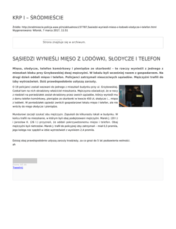KRP I – ŚRÓDMIEŚCIE Źródło: http://srodmiescie.policja.waw.pl/rs/aktualnosci/37787,Sasiedzi-wyniesli-mieso-z-lodowki-slodycze-i-telefon.html Wygenerowano: Wtorek, 7 marca 2017, 11:51 Strona znajduje się w archiwum. SĄSIEDZI WYNIEŚLI MIĘSO Z LODÓWKI, SŁODYCZE I TELEFON Mięso, słodycze, telefon komórkowy i pieniądze ze skarbonki – te rzeczy wynieśli z jednego z mieszkań bloku przy Grzybowskiej dwaj mężczyźni. W lokalu byli wcześniej razem z gospodarzem. Na drugi dzień oddali mięso i telefon. Policjanci zatrzymali nieuczciwych sąsiadów. Mężczyźni trafili do izby wytrzeźwień. Dziś prawdopodobnie usłyszą zarzuty. O 19 policjanci zostali wezwani do jednego z mieszkań budynku przy ul. Grzybowskiej. Czekał tam na nich okradziony właściciel mieszkania. Mężczyzna oświadczył, że w nocy z niedzieli na poniedziałek został okradziony przez swoich sąsiadów, którzy wynieśli mu z domu telefon komórkowy, pieniądze ze skarbonki w kwocie 450 zł, słodycze i… mięso z lodówki. W poniedziałek sąsiedzi zwrócili gospodarzowi lokalu mięso i telefon, ale nie wróciły do niego słodycze i pieniądze. Mundurowi zaczęli szukać obu mężczyzn. Zapukali do kilkunastu lokali w budynku. W końcu trafili na mieszkanie, w którym byli obaj podejrzewani mężczyźni. Marek J. (20 l.) i Jarosław K. (26 l.) przyznali, że oddali pokrzywdzonemu mięso i telefon. Obaj mężczyźni byli nietrzeźwi. Marek J. trafił do policyjnej izby zatrzymań – miał 0,3 promila, jego kolega noc spędził w izbie wytrzeźwień z wynikiem 2,4 promila. Dzisiaj obaj prawdopodobnie usłyszą zarzuty kradzieży, za co grozi do 5 lat pozbawienia wolności. ah Ocena: 0/5 (0) Tweetnij