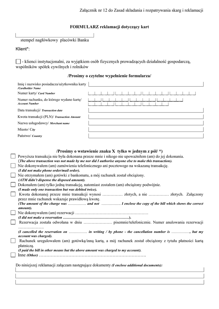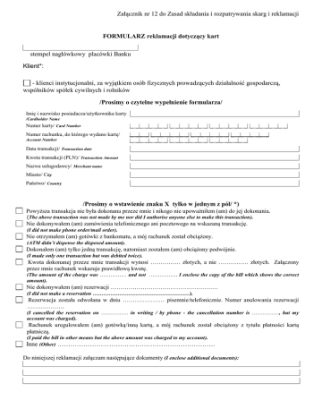 Załącznik nr 12 do Zasad składania i rozpatrywania skarg i reklamacji FORMULARZ reklamacji dotyczący kart stempel nagłówkowy placówki Banku Klient*: - klienci instytucjonalni, za wyjątkiem osób fizycznych prowadzących działalność gospodarczą, wspólników spółek cywilnych i rolników /Prosimy o czytelne wypełnienie formularza/ Imię i nazwisko posiadacza/użytkownika karty /Cardholder Name Numer karty/ Card Number |_ _|_ _|_ _|_ _| |_ _|_ _|_ _|_ _| |_ _|_ _|_ _|_ _| |_ _|_ _|_ _|_ _| Numer rachunku, do którego wydano kartę/ |_ _|_ _| |_ _|_ _|_ _|_ _| |_ _|_ _|_ _|_ _| |_ _|_ _|_ _|_ _| |_ _|_ _|_ _|_ _| |_ _|_ _|_ _|_ _| |_ _|_ _|_ _|_ _| Account Number Data transakcji/ Transaction date Kwota transakcji (PLN)/ Transaction Amount Nazwa usługodawcy/ Merchant name Miasto/ City Państwo/ Country /Prosimy o wstawienie znaku X tylko w jednym z pól/ *) Powyższa transakcja nie była dokonana przeze mnie i nikogo nie upoważniłem (am) do jej dokonania. (The above transaction was not made by me nor did I authorise anyone else to make this transaction). Nie dokonywałem (am) zamówienia telefonicznego ani pocztowego na wskazaną transakcję. (I did not make phone order/mail order). Nie otrzymałem (am) gotówki z bankomatu, a mój rachunek został obciążony. (ATM didn’t dispense the disposed amount). Dokonałem (am) tylko jedną transakcję, natomiast zostałem (am) obciążony podwójnie. (I made only one transaction but was debited twice). Kwota dokonanej przeze mnie transakcji wynosi …………… złotych, a nie …………… złotych. Załączony przez mnie rachunek wskazuje prawidłową kwotę. (The amount of the charge was …………… and not ……………. I enclose the copy of the bill which shows the correct amount). Nie dokonywałem (am) rezerwacji ……………………………………………… (I did not make a reservation ………………………………………………). Rezerwacja została odwołana w dniu ………………… pisemnie/telefonicznie. Numer anulowania rezerwacji ………………. (I cancelled the reservation on …………… in writing / by phone - the cancellation number is ……………, but my account was charged). Rachunek uregulowałem (am) gotówką/inną kartą, a mój rachunek został obciążony z tytułu płatności kartą płatniczą. (I paid the bill in other means but the above amount was charged to my account). Inne (Other) ………………………………………………………………. Do niniejszej reklamacji załączam następujące dokumenty (I enclose additional documents): Potwierdzam, że karta była cały czas w moim posiadaniu (I confirm that my card was In my possesion all the time) Miejscowość/City, data/date podpis posiadacza/użytkownika karty zgodny z podpisem na karcie/Signature Sposób przekazania odpowiedzi przez Bank na reklamację posiadacza/użytkownika karty*: listownie na adres korespondencyjny posiadacza /użytkownika karty, mailem na poniższy adres wskazany przez posiadacza /użytkownika karty (pismo w formacie PDF): …………………………………………………………………………………………………….. (adres mailowy do przekazania odpowiedzi na reklamację posiadacza/użytkownika karty) Potwierdzenie przyjęcia reklamacji przez Bank data, stempel funkcyjny i podpis pracownika placówki Banku oraz nr telefonu *) odpowiednie zaznaczyć