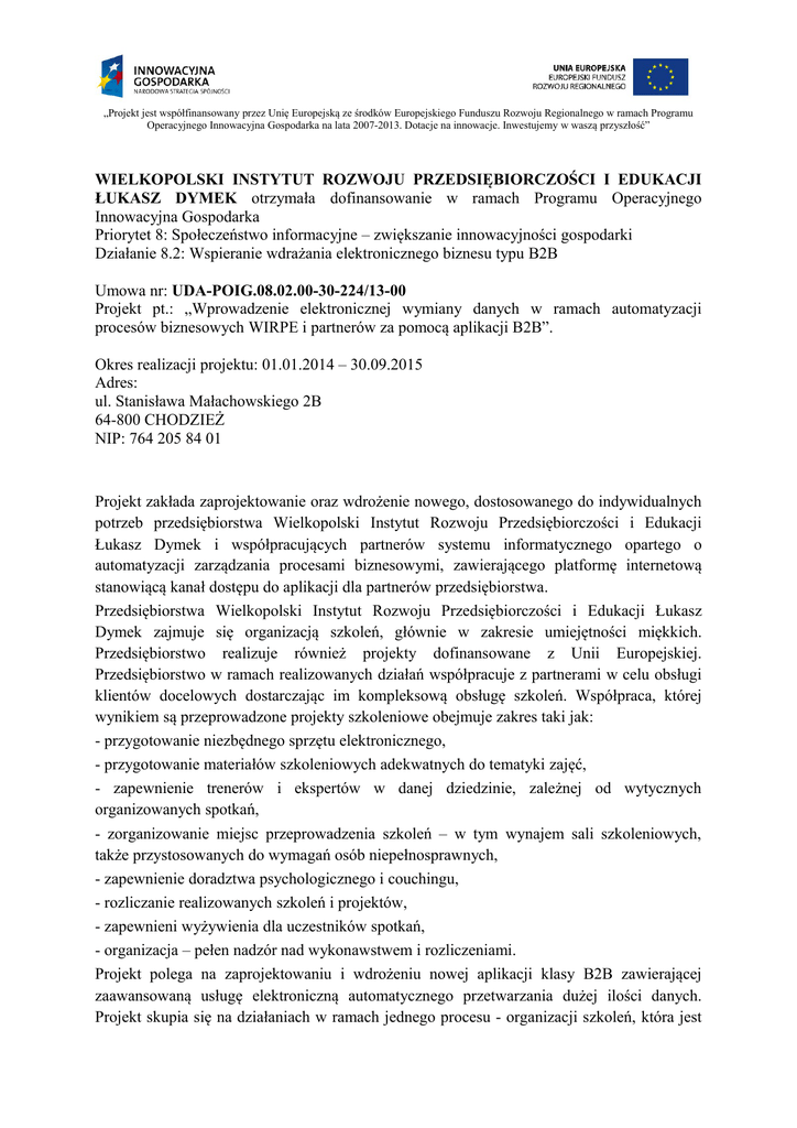 „Projekt jest współfinansowany przez Unię Europejską ze środków Europejskiego Funduszu Rozwoju Regionalnego w ramach Programu Operacyjnego Innowacyjna Gospodarka na lata 2007-2013. Dotacje na innowacje. Inwestujemy w waszą przyszłość” WIELKOPOLSKI INSTYTUT ROZWOJU PRZEDSIĘBIORCZOŚCI I EDUKACJI ŁUKASZ DYMEK otrzymała dofinansowanie w ramach Programu Operacyjnego Innowacyjna Gospodarka Priorytet 8: Społeczeństwo informacyjne – zwiększanie innowacyjności gospodarki Działanie 8.2: Wspieranie wdrażania elektronicznego biznesu typu B2B Umowa nr: UDA-POIG.08.02.00-30-224/13-00 Projekt pt.: „Wprowadzenie elektronicznej wymiany danych w ramach automatyzacji procesów biznesowych WIRPE i partnerów za pomocą aplikacji B2B”. Okres realizacji projektu: 01.01.2014 – 30.09.2015 Adres: ul. Stanisława Małachowskiego 2B 64-800 CHODZIEŻ NIP: 764 205 84 01 Projekt zakłada zaprojektowanie oraz wdrożenie nowego, dostosowanego do indywidualnych potrzeb przedsiębiorstwa Wielkopolski Instytut Rozwoju Przedsiębiorczości i Edukacji Łukasz Dymek i współpracujących partnerów systemu informatycznego opartego o automatyzacji zarządzania procesami biznesowymi, zawierającego platformę internetową stanowiącą kanał dostępu do aplikacji dla partnerów przedsiębiorstwa. Przedsiębiorstwa Wielkopolski Instytut Rozwoju Przedsiębiorczości i Edukacji Łukasz Dymek zajmuje się organizacją szkoleń, głównie w zakresie umiejętności miękkich. Przedsiębiorstwo realizuje również projekty dofinansowane z Unii Europejskiej. Przedsiębiorstwo w ramach realizowanych działań współpracuje z partnerami w celu obsługi klientów docelowych dostarczając im kompleksową obsługę szkoleń. Współpraca, której wynikiem są przeprowadzone projekty szkoleniowe obejmuje zakres taki jak: - przygotowanie niezbędnego sprzętu elektronicznego, - przygotowanie materiałów szkoleniowych adekwatnych do tematyki zajęć, - zapewnienie trenerów i ekspertów w danej dziedzinie, zależnej od wytycznych organizowanych spotkań, - zorganizowanie miejsc przeprowadzenia szkoleń – w tym wynajem sali szkoleniowych, także przystosowanych do wymagań osób niepełnosprawnych, - zapewnienie doradztwa psychologicznego i couchingu, - rozliczanie realizowanych szkoleń i projektów, - zapewnieni wyżywienia dla uczestników spotkań, - organizacja – pełen nadzór nad wykonawstwem i rozliczeniami. Projekt polega na zaprojektowaniu i wdrożeniu nowej aplikacji klasy B2B zawierającej zaawansowaną usługę elektroniczną automatycznego przetwarzania dużej ilości danych. Projekt skupia się na działaniach w ramach jednego procesu - organizacji szkoleń, która jest „Projekt jest współfinansowany przez Unię Europejską ze środków Europejskiego Funduszu Rozwoju Regionalnego w ramach Programu Operacyjnego Innowacyjna Gospodarka na lata 2007-2013. Dotacje na innowacje. Inwestujemy w waszą przyszłość” podstawą działalności firmy na rynku. Sama aplikacja będzie się składać z 8 powiązanych modułów, pozwalających na sprawne zarządzanie działaniami szkoleniowymi we współpracy z partnerami. Realizacja niniejszego projektu ma na celu wyeliminowanie barier organizacyjnych oraz usprawnienie działań przedsiębiorstwa z siedmioma partnerami współpracującymi z nim w branży szkoleniowej. Wielkopolski Instytut Rozwoju Przedsiębiorczości i Edukacji Łukasz Dymek zamierza stworzyć system elektronicznej komunikacji typu Business to Business wykorzystujący sieć Internet. Stworzone rozwiązanie informatyczne usprawni wymianę danych w ramach realizowanego procesu biznesowego wśród grupy podmiotów gospodarczych kooperujących z firmą. Zaprojektowanie i wdrożenie w firmie WIRPiE systemu informatycznego typu B2B podyktowane jest istnieniem potrzeby szerszej wymiany danych. W ramach realizowanego projektu zautomatyzowany zostanie jeden proces: 1) Proces organizacji szkoleń W ramach systemu zostanie stworzone 8 modułów składających się na system, odnoszących się wprost do procesu organizacji szkoleń. Wśród nich znajdują się: 1. Moduł rozliczeniowy, 2. Moduł organizacji terminów, 3. Moduł zarządzania obiektami, 4. Moduł zarządzania kadrą projektową, 5. Moduł przygotowania materiałów szkoleniowych, 6. Moduł zarządzania danymi uczestników, 7. Moduł zarządzania szkoleniami, 8. Moduł komunikacji i monitoringu. Projekt będzie składał się z czterech etapów, przy czym jego zakończenie planowane jest na dzień 30.09.2015 r. Wartość projektu: 813 000,00 PLN Wartość dofinansowania: 569 100,00PLN Zasięg projektu: międzynarodowy Rynek docelowy: Polska, Wielka Brytania