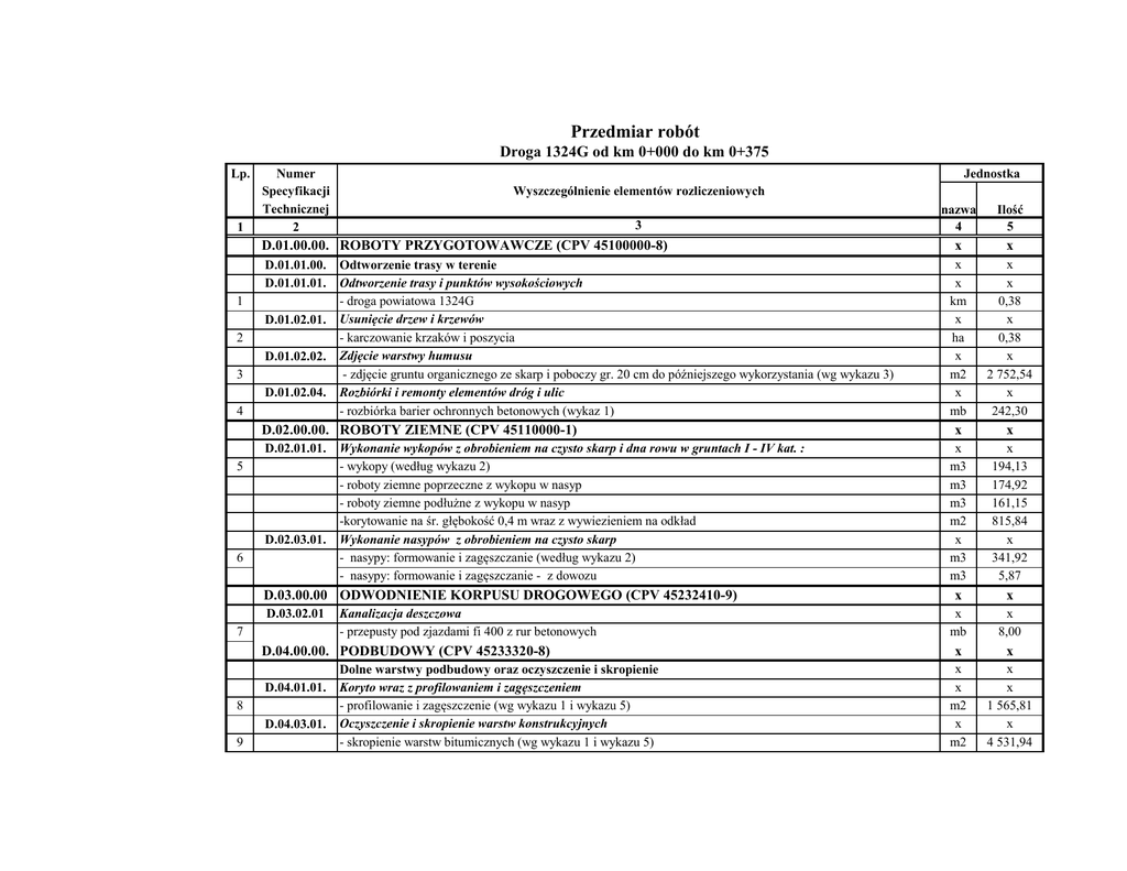 Przedmiar robót Droga 1324G od km 0+000 do km 0+375 Lp. 1 Numer Specyfikacji Technicznej 2 Jednostka Wyszczególnienie elementów rozliczeniowych 3 D.01.00.00. ROBOTY PRZYGOTOWAWCZE (CPV 45100000-8) D.01.01.00. D.01.01.01. 1 D.01.02.01. 2 D.01.02.02. 3 D.01.02.04. 4 Odtworzenie trasy w terenie Odtworzenie trasy i punktów wysokościowych - droga powiatowa 1324G Usunięcie drzew i krzewów - karczowanie krzaków i poszycia Zdjęcie warstwy humusu - zdjęcie gruntu organicznego ze skarp i poboczy gr. 20 cm do późniejszego wykorzystania (wg wykazu 3) Rozbiórki i remonty elementów dróg i ulic - rozbiórka barier ochronnych betonowych (wykaz 1) D.02.00.00. ROBOTY ZIEMNE (CPV 45110000-1) D.02.01.01. 5 D.02.03.01. 6 Wykonanie wykopów z obrobieniem na czysto skarp i dna rowu w gruntach I - IV kat. : - wykopy (według wykazu 2) - roboty ziemne poprzeczne z wykopu w nasyp - roboty ziemne podłużne z wykopu w nasyp -korytowanie na śr. głębokość 0,4 m wraz z wywiezieniem na odkład Wykonanie nasypów z obrobieniem na czysto skarp - nasypy: formowanie i zagęszczanie (według wykazu 2) - nasypy: formowanie i zagęszczanie - z dowozu D.03.00.00 ODWODNIENIE KORPUSU DROGOWEGO (CPV 45232410-9) D.03.02.01 7 Kanalizacja deszczowa - przepusty pod zjazdami fi 400 z rur betonowych D.04.00.00. PODBUDOWY (CPV 45233320-8) D.04.01.01. 8 D.04.03.01. 9 Dolne warstwy podbudowy oraz oczyszczenie i skropienie Koryto wraz z profilowaniem i zagęszczeniem - profilowanie i zagęszczenie (wg wykazu 1 i wykazu 5) Oczyszczenie i skropienie warstw konstrukcyjnych - skropienie warstw bitumicznych (wg wykazu 1 i wykazu 5) nazwa 4 Ilość 5 x x x x km x ha x m2 x mb x x 0,38 x 0,38 x 2 752,54 x 242,30 x x x m3 m3 m3 m2 x m3 m3 x 194,13 174,92 161,15 815,84 x 341,92 5,87 x x x mb x 8,00 x x x x m2 x m2 x x 1 565,81 x 4 531,94 Przedmiar robót Droga 1324G od km 0+000 do km 0+375 Lp. 1 10 11 Numer Specyfikacji Technicznej 2 D.04.04.01. 12 D.04.04.02. 13 D.04.05.01 14 D.04.07.01. 15 D.04.08.01. 16 Jednostka Wyszczególnienie elementów rozliczeniowych 3 - skropienie warstw niebitumicznych (wg wykazu 1 i wykazu 5) - oczyszczenie warstw bitumicznych (wg wykazu 1 i wykazu 5) Umocnienie poboczy z mieszanki optymalnej - umocnienie pobocza mieszanką optymalną o grubości 10 cm (wg wykazu 1) Podbudowa z kruszywa - podbudowa z kruszywa łamanego 0 - 31.5 grubości 20 cm (wg wykazu 1 i wykazu 5 ) Podbudowa z kruszyw ulepszonych cementem - grunt stabilizowany cementem Rm= 2,5MPa grubości 15 cm (wg wykazu 1 i wykazu 5 ) Podbudowa bitumiczna - z betonu asfaltowym o uziarnieniu 0/20 mm gr. 8 cm (wg wykazu 5 ) Wyrównanie istniejącej nawierzchni betonem asfaltowym: - betonem asfaltowym o uziarnieniu 0/16 mm (wg wykazu 4 ) D.05.00.00. NAWIERZCHNIE (CPV 45233220-7) x x x x m2 m2 x m2 x x 363,45 2 170,74 x 187,78 x x x m2 x 1 815,00 D.07.00.00. URZĄDZENIA BEZPIECZEŃSTWA RUCHU (CPV 45233150-5) x x Oznakowanie pionowe - słupki z rur stalowych (wg wykazu 6) - znaki drogowe średniej wielkości II generacji (wg wykazu 6) Bariery ochronne stalowe - bariery SP-09/4 nowe (wg wykazu 6) x szt szt x m x 2,00 2,00 x 244,00 D.05.03.00. D.05.03.05. 17 18 D.05.03.11 19 Nawierzchnie twarde ulepszone Nawierzchnie z betonu asfaltowego: - warstwa wiążąca grubości 6 cm o uz. 0/16 mm (wg wykazu 1 i wykazu 5) - warstwa ścieralna grubości 4 cm o uz. 0/11 mm (wg wykazu 1) Frezowanie istniejącej nawierzchni: -frezowanie nawierzchni bitumicznej na głębokośc śr. 2 cm (wg wykazu 4) D.06.00.00. ROBOTY WYKOŃCZENIOWE (CPV 233120-6) 06.01.01. 20 D.07.02.01. 21 22 D.07.05.01. 23 nazwa Ilość 4 5 m2 539,70 m2 4 531,94 x x m2 750,00 x x m2 539,70 x x m2 786,93 x x m2 363,45 x x m3 130,67 Umocnienie skarp i rowów przez humusowanie z obsianiem, darniowanie - humusowanie warstwą grub.10 cm (wg wykazu 3)