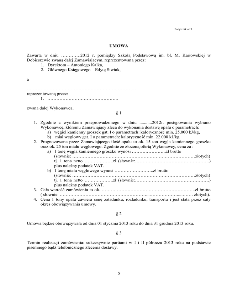 Załącznik nr 3 UMOWA Zawarta w dniu ………….2012 r. pomiędzy Szkołą Podstawową im. bł. M. Karłowskiej w Dobieszewie zwaną dalej Zamawiającym, reprezentowaną przez: 1. Dyrektora – Antoniego Kalka, 2. Głównego Księgowego – Edytę Siwiak, a ……………………………………………………………… reprezentowaną przez: 1. ……………………………………….. zwaną dalej Wykonawcą, §1 1. Zgodnie z wynikiem przeprowadzonego w dniu ...........2012r. postępowania wybrano Wykonawcę, któremu Zamawiający zleca do wykonania dostawę opału o parametrach: a) węgiel kamienny groszek gat. I o parametrach: kaloryczność min. 25.000 kJ/kg, b) miał węglowy gat. I o parametrach: kaloryczność min. 22.000 kJ/kg. 2. Prognozowana przez Zamawiającego ilość opału to ok. 15 ton węgla kamiennego groszku oraz ok. 25 ton miału węglowego. Zgodnie ze złożoną ofertą Wykonawcy, cena za : a) 1 tonę węgla kamiennego groszku wynosi …………………..zł brutto (słownie: ………………………………………………………………………złotych) tj. 1 tona netto ……………….zł (słownie:………………………………………….) plus należny podatek VAT. b) 1 tonę miału węglowego wynosi ……………………..zł brutto (słownie: ………………………………………………………………………złotych) tj. 1 tona netto ……………….zł (słownie:………………………………………….) plus należny podatek VAT. 3. Cała wartość zamówienia to ok. ……………………………………………………..zł brutto ( słownie: …………………………………………………...……………….....……. złotych). 4. Cena 1 tony opału zawiera cenę załadunku, rozładunku, transportu i jest stała przez cały okres obowiązywania umowy. §2 Umowa będzie obowiązywała od dnia 01 stycznia 2013 roku do dnia 31 grudnia 2013 roku. §3 Termin realizacji zamówienia: sukcesywnie partiami w I i II półroczu 2013 roku na podstawie pisemnego bądź telefonicznego zlecenia dostawy. 5 §4 Wykonawca zobowiązuje się zrealizować zlecenie dostawy w terminie 7 dni od jego otrzymania. §5 1. Zamawiający każdorazowo potwierdza odbiór dostawy opału i na podstawie potwierdzonego protokołu Wykonawca wystawia fakturę VAT. 2. Zamawiający zobowiązuje się zapłacić za wykonanie dostawy przelewem na konto Wykonawcy w terminie 14 dni od dania otrzymania faktury VAT. 3. W przypadku poddania opału kontroli zgodności z parametrami umowy, Zamawiający zapłaci za dostawę tej badanej partii opału, po uzyskaniu pozytywnego wyniku badania. §6 1. Zamawiający zastrzega sobie prawo kontroli jakości dostarczonego opału na koszt Wykonawcy, o czym zawiadomi Wykonawcę. 2. W przypadku wątpliwości, co do jakości węgla, Zamawiający pobierze próbkę z dostarczonej partii opału, celem wykonania analiz laboratoryjnych. W przypadku wyników analiz laboratoryjnych, które potwierdzą niezgodność parametrów węgla z parametrami określonymi w § 1 umowy, Zamawiający może żądać wymiany dostarczonej partii opału na wolny od wad. 3. Wymiana opału na zgodny z § 1 umowy winna być dokona w ciągu 3 dni od zgłoszenia niezgodności. §7 Zamawiającemu przysługuje prawo odstąpienia od umowy za 30-dniowym okresem wypowiedzenia w przypadku 3-krotnego dostarczenia wadliwego opału. §8 1. Strony zgodnie ustalają, że Wykonawca zapłaci Zamawiającemu kary umowne w następujących przypadkach: a) za zwłokę w wykonaniu przedmiotu umowy w wysokości 0,2% wartości brutto przedmiotu zamówienia, określonego w § 1 ust. 3 umowy - za każdy dzień zwłoki; b) za zwłokę w usunięciu wad stwierdzonych przy odbiorze lub w okresie eksploatacji w wysokości 0,2% wartości brutto przedmiotu zamówienia, określonego w § 1 ust. 3 umowy - za każdy dzień zwłoki liczony od dnia ich zgłoszenia; c) z tytułu odstąpienia od umowy z przyczyn występujących po stronie Wykonawcy w wysokości 10 % wartości całego zamówienia brutto określonej w § 1 ust. 3 umowy. 2. Strony zastrzegają prawo dochodzenia odszkodowania przewyższającego wysokość kar umownych zgodnie z art.477 Kodeksu Cywilnego. §9 W sprawach nie uregulowanych niniejszą umowy mają zastosowanie obowiązujące przepisy prawa. 6 § 10 Wszelkie zmiany niniejszej umowy wymagają zachowania formy pisemnej pod rygorem nieważności. § 11 Spory mogące wyniknąć na tle obowiązywania niniejszej umowy rozstrzygał będzie sąd właściwy dla siedziby Zamawiającego. § 12 Umowę sporządzono w dwóch jednobrzmiących egzemplarzach, po jednym dla każdej ze stron. ……………………………… …………………………… Zamawiający Dostawca 7