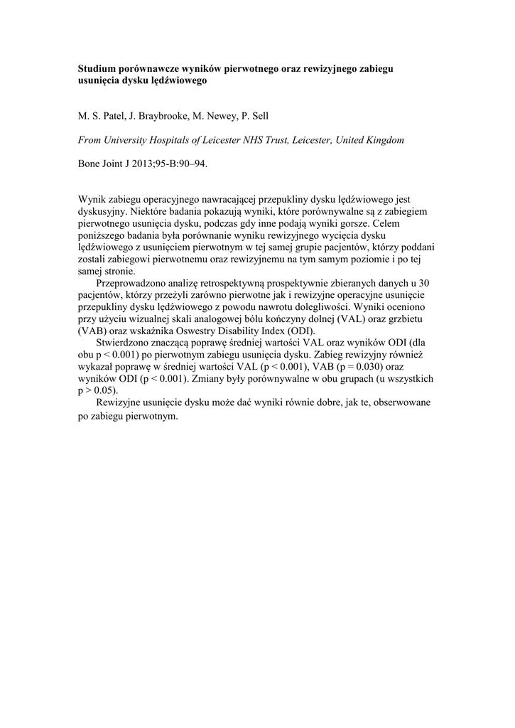 Studium porównawcze wyników pierwotnego oraz rewizyjnego zabiegu usunięcia dysku lędźwiowego M. S. Patel, J. Braybrooke, M. Newey, P. Sell From University Hospitals of Leicester NHS Trust, Leicester, United Kingdom Bone Joint J 2013;95-B:90–94. Wynik zabiegu operacyjnego nawracającej przepukliny dysku lędźwiowego jest dyskusyjny. Niektóre badania pokazują wyniki, które porównywalne są z zabiegiem pierwotnego usunięcia dysku, podczas gdy inne podają wyniki gorsze. Celem poniższego badania była porównanie wyniku rewizyjnego wycięcia dysku lędźwiowego z usunięciem pierwotnym w tej samej grupie pacjentów, którzy poddani zostali zabiegowi pierwotnemu oraz rewizyjnemu na tym samym poziomie i po tej samej stronie. Przeprowadzono analizę retrospektywną prospektywnie zbieranych danych u 30 pacjentów, którzy przeżyli zarówno pierwotne jak i rewizyjne operacyjne usunięcie przepukliny dysku lędźwiowego z powodu nawrotu dolegliwości. Wyniki oceniono przy użyciu wizualnej skali analogowej bólu kończyny dolnej (VAL) oraz grzbietu (VAB) oraz wskaźnika Oswestry Disability Index (ODI). Stwierdzono znaczącą poprawę średniej wartości VAL oraz wyników ODI (dla obu p < 0.001) po pierwotnym zabiegu usunięcia dysku. Zabieg rewizyjny również wykazał poprawę w średniej wartości VAL (p < 0.001), VAB (p = 0.030) oraz wyników ODI (p < 0.001). Zmiany były porównywalne w obu grupach (u wszystkich p > 0.05). Rewizyjne usunięcie dysku może dać wyniki równie dobre, jak te, obserwowane po zabiegu pierwotnym.