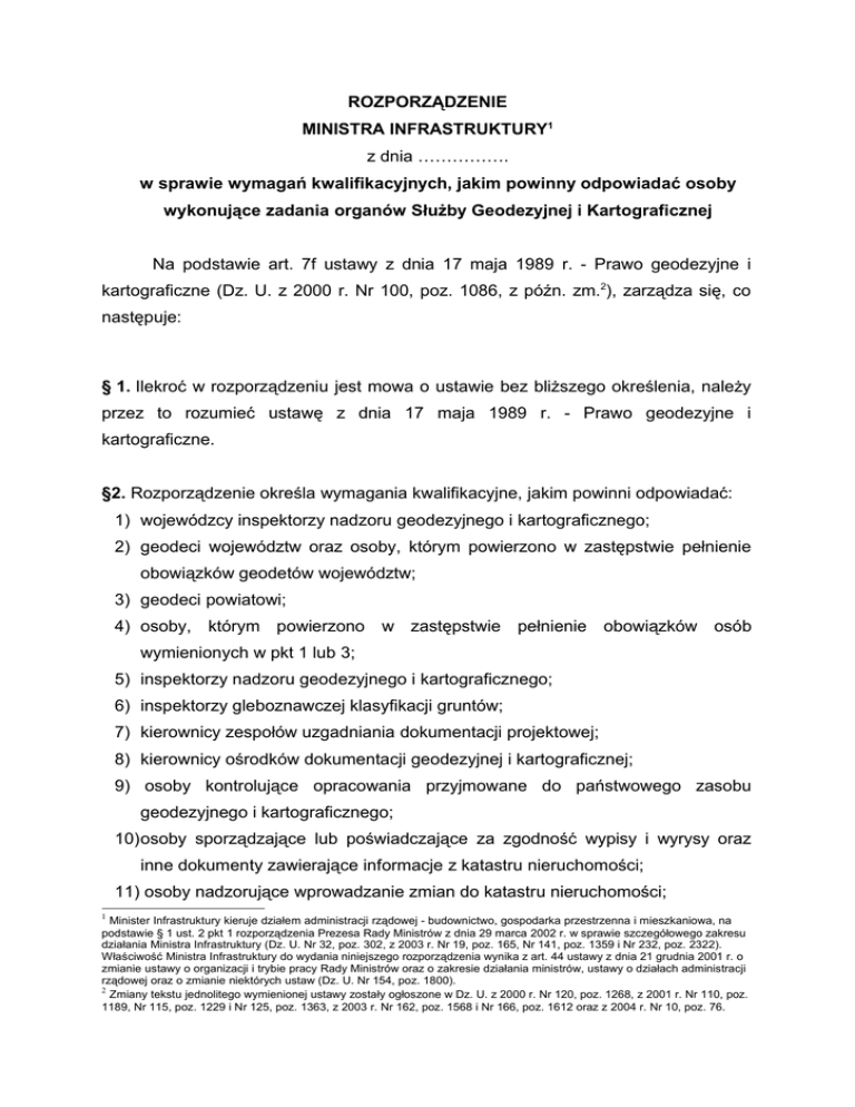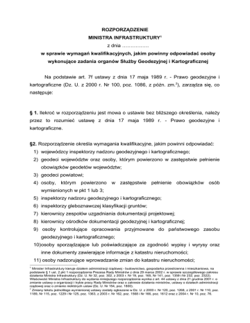 ROZPORZĄDZENIE MINISTRA INFRASTRUKTURY1 z dnia ……………. w sprawie wymagań kwalifikacyjnych, jakim powinny odpowiadać osoby wykonujące zadania organów Służby Geodezyjnej i Kartograficznej Na podstawie art. 7f ustawy z dnia 17 maja 1989 r. - Prawo geodezyjne i kartograficzne (Dz. U. z 2000 r. Nr 100, poz. 1086, z późn. zm.2), zarządza się, co następuje: § 1. Ilekroć w rozporządzeniu jest mowa o ustawie bez bliższego określenia, należy przez to rozumieć ustawę z dnia 17 maja 1989 r. - Prawo geodezyjne i kartograficzne. §2. Rozporządzenie określa wymagania kwalifikacyjne, jakim powinni odpowiadać: 1) wojewódzcy inspektorzy nadzoru geodezyjnego i kartograficznego; 2) geodeci województw oraz osoby, którym powierzono w zastępstwie pełnienie obowiązków geodetów województw; 3) geodeci powiatowi; 4) osoby, którym powierzono w zastępstwie pełnienie obowiązków osób wymienionych w pkt 1 lub 3; 5) inspektorzy nadzoru geodezyjnego i kartograficznego; 6) inspektorzy gleboznawczej klasyfikacji gruntów; 7) kierownicy zespołów uzgadniania dokumentacji projektowej; 8) kierownicy ośrodków dokumentacji geodezyjnej i kartograficznej; 9) osoby kontrolujące opracowania przyjmowane do państwowego zasobu geodezyjnego i kartograficznego; 10)osoby sporządzające lub poświadczające za zgodność wypisy i wyrysy oraz inne dokumenty zawierające informacje z katastru nieruchomości; 11) osoby nadzorujące wprowadzanie zmian do katastru nieruchomości; 1 Minister Infrastruktury kieruje działem administracji rządowej - budownictwo, gospodarka przestrzenna i mieszkaniowa, na podstawie § 1 ust. 2 pkt 1 rozporządzenia Prezesa Rady Ministrów z dnia 29 marca 2002 r. w sprawie szczegółowego zakresu działania Ministra Infrastruktury (Dz. U. Nr 32, poz. 302, z 2003 r. Nr 19, poz. 165, Nr 141, poz. 1359 i Nr 232, poz. 2322). Właściwość Ministra Infrastruktury do wydania niniejszego rozporządzenia wynika z art. 44 ustawy z dnia 21 grudnia 2001 r. o zmianie ustawy o organizacji i trybie pracy Rady Ministrów oraz o zakresie działania ministrów, ustawy o działach administracji rządowej oraz o zmianie niektórych ustaw (Dz. U. Nr 154, poz. 1800). 2 Zmiany tekstu jednolitego wymienionej ustawy zostały ogłoszone w Dz. U. z 2000 r. Nr 120, poz. 1268, z 2001 r. Nr 110, poz. 1189, Nr 115, poz. 1229 i Nr 125, poz. 1363, z 2003 r. Nr 162, poz. 1568 i Nr 166, poz. 1612 oraz z 2004 r. Nr 10, poz. 76. 12) osoby nadzorujące aktualizację mapy zasadniczej lub prace w zakresie katastru obiektów uzbrojenia terenu. § 3. Osobami, o których mowa w §2 pkt 1 mogą być osoby spełniające następujące wymagania: 1) korzystają w pełni z praw cywilnych i obywatelskich; 2) posiadają: a) dyplom ukończenia studiów wyższych na kierunku geodezyjnym; b) uprawnienia do wykonywania samodzielnych funkcji w dziedzinie geodezji i kartografii w zakresach, o których mowa w art. 43 pkt 1 i 2 ustawy; c) 5-letni staż pracy w urzędach administracji rządowej lub w urzędach jednostek samorządu terytorialnego, przy czym 2-letni staż na stanowisku kierowniczym. § 4. Osobami, o których mowa w §2 pkt 3 lub 4 mogą być osoby spełniające następujące wymagania: 1) korzystają w pełni z praw cywilnych i obywatelskich; 2) posiadają: a) dyplom ukończenia studiów wyższych na kierunku geodezyjnym; b) uprawnienia do wykonywania samodzielnych funkcji w dziedzinie geodezji i kartografii w zakresach, o których mowa w art. 43 pkt 1 i 2 ustawy; c) 3-letni staż pracy w urzędach administracji rządowej lub w urzędach jednostek samorządu terytorialnego. § 5. Osobami, o których mowa w §2 pkt 2 mogą być osoby spełniające następujące wymagania: 1) korzystają w pełni z praw cywilnych i obywatelskich; 2) posiadają: a) dyplom ukończenia studiów wyższych na kierunku geodezyjnym; b) uprawnienia do wykonywania samodzielnych funkcji w dziedzinie geodezji i kartografii w zakresach, o których mowa w art. 43 pkt 1 i 2 ustawy; c) 3-letni staż pracy w urzędach administracji rządowej lub w urzędach jednostek samorządu terytorialnego. § 6. Osobami, o których mowa w §2 pkt 5 lub 8 mogą być osoby spełniające następujące wymagania: 1) korzystają w pełni z praw cywilnych i obywatelskich; 2) posiadają: a) dyplom ukończenia studiów wyższych na kierunku geodezyjnym; b) uprawnienia do wykonywania samodzielnych funkcji w dziedzinie geodezji i kartografii w zakresach, o których mowa w art. 43 pkt 1 i 2 ustawy, a w wypadku kierowników centralnego i wojewódzkich ośrodków dokumentacji geodezyjnej i kartograficznej również w zakresach, o których mowa w art. 43 pkt 6 lub 7 ustawy; c) 2-letni staż pracy w urzędach administracji rządowej lub w urzędach jednostek samorządu terytorialnego. § 7. Osobami, o których mowa w §2 pkt 6 mogą być osoby spełniające następujące wymagania: 1) korzystają w pełni z praw cywilnych i obywatelskich; 2) posiadają: a) dyplom ukończenia studiów wyższych; b) uprawnienia do wykonywania samodzielnych funkcji w dziedzinie geodezji i kartografii w zakresie, o którym mowa w art. 43 pkt 9 ustawy; c) 2-letni staż pracy w urzędach administracji rządowej lub w urzędach jednostek samorządu terytorialnego. § 8. Osobami, o których mowa w §2 pkt 7 mogą być osoby spełniające następujące wymagania: 1) korzystają w pełni z praw cywilnych i obywatelskich; 2) posiadają: a) dyplom ukończenia studiów wyższych na kierunku geodezyjnym; b) uprawnienia do wykonywania samodzielnych funkcji w dziedzinie geodezji i kartografii w zakresie, o którym mowa w art. 43 pkt 1 ustawy; c) 2-letni staż pracy w urzędach administracji rządowej lub w urzędach jednostek samorządu terytorialnego. § 9. Osobami, o których mowa w §2 pkt 9 mogą być osoby spełniające następujące wymagania: 1) korzystają w pełni z praw cywilnych i obywatelskich; 2) posiadają: a) dyplom ukończenia studiów wyższych na kierunku geodezyjnym; b) uprawnie