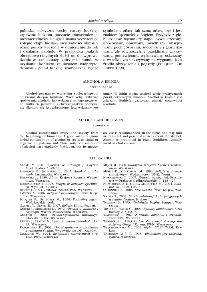 Alkohol a religia pobudza mistyczne cechy natury ludzkiej, zapewnia ludziom poczucie transcendencji, nieśmiertelności. Religia i nauka wyznaczając kolejne etapy ludzkiej świadomości określiły różne punkty widzenia w odniesieniu do roli i działania alkoholu. W przypadku praktyk obrzędowo-religijnych służył on do wprowadzenia w stan ekstazy, który miał pomóc w uzyskaniu kontaktu ze światem nadprzyrodzonym i pełnił funkcję symboliczną, będąc 19 symbolem ofiary lub samą ofiarą, był i jest znakiem łączności z Bogiem. Przybyły z głębi dziejów tajemniczy napój bywał czczony, ubóstwiany, opiewany, uwielbiany, obsypywany pochlebstwami, adorowany i gloryfikowany, ale równocześnie przeklinany, zakazywany, poniewierany, wyśmiewany, oskarżany o wszelkie zło i skazywany na wygnanie jako źródło obrzydzenia i pogardy (Fouquet i De Borde 1990). ALKOHOL A RELIGIA Streszczenie Alkohol towarzyszy wszystkim społeczeństwom od zarania dziejów ludzkości. Wiele religii zakazuje spożywania alkoholu lub wskazuje na jego negatywne skutki. W judaizmie i chrześcijaństwie spożywanie alkoholu nie jest zabronione, lecz wskazany jest umiar. W Biblii można znaleźć wiele praktycznych porad dotyczących alkoholu. Alkohol w Islamie jest zakazany. Buddyści zazwyczaj unikają spożywania alkoholu. ALCOHOL AND RELIGION Summary Alcohol accompanies every one society from the beginning of humanity. A good many religions forbid consumption of alcohol or see it as sinful or negative. In Judaism and Christianity, consumption of alcohol isn’t explicitly forbidden, but its moder- ate use is recommended. In the Bible, one may find many useful and practical advices about the alcohol. Alcohol is prohibited in Islam. Buddhists typically avoid alcohol consumption. LITERATURA Abdall M., 2001. Żywność w mitologii. J. Assyrian Acad. Studies 2, 49–67. Anderson P., Baumberg B., 2007. Alkohol a człowiek. Parpamedia, Warszawa. Bielawski J., 1980. Islam. Krajowa Agencja Wydawnicza, Warszawa. Bohdanowicz J., 1995. Religie w dziejach cywilizacji. Wyd. UG, Gdańsk. Bright J., 1994. Historia Izraela. PAX, Warszawa. Favazza A., 2006. Religia i psychologia. Świat Książki, Warszawa. Fouquet P., De Borde M., 1990. Podwójny agent. Wyd. Łódzkie, Łódź. Gabriel T., Geaves R., 2007. Religie. Elipsa, Poznań. Górski J., Moczarski K., 1972. Alkohol w kulturze i obyczaju. Wiedza Powszechna, Warszawa. Griffith E., 2001. Alkohol-tajemnicza substancja. Klub dla Ciebie, Warszawa. Kinney J., Leaton G., 1996. Zrozumieć alkohol. PARPA, Warszawa. Kościelniak K., 2002. Chrześcijaństwo w spotkaniu z religiami świata. Wydawnictwo „M”, Kraków. Langauer W., 1994. Religijność starożytnych Greków. PWN, Warszawa. Mejor M., 1980. Buddyzm. Krajowa Agencja Wydawnicza, Warszawa. Musiał D., Ziółkowski M., 1993. Religie w świecie starożytnym. Wydawnictwa UMK, Toruń. Niesiorowski T., 2007. Historia uzależnień. Psychiatria w Praktyce Ogólnolekarskiej 7, 118–127. Niewiadomska I., Sikora-Głodowicz M., 2004. Alkohol. Gaudium, Lublin. O’Donnell K., 2005. Idee świata. Świat Książki, Warszawa. Sikora T., 2003. Użycie substancji halucynogennych a religia. Nomos, Kraków. Tokarski S., 1993. Wędrówka bogów. Semper, Warszawa. Trybuś J., Piątek G., 2004. Rytuały alkoholowe. Czas kultury 2–3, 82–90. Wachholz L., 1967. Z historii alkoholu i alkoholizmu. TPK, Warszawa. Winniczuk L., 1983. Ludzie, Zwyczaje i obyczaje starożytnej Grecji i Rzymu. PWN, Warszawa. Wojciechowski M., 2009. Etyka Biblii. WAM, Kraków. Woronowicz B. T., 1998. Alkoholizm jest chorobą. PARPA, Warszawa.