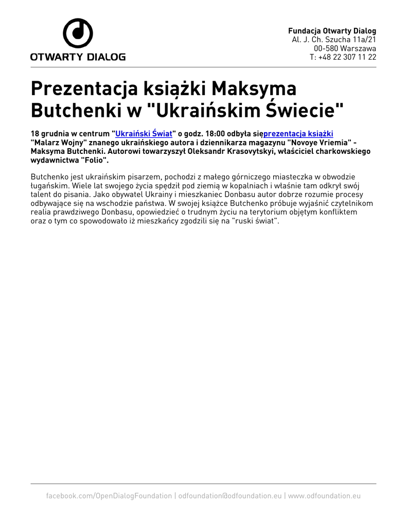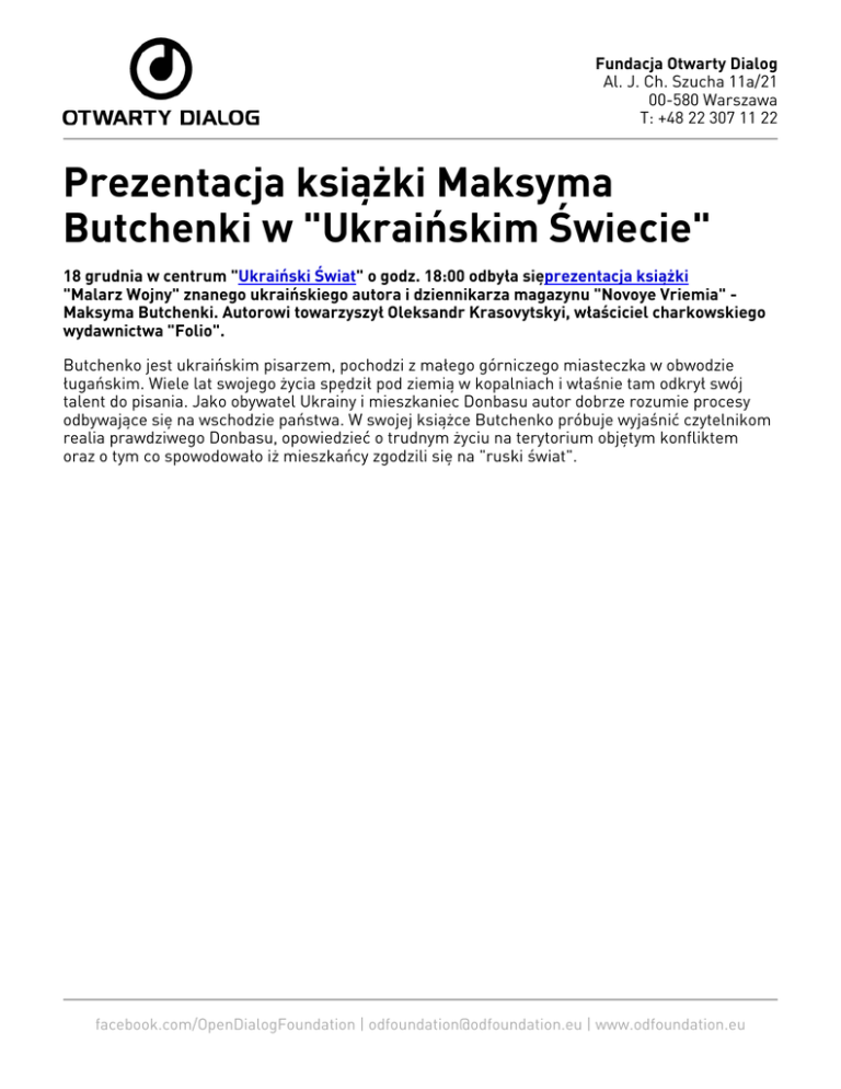 Fundacja Otwarty Dialog Al. J. Ch. Szucha 11a/21 00-580 Warszawa T: +48 22 307 11 22 Prezentacja książki Maksyma Butchenki w "Ukraińskim Świecie" 18 grudnia w centrum "Ukraiński Świat" o godz. 18:00 odbyła sięprezentacja książki "Malarz Wojny" znanego ukraińskiego autora i dziennikarza magazynu "Novoye Vriemia" Maksyma Butchenki. Autorowi towarzyszył Oleksandr Krasovytskyi, właściciel charkowskiego wydawnictwa "Folio". Butchenko jest ukraińskim pisarzem, pochodzi z małego górniczego miasteczka w obwodzie ługańskim. Wiele lat swojego życia spędził pod ziemią w kopalniach i właśnie tam odkrył swój talent do pisania. Jako obywatel Ukrainy i mieszkaniec Donbasu autor dobrze rozumie procesy odbywające się na wschodzie państwa. W swojej książce Butchenko próbuje wyjaśnić czytelnikom realia prawdziwego Donbasu, opowiedzieć o trudnym życiu na terytorium objętym konfliktem oraz o tym co spowodowało iż mieszkańcy zgodzili się na "ruski świat". facebook.com/OpenDialogFoundation | [email protected] | www.odfoundation.eu
