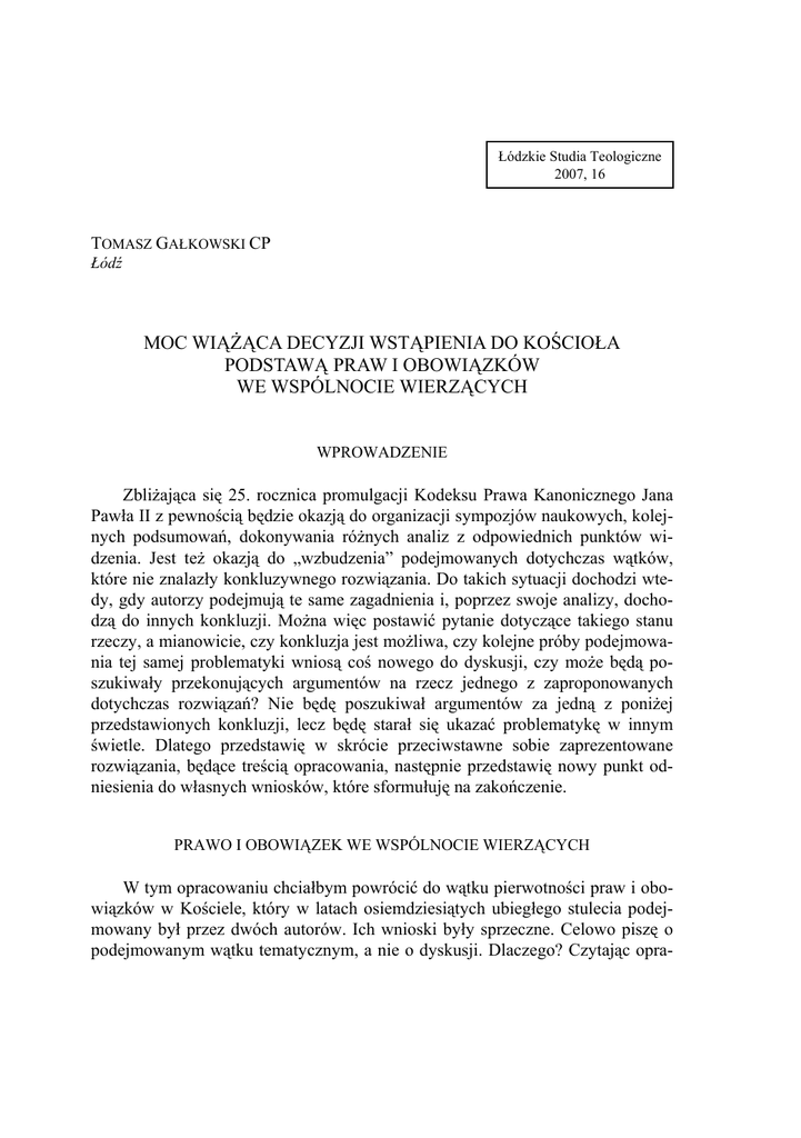 Łódzkie Studia Teologiczne 2007, 16 TOMASZ GAŁKOWSKI CP Łódź MOC WIĄŻĄCA DECYZJI WSTĄPIENIA DO KOŚCIOŁA PODSTAWĄ PRAW I OBOWIĄZKÓW WE WSPÓLNOCIE WIERZĄCYCH WPROWADZENIE Zbliżająca się 25. rocznica promulgacji Kodeksu Prawa Kanonicznego Jana Pawła II z pewnością będzie okazją do organizacji sympozjów naukowych, kolejnych podsumowań, dokonywania różnych analiz z odpowiednich punktów widzenia. Jest też okazją do „wzbudzenia” podejmowanych dotychczas wątków, które nie znalazły konkluzywnego rozwiązania. Do takich sytuacji dochodzi wtedy, gdy autorzy podejmują te same zagadnienia i, poprzez swoje analizy, dochodzą do innych konkluzji. Można więc postawić pytanie dotyczące takiego stanu rzeczy, a mianowicie, czy konkluzja jest możliwa, czy kolejne próby podejmowania tej samej problematyki wniosą coś nowego do dyskusji, czy może będą poszukiwały przekonujących argumentów na rzecz jednego z zaproponowanych dotychczas rozwiązań? Nie będę poszukiwał argumentów za jedną z poniżej przedstawionych konkluzji, lecz będę starał się ukazać problematykę w innym świetle. Dlatego przedstawię w skrócie przeciwstawne sobie zaprezentowane rozwiązania, będące treścią opracowania, następnie przedstawię nowy punkt odniesienia do własnych wniosków, które sformułuję na zakończenie. PRAWO I OBOWIĄZEK WE WSPÓLNOCIE WIERZĄCYCH W tym opracowaniu chciałbym powrócić do wątku pierwotności praw i obowiązków w Kościele, który w latach osiemdziesiątych ubiegłego stulecia podejmowany był przez dwóch autorów. Ich wnioski były sprzeczne. Celowo piszę o podejmowanym wątku tematycznym, a nie o dyskusji. Dlaczego? Czytając opra- 52 TOMASZ GAŁKOWSKI cowania tematyczne E. Corecco1 i R. Sobańskiego2, można łatwo w nich dostrzec, że autorzy przytaczają opinię przeciwną, ale nie ustosunkowują się do niej, nie wchodzą w polemikę z jej autorem, lecz prezentują własny pogląd i własne wnioski. Rodzi się nieuchronnie następujące pytanie: czy może dwa rozwiązania nie stoją w sprzeczności ze sobą?; czy nie są jednak wzajemnie się wykluczające? Obaj znamienici kanoniści przedstawiają odpowiedź na następujące pytanie: czy w Kościele mamy do czynienia z sytuacją pierwotności praw wierzących w stosunku do ich obowiązków, czy raczej mamy do czynienia z sytuacja odwrotną, pierwotności obowiązków w stosunku do praw? Zwolennikiem pozytywnej odpowiedzi na pierwszą część postawionego powyżej pytania jest R. Sobański, natomiast na pozycji przeciwnej znajdują się poglądy E. Corecco. Analizowany problem pojawił się wraz z promulgacją nowego kodeksu prawa kanonicznego, który po raz pierwszy dokonał systematyzacji praw i obowiązków wiernych w Kościele. Pierwszy kodeks prawa kanonicznego w inny sposób podjął tematykę praw wiernych. Nie dokonał ich systematyzacji na zasadzie techniki publicznego prawa konstytucyjnego, lecz na podobieństwo kodyfikacji prawa prywatnego i w obrębie prawa procesowego, mówiąc o prawach i przywilejach jedynie osób duchownych (kan. 118–144), o obowiązkach i przywilejach, a nie o prawach, osób konsekrowanych (kan. 592–631). Kodeks nie zawierał systematycznego układu praw wszystkich wiernych, ani praw wiernych świeckich. W odniesieniu do praw wiernych świeckich, kodeks mówił jedynie o stowarzyszeniach wiernych. Pierwszy kodeks prawa kanonicznego nie był stały w stosowaniu jednakowej kolejności wtedy, gdy mówił o prawach i obowiązkach poszczególnych stanów osób w Kościele. W przypadku osób duchownych stosuje kolejność prawo (przywilej), a następnie obowiązek. W odniesieniu do osób konsekrowanych stosuje kolejność odwrotną, mówiąc o ich obowiązkach i prawach. W kanonach, w których używane są w jednym sformułowaniu prawo i obowiązek, daje pierwszeństwo prawu (np. ius et obligatio w kan. 335 §1; 513 §1; 1381 §2; 1395 §1). Biorąc za przykład dekretalistów, można by stwierdzić, że w tradycji kanonicznej mamy do czynienia z uprzywilejowaniem praw w stosunku do obowiązków3. Odwołując się jednak do sformułowań pierwszego kodeksu, trudno raczej się zgodzić, by ta tradycja była w pełni podtrzymana i by kodeks podobnie jak dekre- 1 E. Corecco, Considerazioni sul problema dei diritti fondamentali del cristiano nella Chiesa e nella società, w: Ius et Communio, Scritti di Diritto Canonico, Casale Monferrato, t. 1, s. 245–278; Il catalogo dei doveri-diritti del fedele nel CIC, w: tamże, s. 486–521. 2 R. Sobański, «Iura propter officia»? Remarques liees aux en-tetes de Ier et Ie titres du Livre II du nouveau CIC, w: Vitam impendere vero. Studi in onore di Pio Ciprotti (Utrumque ius 14), Roma 1986, s. 221–233; Eclesiologia del nuovo codice di diritto canonico, w: Realtà teologica e giuridica del diritto ecclesiale, Torino 1933, s. 167–206; Obraz człowieka w prawie, w: Ksiądz rektor Remigiusz Sobański. Uczony, nauczyciel, sędzia, red. W. Góralski, Warszawa 2005, s. 150–164; Znaczenie pojęcia osoby w kanonicznym porządku prawnym, „Prawo Kanoniczne” 40 (1977), s. 3–13. 3 I. Antonelli, Tractatus posthumus de Iuribus et Oneribus Clericorum, Romae 1699. MOC WIĄŻĄCA DECYZJI WSTĄPIENIA DO KOŚCIOŁA… 53 taliści, zachowywał porządek, w którym uprzywilejowane miejsce przyznawane jest prawom przed obowiązkami. Z zupełnie nową sytuacją spotykamy się w obecnie obowiązującym kodeksie prawa kanonicznego. Nowość ta dotyczy przede wszystkim konsekwencji sformułowań. W tytułach poświęconych systematyzacji praw i obowiązków znajduje się konsekwentnie stosowane sformułowanie obligationes et iura (ks. II, cz. II, tytuł I i II; ks. II, cz. II., tytuł III, rozdział III; ks. II, cz. III, tytuł II, rozdział IV). Trudno jednak o zupełnej nowości mówić poprzez odwołanie się do systematyki poprzedniego kodeksu, który też (jak w przypadku osób zakonnych) mówił o obowiązkach 