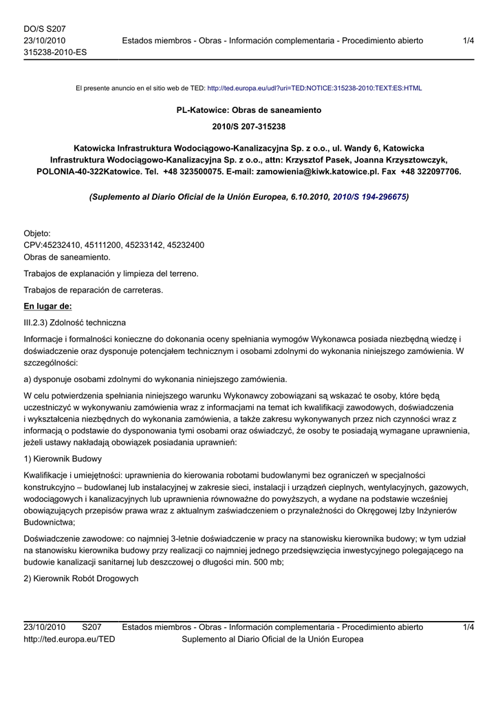 DO/S S207 23/10/2010 315238-2010-ES Estados miembros - Obras - Información complementaria - Procedimiento abierto 1/4 El presente anuncio en el sitio web de TED: http://ted.europa.eu/udl?uri=TED:NOTICE:315238-2010:TEXT:ES:HTML PL-Katowice: Obras de saneamiento 2010/S 207-315238 Katowicka Infrastruktura Wodociągowo-Kanalizacyjna Sp. z o.o., ul. Wandy 6, Katowicka Infrastruktura Wodociągowo-Kanalizacyjna Sp. z o.o., attn: Krzysztof Pasek, Joanna Krzysztowczyk, POLONIA-40-322Katowice. Tel. +48 323500075. E-mail: [email protected]. Fax +48 322097706. (Suplemento al Diario Oficial de la Unión Europea, 6.10.2010, 2010/S 194-296675) Objeto: CPV:45232410, 45111200, 45233142, 45232400 Obras de saneamiento. Trabajos de explanación y limpieza del terreno. Trabajos de reparación de carreteras. En lugar de: III.2.3) Zdolność techniczna Informacje i formalności konieczne do dokonania oceny spełniania wymogów Wykonawca posiada niezbędną wiedzę i doświadczenie oraz dysponuje potencjałem technicznym i osobami zdolnymi do wykonania niniejszego zamówienia. W szczególności: a) dysponuje osobami zdolnymi do wykonania niniejszego zamówienia. W celu potwierdzenia spełniania niniejszego warunku Wykonawcy zobowiązani są wskazać te osoby, które będą uczestniczyć w wykonywaniu zamówienia wraz z informacjami na temat ich kwalifikacji zawodowych, doświadczenia i wykształcenia niezbędnych do wykonania zamówienia, a także zakresu wykonywanych przez nich czynności wraz z informacją o podstawie do dysponowania tymi osobami oraz oświadczyć, że osoby te posiadają wymagane uprawnienia, jeżeli ustawy nakładają obowiązek posiadania uprawnień: 1) Kierownik Budowy Kwalifikacje i umiejętności: uprawnienia do kierowania robotami budowlanymi bez ograniczeń w specjalności konstrukcyjno – budowlanej lub instalacyjnej w zakresie sieci, instalacji i urządzeń cieplnych, wentylacyjnych, gazowych, wodociągowych i kanalizacyjnych lub uprawnienia równoważne do powyższych, a wydane na podstawie wcześniej obowiązujących przepisów prawa wraz z aktualnym zaświadczeniem o przynależności do Okręgowej Izby Inżynierów Budownictwa; Doświadczenie zawodowe: co najmniej 3-letnie doświadczenie w pracy na stanowisku kierownika budowy; w tym udział na stanowisku kierownika budowy przy realizacji co najmniej jednego przedsięwzięcia inwestycyjnego polegającego na budowie kanalizacji sanitarnej lub deszczowej o długości min. 500 mb; 2) Kierownik Robót Drogowych 23/10/2010 S207 Estados miembros - Obras - Información complementaria - Procedimiento abierto http://ted.europa.eu/TED Suplemento al Diario Oficial de la Unión Europea 1/4 DO/S S207 23/10/2010 315238-2010-ES Estados miembros - Obras - Información complementaria - Procedimiento abierto 2/4 Kwalifikacje i umiejętności: uprawnienia do kierowania robotami budowlanymi bez ograniczeń w specjalności drogowej lub uprawnienia równoważne do powyższych, a wydane na podstawie wcześniej obowiązujących przepisów prawa wraz z aktualnym zaświadczeniem o przynależności do Okręgowej Izby Inżynierów Budownictwa. Jeżeli wskazane osoby nie posiadają biegłej znajomości języka polskiego, Wykonawca jest zobowiązany zapewnić co najmniej jednego tłumacza na czas obowiązywania Umowy. Zamawiający dopuszcza łączenie funkcji przez wskazane osoby, które będą wykonywać niniejsze zamówienie, pod warunkiem, że osoba ta spełnia łącznie wymagania dla każdej z łączonych funkcji, z wyjątkiem przypadków określonych w Prawie Budowlanym. Wymagane w tym punkcie okresy doświadczenia zawodowego, należy liczyć od dnia uzyskania uprawnień do upływu terminu składania ofert. b) wykonał w okresie ostatnich pięciu lat przed upływem terminu składania ofert w postępowaniu, a jeżeli okres prowadzenia działalności jest krótszy w tym okresie co najmniej jedną robotę budowlaną polegającą na budowie kanalizacji sanitarnej lub deszczowej o długości min. 500 mb. W celu potwierdzenia spełniania warunków Wykonawcy zobowiązani są przedłożyć następujące dokumenty: 1) wykaz osób, które będą uczestniczyć w wykonywaniu zamówienia, w charakterze kluczowych specjalistów wymienionych w pkt. a)1))÷2))oraz informację o podstawie dysponowania tymi osobami, sporządzony według wzoru stanowiącego załącznik nr 3 do IDW, I. informacje o tych osobach sporządzone według wzoru stanowiącego załącznik nr 4 do IDW, na temat ich kwalifikacji zawodowych, doświadczenia i wykształcenia niezbędnych do wykonania zamówienia, a także zakresu wykonywanych przez nich czynności oraz, II. oświadczenie sporządzone według wzoru stanowiącego załącznik nr 3a, że osoby te posiadają wymagane uprawnienia, jeżeli ustawy nakładają obowiązek posiadania uprawnień (w przypadku wspólnego ubiegania się dwóch lub więcej Wykonawców o udzielenie niniejszego zamówienia, oceniany będzie ich łączny potencjał kadrowy oraz łączne kwalifikacje i doświadczenie); 2) wykaz wykonanych robót budowlanych w okresie ostatnich 5 lat przed terminem składania ofert, a jeżeli okres prowadzenia działalności jest krótszy – w tym okresie, z podaniem ich rodzaju i wartości oraz daty i miejsca wykonania, sporządzony według wzoru stanowiącego załącznik nr 5 do IDW oraz załączyć dokumenty potwierdzające, że roboty te zostały wykonane zgodnie z zasadami sztuki budowlanej i prawidłowo ukończone (w przypadku wspólnego ubiegania się dwóch lub więcej Wykonawców o udzielenie niniejszego zamówienia, oceniane będzie ich łączne doświadczenie). Jeżeli Wykonawca wykazując spełnienie warunków, o których mowa w niniejszym pkt., polega za zasobach innych podmiotów na zasadach określonych w art. 26 ust. 2b ustawy, a podmioty te będą brały udział w realizacji części zamówienia, Zamawiający żąda przedstawienia w odniesieniu do tych podmiotów dokumentów wymienionych w pkt. III.2.1). pkt. 2)-6). Ocena