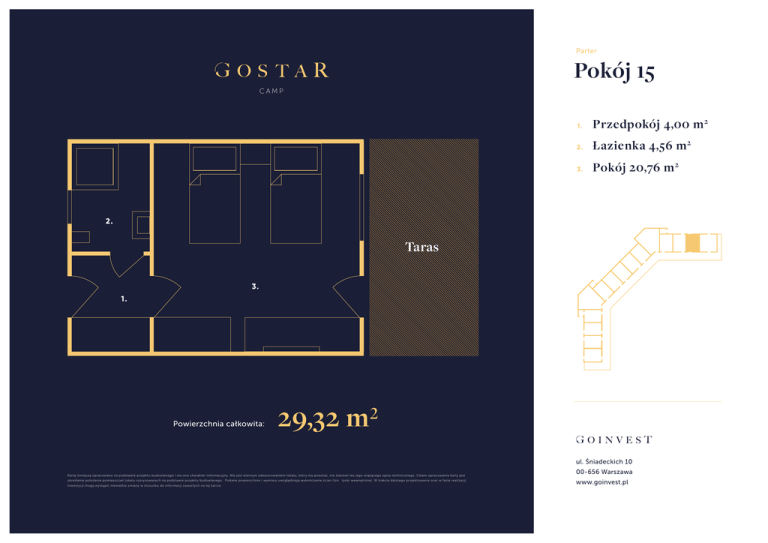 Parter Pokój 15 CAMP 1. Przedpokój 4,00 m 2 2. Łazienka 4,56 m 2 3. Pokój 20,76 m 2 2. Taras 3. 1. Powierzchnia całkowita: 29,32 m² ul. Śniadeckich 10 Kartę niniejszą opracowano na podstawie projektu budowlanego i ma ona charakter informacyjny. Nie jest wiernym odwzorowaniem lokalu, który ma powstać, nie stanowi też jego wiążącego opisu technicznego. Celem opracowania karty jest określenie położenia pomieszczeń lokalu rozrysowanych na podstawie projektu budowlanego. Podane powierzchnie i wymiary uwzględniają wykończenie ścian (tzn. tynki wewnętrzne). W trakcie dalszego projektowania oraz w fazie realizacji inwestycji mogą wystąpić niewielkie zmiany w stosunku do informacji zawartych na tej karcie. 00-656 Warszawa www.goinvest.pl
