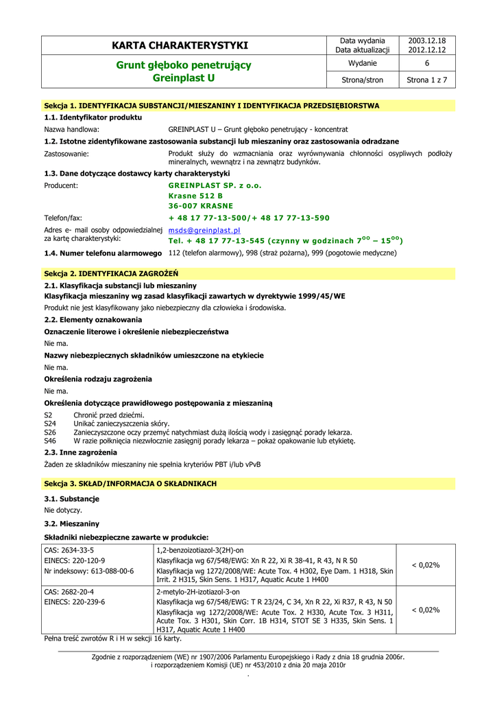 KARTA CHARAKTERYSTYKI Grunt głęboko penetrujący Greinplast U Data wydania Data aktualizacji 2003.12.18 2012.12.12 Wydanie 6 Strona/stron Strona 1 z 7 Sekcja 1. IDENTYFIKACJA SUBSTANCJI/MIESZANINY I IDENTYFIKACJA PRZEDSIĘBIORSTWA 1.1. Identyfikator produktu Nazwa handlowa: GREINPLAST U – Grunt głęboko penetrujący - koncentrat 1.2. Istotne zidentyfikowane zastosowania substancji lub mieszaniny oraz zastosowania odradzane Produkt służy do wzmacniania oraz wyrównywania chłonności osypliwych podłoży mineralnych, wewnątrz i na zewnątrz budynków. Zastosowanie: 1.3. Dane dotyczące dostawcy karty charakterystyki Producent: GREINPLAST SP. z o.o. Krasne 512 B 36-007 KRASNE Telefon/fax: + 48 17 77- 13-500/+ 48 17 77-13-590 Adres e- mail osoby odpowiedzialnej [email protected] za kartę charakterystyki: Tel. + 48 17 77-13-545 (czynny w godzina ch 7 O O – 15 O O ) 1.4. Numer telefonu alarmowego 112 (telefon alarmowy), 998 (straż pożarna), 999 (pogotowie medyczne) Sekcja 2. IDENTYFIKACJA ZAGROŻEŃ 2.1. Klasyfikacja substancji lub mieszaniny Klasyfikacja mieszaniny wg zasad klasyfikacji zawartych w dyrektywie 1999/45/WE Produkt nie jest klasyfikowany jako niebezpieczny dla człowieka i środowiska. 2.2. Elementy oznakowania Oznaczenie literowe i określenie niebezpieczeństwa Nie ma. Nazwy niebezpiecznych składników umieszczone na etykiecie Nie ma. Określenia rodzaju zagrożenia Nie ma. Określenia dotyczące prawidłowego postępowania z mieszaniną S2 S24 S26 S46 Chronić przed dziećmi. Unikać zanieczyszczenia skóry. Zanieczyszczone oczy przemyć natychmiast dużą ilością wody i zasięgnąć porady lekarza. W razie połknięcia niezwłocznie zasięgnij porady lekarza – pokaż opakowanie lub etykietę. 2.3. Inne zagrożenia Żaden ze składników mieszaniny nie spełnia kryteriów PBT i/lub vPvB Sekcja 3. SKŁAD/INFORMACJA O SKŁADNIKACH 3.1. Substancje Nie dotyczy. 3.2. Mieszaniny Składniki niebezpieczne zawarte w produkcie: CAS: 2634-33-5 EINECS: 220-120-9 Nr indeksowy: 613-088-00-6 1,2-benzoizotiazol-3(2H)-on Klasyfikacja wg 67/548/EWG: Xn R 22, Xi R 38-41, R 43, N R 50 Klasyfikacja wg 1272/2008/WE: Acute Tox. 4 H302, Eye Dam. 1 H318, Skin Irrit. 2 H315, Skin Sens. 1 H317, Aquatic Acute 1 H400 CAS: 2682-20-4 EINECS: 220-239-6 2-metylo-2H-izotiazol-3-on Klasyfikacja wg 67/548/EWG: T R 23/24, C 34, Xn R 22, Xi R37, R 43, N 50 Klasyfikacja wg 1272/2008/WE: Acute Tox. 2 H330, Acute Tox. 3 H311, Acute Tox. 3 H301, Skin Corr. 1B H314, STOT SE 3 H335, Skin Sens. 1 H317, Aquatic Acute 1 H400 Pełna treść zwrotów R i H w sekcji 16 karty. Zgodnie z rozporządzeniem (WE) nr 1907/2006 Parlamentu Europejskiego i Rady z dnia 18 grudnia 2006r. i rozporządzeniem Komisji (UE) nr 453/2010 z dnia 20 maja 2010r . < 0,02% < 0,02% KARTA CHARAKTERYSTYKI Grunt głęboko penetrujący Greinplast U Data wydania Data aktualizacji 2003.12.18 2012.12.12 Wydanie 6 Strona/stron Strona 2 z 7 Sekcja 4. ŚRODKI PIERWSZEJ POMOCY 4.1. Opis środków pierwszej pomocy Wskazówki ogólne: Kartę Charakterystyki pokazać lekarzowi udzielającemu pomocy. Przy narażeniu inhalacyjnym: Wyprowadzić poszkodowanego na świeże powietrze, zapewnić ciepło i spokój. Skonsultować się z lekarzem w razie wystąpienia niepokojących dolegliwości. Przy kontakcie ze skórą: Zdjąć zanieczyszczoną odzież, skórę zmyć dokładnie wodą z mydłem i spłukać. W razie wystąpienia niepokojących objawów skonsultować się z lekarzem. Przy kontakcie z oczami: Zanieczyszczone oczy przepłukiwać dokładnie wodą przez 10-15 min. Unikać silnego strumienia wody - ryzyko uszkodzenia rogówki. Chronić niepodrażnione oko, wyjąć szkła kontaktowe. W razie wystąpienia niepokojących objawów skonsultować się z lekarzem. Przy połknięciu: Przepłukać usta wodą, skonsultować się z lekarzem i pokazać opakowanie lub etykietę. 4.2. Najważniejsze ostre i opóźnione objawy oraz skutki narażenia Brak doniesień o niepożądanych skutkach lub krytycznych zagrożeniach przy prawidłowym użyciu produktu. 4.3. Wskazania dotyczące wszelkiej natychmiastowej pomocy lekarskiej i szczegółowe postępowanie z poszkodowanym Informacje dla lekarza: Leczyć objawowo. Sekcja 5. POSTĘPOWANIE W PRZYPADKU POŻARU 5.1. Środki gaśnicze Odpowiednie: Piana gaśnicza, proszek gaśniczy, dwutlenek węgla, rozpylony strumień wody. Niewłaściwe: Nie są znane. 5.2. Szczególne zagrożenia związane z substancją lub mieszaniną Niebezpieczne produkty rozkładu W warunkach spalania mogą tworzyć się szkodliwe gazy (CO, CO 2), nie można termicznego: wykluczyć powstawania innych niebezpiecznych gazów. 5.3. Informacje dla straży pożarnej Szczególny zakres działań ochronnych: Chłodzić zamknięte pojemniki narażone na ogień poprzez zraszanie wodą z bezpiecznej odległości. Szybko izolować teren przez wyprowadzenie wszystkich osób z najbliższej okolicy pożaru. Specjalny sprzęt ochronnych dla strażaków: Dostosowany do przyczyn pożaru. Używać aparaty oddechowe i odzież ochronną. Sekcja 6. POSTĘPOWANIE W PRZYPADKU NIEZAMIERZONEGO UWOLNIENIA DO ŚRODOWISKA 6.1. Indywidualne środki ostrożności, wyposażenia i procedury w sytuacjach awaryjnych Ograniczyć dostęp osób postronnych do obszaru awarii do czasu zakończenia odpowiednich operacji oczyszczania. Dopilnować, aby usuwanie awarii i jej skutków przeprowadzał wyłącznie przeszkolony personel. Unikać bezpośredniego kontaktu z produktem, zapewnić właściwą wentylację. Stosować odpowiednie środki ochrony indywidualnej. 6.2. Środki ostrożności w zakresie środowiska Zabezpieczyć przed przedostaniem się mieszaniny do kanalizacji, wód powierzchniowych i gruntowych oraz gleby. Poinformować odpowiednie władze w przypadku, kiedy produkt spowodował zanieczyszczenie środowiska (ścieków, cieków wodnych, gleby lub powietrza). 6.3. Metody i materiały zapobiegające rozprzestrzenianiu się skażenia i służące do usuwania skażenia Za