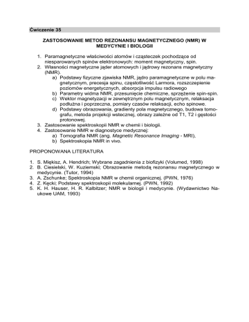 Ćwiczenie 35 ZASTOSOWANIE METOD REZONANSU MAGNETYCZNEGO (NMR) W MEDYCYNIE I BIOLOGII 1. Paramagnetyczne właściwości atomów i cząsteczek pochodzące od niesparowanych spinów elektronowych: moment magnetyczny, spin. 2. Własności magnetyczne jąder atomowych i jądrowy rezonans magnetyczny (NMR). a) Podstawy fizyczne zjawiska NMR, jądro paramagnetyczne w polu magnetycznym, precesja spinu, częstotliwość Larmora, rozszczepienie poziomów energetycznych, absorpcja impulsu radiowego b) Parametry widma NMR, przesunięcie chemiczne, sprzężenie spin-spin. c) Wektor magnetyzacji w zewnętrznym polu magnetycznym, relaksacja podłużna i poprzeczna, pomiary czasów relaksacji, echo spinowe. d) Podstawy obrazowania, gradienty pola magnetycznego, budowa tomografu, metoda projekcji wstecznej, obrazy zależne od T1, T2 i gęstości protonowej. 3. Zastosowanie spektroskopii NMR w chemii i biologii. 4. Zastosowanie NMR w diagnostyce medycznej: a) Tomografia NMR (ang. Magnetic Resonance Imaging - MRI), b) Spektroskopia NMR in vivo. PROPONOWANA LITERATURA 1. S. Miękisz, A. Hendrich; Wybrane zagadnienia z biofizyki (Volumed, 1998) 2. B. Ciesielski, W. Kuziemski; Obrazowanie metodą rezonansu magnetycznego w medycynie. (Tutor, 1994) 3. A. Zschunke; Spektroskopia NMR w chemii organicznej. (PWN, 1976) 4. Z. Kęcki; Podstawy spektroskopii molekularnej. (PWN, 1992) 5. K. H. Hauser, H. R. Kalbitzer; NMR w biologii i medycynie. (Wydawnictwo Naukowe UAM, 1993)