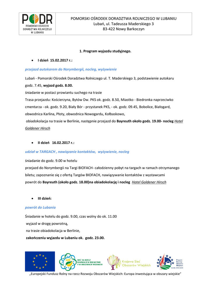 POMORSKI OŚRODEK DORADZTWA ROLNICZEGO W LUBANIU Lubań, ul. Tadeusza Maderskiego 3 83-422 Nowy Barkoczyn 1. Program wyjazdu studyjnego. I dzień 15.02.2017 r.: przejazd autokarem do Norymbergii, nocleg, wyżywienie Lubań - Pomorski Ośrodek Doradztwa Rolniczego ul. T. Maderskiego 3, podstawienie autokaru godz. 7.45, wyjazd godz. 8.00. śniadanie w postaci prowiantu suchego na trasie Trasa przejazdu: Kościerzyna, Bytów Dw. PKS ok. godz. 8.50, Miastko - Biedronka naprzeciwko cmentarza - ok. godz. 9.20, Biały Bór - przystanek PKS, - ok. godz. 09.45, Bobolice, Białogard, obwodnica Karlina, Płoty, obwodnica Nowogardu, Kołbaskowo, obiadokolacja na trasie w Berlinie, następnie przejazd do Bayreuth około godz. 19.00- nocleg Hotel Goldener Hirsch II dzień 16.02.2017 r.: udział w TARGACH , nawiązanie kontaktów, wyżywienie, nocleg śniadanie do godz. 9.00 w hotelu przejazd do Norymbergii na Targi BIOFACH- całodzienny pobyt na targach w ramach otrzymanego biletu; zapoznanie się z ofertą Targów BIOFACH, nawiązywanie kontaktów z wystawcami powrót do Bayreuth (około godz. 18.00)na obiadokolację i nocleg Hotel Goldener Hirsch III dzień: powrót do Lubania Śniadanie w hotelu do godz. 9.00, czas wolny do ok. 11.00 wyjazd w drogę powrotną, na trasie obiadokolacja w Berlinie, zakończeniu wyjazdu w Lubaniu ok. godz. 23.00. „Europejski Fundusz Rolny na rzecz Rozwoju Obszarów Wiejskich: Europa inwestująca w obszary wiejskie”