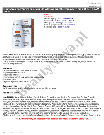 Informacje o produkcie Utworzono 07-03-2017 Szampon o potrójnym działaniu do włosów przetłuszczających się 200ml - GUAM UPKer Cena : 65,00 zł ov a. pl Nr katalogowy : 0447UKSHPOTRI Producent : GUAM Lacote - Włochy Dostępność : Dostępność - 3 dni Stan magazynowy : bardzo wysoki Średnia ocena : brak recenzji yN Guam UPKer Triple Action Shampoo to produkt przeznaczony do pielęgnacji włosów przetłuszczających się. Wzmacnia zakotwiczenie włosa w skórze oraz stymuluje mikrocyrkulację. Przywraca witalność, intensyfikuje wzrost oraz wzmacnia łuskę włosów. Eliminuje łupież oraz reguluje wydzielanie się sebum. Szampon delikatnie oczyszcza i myje skórę głowy, uwalniając ją od zanieczyszczeń. Włosy wygladają zdrowo, są miękkie, lśniące i lekkie. ea ut Działanie: - wzmacnia zakotwiczenie włosa w skórze - stymuluje mikrocyrkulację - przywraca witalność - intensyfikuje wzrost oraz wzmacnia łuskę włosów - eliminuje łupież - reguluje wydzielanie się sebum Sposób użycia: Nałóż na wilgotne włosy, spień i później spłucz pod bieżącą wodą. B Pojemność: 200 ml Skład (INCI): Aqua (Water), Sodium Coceth Sulfate, Cocamidopropyl Betaine, Cocamide Dea, Sodium Chloride, Polysorbate 20, Phenoxyethanol, Parfum (Fragrance), Polyquaternium-7, Glycerin, Undaria Pinnatifida Extract, Eucalyptol, Menthol, Benzoic Acid, Melaleuca Akternifolia (Tea Tree Leaf) Oil, Dehydroacetic Acid, ALcohol Denat., Citric Acid, Zinc Pyrithione, Hydrolyzed Keratin, Tocopheryl Acetate, Piroctone Olamine, Curcuma Zedoaria (Zedoary) Extract, Commiphora Myrrha (Myrrh Bark) Extract, Zingiber Officinale (Ginger Root) Extract, Angelica Archangelica (Root) Extract, Pipper Nigrum (Black Pepper) Seed Extract, Myristica Fragrans (Nutmeg) Extract, Acorus Calamus (Root) Extract, Elettaria Cardamomum (Cardamon Seed) Extract, Eugenia Caryophyllus (Clove Flower) Extract, Aloe Ferox (Leaf) Extract, Biotin, Capryloyl Glycine, Caffeine, Saccharide Isomerate, Linseed Acid, Fucus Vesiculosus (Bladderwrack) Extract, Laminaria Digitata Powder, Malus Domestica Fruit Cell Culture Extract, Xanthan Gum, Lecithin. Produkt testowany na obecność niklu oraz nie zawiera: parabenów, SLES, PEG. Wygenerowano w programie www.oscGold.com