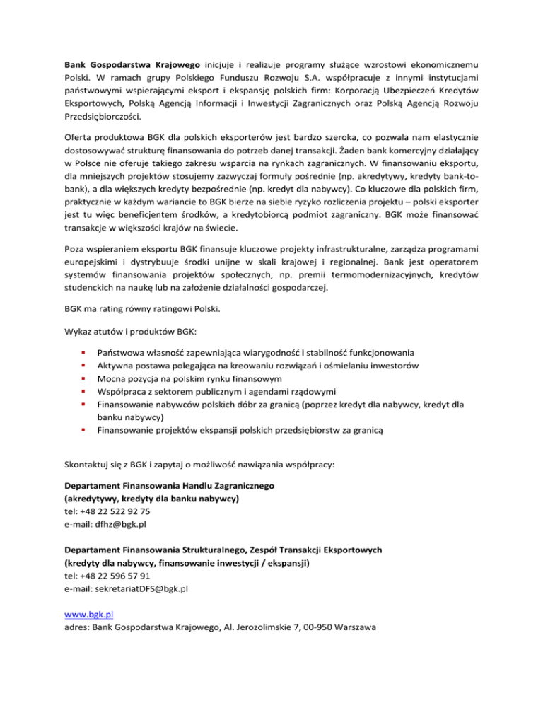 Bank Gospodarstwa Krajowego inicjuje i realizuje programy służące wzrostowi ekonomicznemu Polski. W ramach grupy Polskiego Funduszu Rozwoju S.A. współpracuje z innymi instytucjami państwowymi wspierającymi eksport i ekspansję polskich firm: Korporacją Ubezpieczeń Kredytów Eksportowych, Polską Agencją Informacji i Inwestycji Zagranicznych oraz Polską Agencją Rozwoju Przedsiębiorczości. Oferta produktowa BGK dla polskich eksporterów jest bardzo szeroka, co pozwala nam elastycznie dostosowywać strukturę finansowania do potrzeb danej transakcji. Żaden bank komercyjny działający w Polsce nie oferuje takiego zakresu wsparcia na rynkach zagranicznych. W finansowaniu eksportu, dla mniejszych projektów stosujemy zazwyczaj formuły pośrednie (np. akredytywy, kredyty bank-tobank), a dla większych kredyty bezpośrednie (np. kredyt dla nabywcy). Co kluczowe dla polskich firm, praktycznie w każdym wariancie to BGK bierze na siebie ryzyko rozliczenia projektu – polski eksporter jest tu więc beneficjentem środków, a kredytobiorcą podmiot zagraniczny. BGK może finansować transakcje w większości krajów na świecie. Poza wspieraniem eksportu BGK finansuje kluczowe projekty infrastrukturalne, zarządza programami europejskimi i dystrybuuje środki unijne w skali krajowej i regionalnej. Bank jest operatorem systemów finansowania projektów społecznych, np. premii termomodernizacyjnych, kredytów studenckich na naukę lub na założenie działalności gospodarczej. BGK ma rating równy ratingowi Polski. Wykaz atutów i produktów BGK: Państwowa własność zapewniająca wiarygodność i stabilność funkcjonowania Aktywna postawa polegająca na kreowaniu rozwiązań i ośmielaniu inwestorów Mocna pozycja na polskim rynku finansowym Współpraca z sektorem publicznym i agendami rządowymi Finansowanie nabywców polskich dóbr za granicą (poprzez kredyt dla nabywcy, kredyt dla banku nabywcy) Finansowanie projektów ekspansji polskich przedsiębiorstw za granicą Skontaktuj się z BGK i zapytaj o możliwość nawiązania współpracy: Departament Finansowania Handlu Zagranicznego (akredytywy, kredyty dla banku nabywcy) tel: +48 22 522 92 75 e-mail: [email protected] Departament Finansowania Strukturalnego, Zespół Transakcji Eksportowych (kredyty dla nabywcy, finansowanie inwestycji / ekspansji) tel: +48 22 596 57 91 e-mail: [email protected] www.bgk.pl adres: Bank Gospodarstwa Krajowego, Al. Jerozolimskie 7, 00-950 Warszawa Wsparcie działalności zagranicznej polskich przedsiębiorstw Finansowe wspieranie eksportu/ekspansji zagranicznej Strategicznym zadaniem Banku Gospodarstwa Krajowego jest wsparcie rozwoju polskich przedsiębiorstw na arenie międzynarodowej m.in. w ramach Rządowego Programu Wspierania Eksportu. Wychodząc naprzeciw oczekiwaniom polskich przedsiębiorstw, począwszy od 2015 r. BGK realizuje też strategię wspierania ekspansji zagranicznej polskiego kapitału. Udzielone przez BGK środki mogą zostać przeznaczone m.in. na: realizację krótko-/długoterminowych kontraktów eksportowych, realizację projektów zagranicznych, zakup spółek i/lub aktywów zagranicznych. Wsparcie ze strony BGK zapewnia: Wspieranie polskich przedsiębiorców na rynkach o podwyższonym ryzyku, pomijanych przez większość banków komercyjnych. Indywidualne podejście do potrzeb klienta: parametry finansowania (m.in. tenor, zabezpieczenia) dostosowane do specyfiki każdej transakcji. Atrakcyjne warunki cenowe wynikające ze strategii wspierania polskiego eksportu i odzwierciedlające faktyczny koszt kapitału i przejęcia ryzyka. Różnorodność struktur finansowania. FINASOWANIE EKSPORTU Finansowanie w oparciu o akredytywy Podstawowe parametry Główne cechy Finansowanie eksportu konsumpcyjnego lub inwestycyjnego, ogranicza ryzyko transakcji, zapewnia płynność. Typ finansowania Finansowanie w oparciu o ocenę standingu banku Importera, udzielane na bazie akredytywy dokumentowej. Maksymalny okres spłaty 2 lata Dostępne struktury: dyskonto potwierdzenie postfinansowanie EUR Waluta finansowania Kredyt dla banku nabywcy Podstawowe parametry Typ finansowania Finansowanie w oparciu o ocenę standing banku Importera Minimalny okres spłaty 2 lata Kwota finansowania Do 85% wartości kontraktu eksportowego, min. 1 mln EUR Koszt finansowania Po stronie Importera Cel Finansowanie eksportu inwestycyjnego Waluta finansowania EUR Kredyt dla nabywcy Podstawowe parametry Przeznaczenie Finansowanie inwestycji realizowanych przez polskich eksporterów Struktura finansowania 1. 2. 3. 4. Wysokość finansowania Do 85% wartości kontraktu eksportowego + do 100% wartości polisy KUKE (o ile wymagana) Kwota finansowania Co najmniej 10 mln EUR Okres finansowania Dostosowany do przepływów pieniężnych Projektu, maksymalnie do 15 lat* (w tym do 3 lat okresu realizacji) Waluta finansowania EUR Warunki cenowe Ustalane indywidualnie zgodnie z profilem ryzyka transakcji Finansowanie typu project finance Finansowanie korporacyjne w oparciu o bilans Importera, Finansowanie w strukturze sovereign finance Finansowanie w strukturze J.V Zabezpieczenia Standardowe przy tego typu finansowaniu, m.in.: zabezpieczenie na aktywach projektu polisa ubezpieczeniowa KUKE * Zgodnie z konsensusem OECD FINANSOWANIE INWESTYCJI/EKSPANSJI ZAGRANICZNEJ Kredyt dla polskiego przedsiębiorstwa w celu realizacji inwestycji/ akwizycji zagranicznych Podstawowe parametry Przeznaczenie Finansowanie ekspansji zagranicznej polskich przedsiębiorstw (np. zakup spółek i aktywów zagranicznych/budowa zakładów produkcyjnych poza Polską + prefinansowanie eksportu) Typ finansowania Długoterminowe finansowanie inwestycyjne w oparciu o bilans polskiego lub zagranicznego podmiotu Kwota finansowania Co najmniej 8 mln EUR Okres finansowania Do uzgodnienia Waluta finansowania EUR Warunki cenowe Ustalane indywidualnie zgodnie z profilem ryzyka transakcji Zabezpieczenia W pierwszej kolejności na aktywach zagranicznych (projek