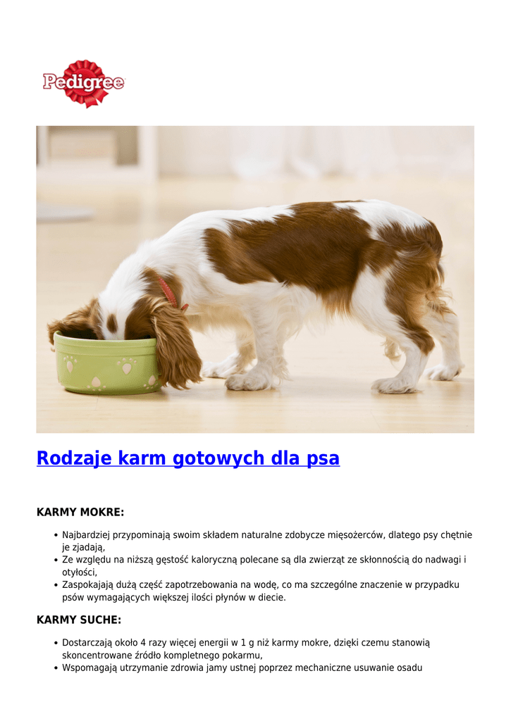 Rodzaje karm gotowych dla psa KARMY MOKRE: Najbardziej przypominają swoim składem naturalne zdobycze mięsożerców, dlatego psy chętnie je zjadają, Ze względu na niższą gęstość kaloryczną polecane są dla zwierząt ze skłonnością do nadwagi i otyłości, Zaspokajają dużą część zapotrzebowania na wodę, co ma szczególne znaczenie w przypadku psów wymagających większej ilości płynów w diecie. KARMY SUCHE: Dostarczają około 4 razy więcej energii w 1 g niż karmy mokre, dzięki czemu stanowią skoncentrowane źródło kompletnego pokarmu, Wspomagają utrzymanie zdrowia jamy ustnej poprzez mechaniczne usuwanie osadu nazębnego, Są wyjątkowo łatwe do podania, co ułatwia utrzymanie porządku i redukuje ilość pracy związanej z żywieniem psa do absolutnego minimum. Właściciele psów, szukając odpowiedniej gotowej karmy dla swoich pupili, mogą być zdezorientowani różnorodnością nazw, składów i produktów. Etykiety karm dla psów zawierają jednak bardzo precyzyjną informację na temat składu i wartości odżywczych danej karmy. Co zatem oznaczają określenia na opakowaniach poszczególnych karm? Jak je należy rozumieć? Jednym z podstawowych podziałów karm gotowych dla psów jest rozróżnienie na karmy pełnoporcjowe i uzupełniające – informacja o typie karmy znajduje się na etykietach poszczególnych produktów (najczęściej, niestety, napisana małym drukiem). Jak informuje lekarz weterynarii dr Michał Ceregrzyn: „Karmy pełnoporcjowe różnią się od uzupełniających tym, że mogą stanowić wyłączny pokarm psa każdego dnia i przez całe jego życie lub okres życia, do którego są dostosowane, np. karmy dla szczeniąt, zaspokajając wszystkie potrzeby żywieniowe zwierzęcia.” Natomiast karmy uzupełniające to takie, które dodatkowo dostarczają energii oraz składników odżywczych, a ponieważ nie są kompletne i zbilansowane, nie mogą być jedynym podawanym psu pożywieniem. Do tej grupy zaliczają się także funkcjonalne przekąski stomatologiczne – produkty o stosunkowo niskiej wartości kalorycznej, przeznaczone do higieny jamy ustnej zwierzęcia. Pełnoporcjowe karmy gotowe zawierają wszystkie niezbędne do prawidłowego funkcjonowania zwierzęcia składniki (w tym białka, tłuszcze i witaminy). Jednocześnie są to produkty różnorodne pod względem smaku – zawierają rozmaite, lubiane przez psy, mięsa i produkty pochodzenia zwierzęcego (np. wołowinę lub drób). Do tego dochodzą wyselekcjonowane oleje, naturalny błonnik oraz warzywa. Wyselekcjonowane składniki są mieszane i dzięki zastosowaniu prostych zabiegów technologicznych, takich jak gotowanie na parze (karmy mokre) lub gotowanie pod ciśnieniem (karmy suche), powstają z nich smaczne i odżywcze karmy. Dwa podstawowe rodzaje karm gotowych to karmy suche i mokre. Rzadziej spotykaną grupę stanowią tzw. karmy półwilgotne. Wybierając dla swojego pupila odpowiedni rodzaj pokarmu, każdy właściciel powinien wziąć pod uwagę wszystkie korzyści wynikające z karmienia czworonoga określonego typu pożywieniem. Trzeba także pamiętać, że obydwa rodzaje karm mogą być podawane osobno, ale także łączone, jeśli pies lubi je jeść.