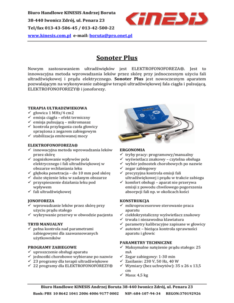 Biuro Handlowe KINESIS Andrzej Boruta 38-440 Iwonicz Zdrój, ul. Penara 23 Tel/fax 013-43-506-45 / 013-42-500-22 www.kinesis.com.pl e-mail: [email protected] Sonoter Plus Nowym zastosowaniem ultradźwięków jest ELEKTROFONOFOREZA®. Jest to innowacyjna metoda wprowadzania leków przez skórę przy jednoczesnym użyciu fali ultradźwiękowej i prądu elektrycznego. Sonoter Plus jest nowoczesnym aparatem pozwalającym na wykonywanie zabiegów terapii ultradźwiękowej fala ciągła i pulsującą, ELEKTROFONOFOREZY® i jonoforezy. TERAPIA ULTRADZWIEKOWA głowica 1 MHz/4 cm2 emisja ciągła – efekt termiczny emisja pulsującą – mikromasaz kontrola przylegania czoła głowicy sprzężona z zegarem zabiegowym stabilizacja emitowanej mocy ELEKTROFONOFOREZA® innowacyjna metoda wprowadzania leków przez skórę zogniskowanie wpływów pola elektrycznego i fali ultradźwiękowej w obszarze wchłaniania leku głęboka penetracja – do 10 mm pod skórę duże stężenie leku w zadanym obszarze przyspieszenie działania leku pod wpływem fali ultradźwiękowej JONOFOREZA wprowadzanie leków przez skórę przy użyciu prądu stałego wykrywanie przerwy w obwodzie pacjenta TRYB MANUALNY pełna kontrola nad parametrami zabiegowymi dla zaawansowanych użytkowników PROGRAMY ZABIEGOWE uproszczenie obsługi aparatu jednostki chorobowe wybierane po nazwie 23 programy dla terapii ultradźwiękowe 22 programy dla ELEKTROFONOFOREZY® ERGONOMIA tryby pracy: programowy/manualny wyświetlacz znakowy – czytelna obsługa wybór jednostek chorobowych po nazwie zegar zabiegowy precyzyjna kontrola emisji fali ultradźwiękowej i prądu w trakcie zabiegu komfort obsługi – aparat nie przerywa emisji z powodu chwilowego pogorszenia absorpcji fali np. w okolicach kości KONSTRUKCJA mikroprocesorowe sterowanie praca aparatu ciekłokrystaliczny wyświetlacz znakowy trwała i niezawodna klawiatura parametry kalibracyjne zapisane w głowicy autotest – bieżąca kontrola sprawności aparatu i głowic PARAMETRY TECHNICZNE Maksymalne natężenie prądu stałego: 25 mA Zegar zabiegowy: 1-30 min Zasilanie: 230 V, 50 Hz, 40 W Wymiary (bez uchwytów): 35 x 26 x 13,5 cm Masa: 4,5 kg Biuro Handlowe KINESIS Andrzej Boruta 38-440 Iwonicz Zdrój, ul. Penara 23 Bank: PBS 10 8642 1041 2006 4006 9177 0002 NIP: 684-107-94-34 REGON:370192926 Biuro Handlowe KINESIS Andrzej Boruta 38-440 Iwonicz Zdrój, ul. Penara 23 Tel/fax 013-43-506-45 / 013-42-500-22 www.kinesis.com.pl e-mail: [email protected] Generator ultradźwięków: tryby pracy: ciągły, pulsujący częstotliwość pulsowania 16 Hz, 48 Hz, 100 Hz wypełnienie przebiegu pulsującego 5 %, 10 %, 20 % Głowica ultradźwiękowa: częstotliwość pracy: 1 MHz max moc 10 W max gęstość mocy 2,5 W cm2 powierzchnia promieniowania 4 cm2 Głowica do elektrofonoforezy (opcjonalnie): częstotliwość pracy: 1 MHz max moc 5 W max gęstość mocy 1,2 W/cm2 powierzchnia promieniowania 4 cm2 objętość komory na lek 4 cm3 max natężenie prądu 5 mA GWARANCJA Sonoter Plus 2 lata Głowice ultradźwiękowe 1 rok WYPOSAZENIE STANDARDOWE komplet przewodów elektrody silikonowe 2 szt. pokrowce wiskozowe 4 szt. pasy rzepowe 2 szt. głowica ultradźwiękowa GP4-1 żel do ultradźwięków 500 g instrukcja użytkowania WYPOSAZENIE DODATKOWE głowica do elektrofonoforezy GP4-1-EF przewód do elektrofonoforezy kompendium nt. elektrofonoforezy woreczki z piaskiem stolik torba Biuro Handlowe KINESIS Andrzej Boruta 38-440 Iwonicz Zdrój, ul. Penara 23 Bank: PBS 10 8642 1041 2006 4006 9177 0002 NIP: 684-107-94-34 REGON:370192926