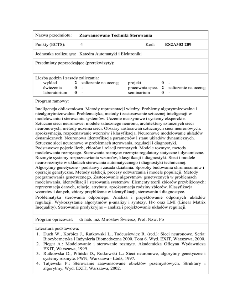 Nazwa przedmiotu: Zaawansowane Techniki Sterowania Punkty (ECTS): 4 Kod: ES2A302 209 Jednostka realizująca: Katedra Automatyki i Elektroniki Przedmioty poprzedzające (prerekwizyty): Liczba godzin i zasady zaliczania: wykład 2 zaliczenie na ocenę; ćwiczenia 0 laboratorium 0 - projekt 0 pracownia spec. 2 seminarium 0 zaliczenie na ocenę; - Program ramowy: Inteligencja obliczeniowa. Metody reprezentacji wiedzy. Problemy algorytmizowalne i niealgorytmizowalne. Problematyka, metody i zastosowanie sztucznej inteligencji w modelowaniu i sterowaniu systemów. Uczenie maszynowe i systemy eksperckie. Sztuczne sieci neuronowe: modele sztucznego neuronu, architektury sztucznych sieci neuronowych, metody uczenia sieci. Obszary zastosowań sztucznych sieci neuronowych: aproksymacja, rozpoznawanie wzorców i klasyfikacja. Neuronowe modelowanie układów dynamicznych. Neuronowa identyfikacja parametrów i stanu układów dynamicznych. Sztuczne sieci neuronowe w problemach sterowania, regulacji i diagnostyki. Podstawowe pojęcie liczb, zbiorów i relacji rozmytych. Modele rozmyte, metody modelowania rozmytego. Sterowanie rozmyte: rozmyte regulatory statyczne i dynamiczne. Rozmyte systemy rozpoznawiania wzorców, klasyfikacji i diagnostyki. Sieci i modele neuro-rozmyte w układach sterowania automatycznego i diagnostyki technicznej. Algorytmy genetyczne - podstawy i zasada działania. Sposoby budowania chromosomów i operacje genetyczne. Metody selekcji, procesy odtwarzania i modele populacji. Metody programowania genetycznego. Zastosowanie algorytmów genetycznych w problemach modelowania, identyfikacji i sterowania systemów. Elementy teorii zbiorów przybliŜonych: reprezentacja danych, relacje, atrybuty. aproksymacja rodziny zbiorów. Klasyfikacja wzorców i danych, zbiory przybliŜone w identyfikacji, sterowaniu i diagnostyce. Problematyka sterowania odpornego. Analiza i projektowanie odpornych układów regulacji. Wykorzystanie algorytmów µ-analizy i syntezy, H∞ oraz LMI (Linear Matrix Inequality). Sterowanie predykcyjne – analiza i projektowanie układów regulacji. Program opracował: dr hab. inŜ. Mirosław Świercz, Prof. Nzw. Pb Literatura podstawowa: 1. Duch W., Korbicz J., Rutkowski L., Tadeusiewicz R. (red.): Sieci neuronowe. Seria: Biocybernetyka i InŜynieria Biomedyczna 2000. Tom 6. Wyd. EXIT, Warszawa, 2000. 2. Piegat A.: Modelowanie i sterowanie rozmyte. Akademicka Oficyna Wydawnicza EXIT, Warszawa, 1999. 3. Rutkowska D., Piliński D., Rutkowski L.: Sieci neuronowe, algorytmy genetyczne i systemy rozmyte. PWN, Warszawa - Łódź, 1997. 4. Tatjewski P.: Sterowanie zaawansowane obiektów przemysłowych. Struktury i algorytmy, Wyd. EXIT, Warszawa, 2002.