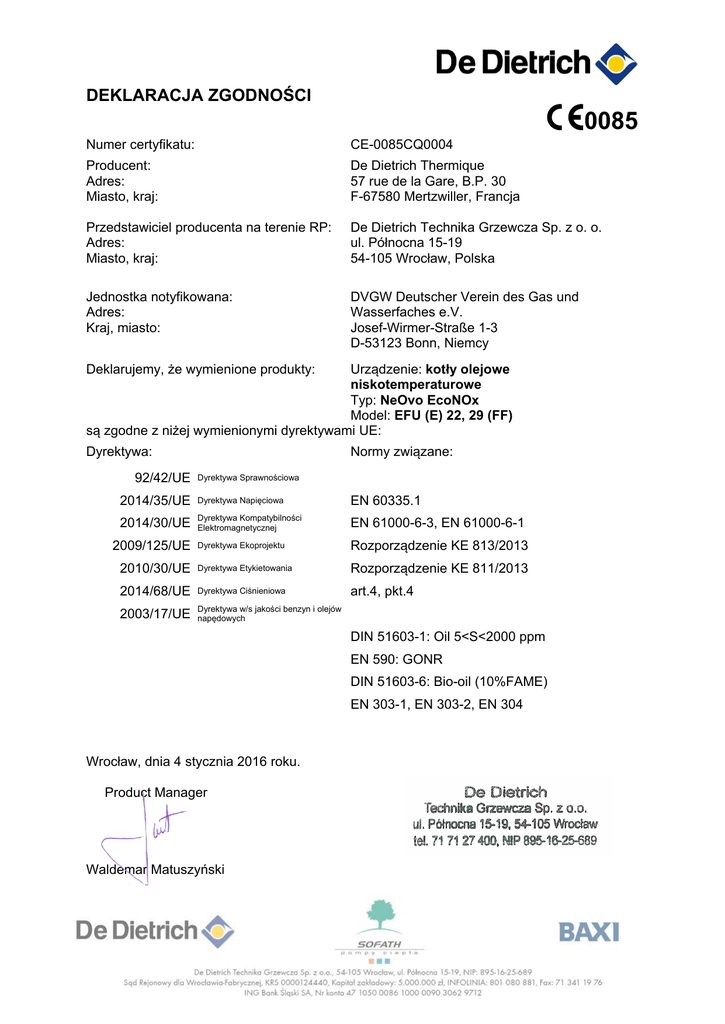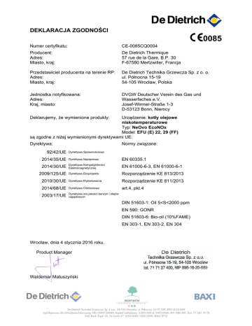 DEKLARACJA ZGODNOŚCI C0085 Numer certyfikatu: CE-0085CQ0004 Producent: Adres: Miasto, kraj: De Dietrich Thermique 57 rue de la Gare, B.P. 30 F-67580 Mertzwiller, Francja Przedstawiciel producenta na terenie RP: Adres: Miasto, kraj: De Dietrich Technika Grzewcza Sp. z o. o. ul. Północna 15-19 54-105 Wrocław, Polska Jednostka notyfikowana: Adres: Kraj, miasto: DVGW Deutscher Verein des Gas und Wasserfaches e.V. Josef-Wirmer-Straße 1-3 D-53123 Bonn, Niemcy Urządzenie: kotły olejowe niskotemperaturowe Typ: NeOvo EcoNOx Model: EFU (E) 22, 29 (FF) są zgodne z niżej wymienionymi dyrektywami UE: Deklarujemy, że wymienione produkty: Dyrektywa: 92/42/UE Normy związane: Dyrektywa Sprawnościowa 2014/35/UE Dyrektywa Napięciowa EN 60335.1 2014/30/UE Dyrektywa Kompatybilności Elektromagnetycznej EN 61000-6-3, EN 61000-6-1 Dyrektywa Ekoprojektu Rozporządzenie KE 813/2013 2010/30/UE Dyrektywa Etykietowania Rozporządzenie KE 811/2013 2014/68/UE Dyrektywa Ciśnieniowa art.4, pkt.4 2003/17/UE Dyrektywa w/s jakości benzyn i olejów napędowych 2009/125/UE DIN 51603-1: Oil 5<S<2000 ppm EN 590: GONR DIN 51603-6: Bio-oil (10%FAME) EN 303-1, EN 303-2, EN 304 Wrocław, dnia 4 stycznia 2016 roku. Product Manager Waldemar Matuszyński