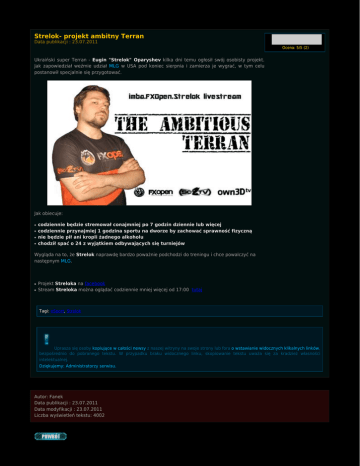 Strelok- projekt ambitny Terran Data publikacji : 23.07.2011 Ocena: 5/5 (2) Ukraiński super Terran - Eugin "Strelok" Oparyshev kilka dni temu ogłosił swój osobisty projekt. Jak zapowiedział weźmie udział MLG w USA pod koniec sierpnia i zamierza je wygrać, w tym celu postanowił specjalnie się przygotować. Jak obiecuje: ● ● ● ● codziennie będzie stremował conajmniej po 7 godzin dziennie lub więcej codziennie przynajmiej 1 godzina sportu na dworze by zachować sprawność fizyczną nie będzie pił ani kropli żadnego alkoholu chodził spać o 24 z wyjątkiem odbywających się turniejów Wygląda na to, że Strelok naprawdę bardzo poważnie podchodzi do treningu i chce powalczyć na następnym MLG. ● ● Projekt Streloka na facebook Stream Streloka można oglądać codziennie mniej więcej od 17:00 tutaj Tagi: eSport, Strelok Uprasza się osoby kopiujące w całości newsy z naszej witryny na swoje strony lub fora o wstawianie widocznych klikalnych linków, bezpośrednio do pobranego tekstu. W przypadku braku widocznego linku, skopiowanie tekstu uważa się za kradzież własności intelektualnej. Dziękujemy: Administratorzy serwisu. Autor: Fanek Data publikacji : 23.07.2011 Data modyfikacji : 23.07.2011 Liczba wyświetleń tekstu: 4002 Komentarz (8) dodaj komentarz Projekt zaiste ambitny, zwłaszcza te założenia spoza StarCrafta :] Tak właśnie mnie zastanawiało skąd nagle tyle Streloka na streamie - sam kanał bardzo fajny i okraszony dobrą muzyką. Jak zwykle dziękujemy za informację, ale proszę - błagam wręcz - usuńcie słowo "dworzu" i zastąpcie poprawną odmianą. A autorowi zadajcie pokutę. BTW. Genialna tapeta panie Strelok ^_^~Bor5uczka 2011/07/23 15:49 to jest dywan -,-~Megidon 2011/07/23 16:03 wszystko ok ale jak wytrzyma bez picia to niewiem :)~Nilus 2011/07/23 16:09 Strelok ma dywan na ścianie pewnie nie bedzie pił tylko w czasei gry :)~Fanek 2011/07/23 16:19 i 2k ludu ogląda ;]~VeR 2011/07/23 17:08 Wiecie co? Po tym wystąpieniu mam zamiar mu kibicować :). A niech chłop ma coś dla siebie :D~Diter 2011/07/23 21:02 Gościu tak trenuje bo zbiera kasę na remont mieszkania :) Zobaczymy czy mu się to uda :)~Thebisre 2011/07/24 00:07 Ludzie to nie dywan tylko pled.... albo jest naprawdę takim lumpem ze dziurawe ściany zasłania dywanem bo nie ma na gładź czy tapety ;) Polecam oglądać bo fajnie się wnerwia gdy przegrywa^^ jeszcze jedno, tu na filmie ma źrenice normalne a ostatnio jak włączyłem jego kanał to nie miał ich wcale ^^~Malavagio 2011/07/24 09:53 dodaj komentarz 08.10.2015 Kampania "Szepty o zagładzie" dostępna za darmo (0 komentarzy) 27.09.2015 Kolejni bohaterowie w trybie Sprzymierzonych Dowódców (0 komentarzy) 22.09.2015 Cyfrowe gadżety za udział w BlizzCon 2015 (0 komentarzy) 15.07.2015 Legacy of the Void dostępne w przedsprzedaży! (0 komentarzy) 17.06.2015 Informacje z E3 - prolog kampanii Legacy of the Void (0 komentarzy) 30.05.2015 WCS Europe - sobota (30 maja) 18.00 grupa G - MaNa! (0 komentarzy) 07.05.2015 DreamHack Open France 2015 - już 8 maja - MaNa! (0 komentarzy) 03.05.2015 Na wesoło: postacie E-sportu 50 (0 komentarzy) 03.05.2015 IEM Katowice 2015 - jeszcze raz! (0 komentarzy) 03.05.2015 KeSPA Cup 2015 Season 1 - live! (0 komentarzy) 26.04.2015 Proleague - Top5 gier miesiąca (0 komentarzy) 26.04.2015 CJ Entus wygrywa 2 runde Proleague! (0 komentarzy) 18.04.2015 Wersja beta Legacy of the Void – aktualizacja 2.5.1 (0 komentarzy) 18.04.2015 WCS finals 2015 - galeria (0 komentarzy) 18.04.2015 Omówienie zmian w balansie Legacy of the Void (0 komentarzy) 11.04.2015 WCS Europe kwalifikacje z Polakami - dziś (sobota) 18.00 (0 komentarzy) 11.04.2015 Aktualizacja balansu Heart of the Swarm – 9 kwietnia (0 komentarzy) 11.04.2015 GSL Season1 2015 - galeria (0 komentarzy) 11.04.2015 Zbanowane konta w StarCraft II (0 komentarzy) 04.04.2015 Red Bull Battle Grounds powraca jesienią 2015 (0 komentarzy) (zobacz wszystkie)