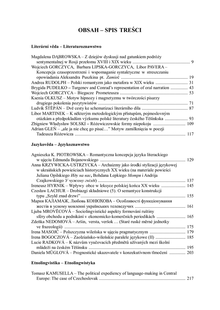 OBSAH – SPIS TREŚCI Literární věda – Literaturoznawstwo Magdalena DĄBROWSKA – Z dziejów dyskusji nad gatunkiem podróży sentymentalnej w Rosji przełomu XVIII i XIX wieku .................................................. 9 Wojciech GORCZYCA, Barbara LIPSKA-GORCZYCA, Libor PAVERA – Koncepcja czasoprzestrzeni i wspomaganie syntaktyczne w streszczaniu opowiadania Aleksandra Puszkina pt. Zamieć .......................................................... 19 Andrea RUDOLPH – Polski romantyzm jako metafora w XIX wieku ............................ 31 Brygida PUDEŁKO – Turgenev and Conrad’s representation of oral narration ............... 43 Wojciech GORCZYCA – Biegacze Prometeusza ........................................................... 53 Ksenia OLKUSZ – Motyw hipnozy i magnetyzmu w twórczości pisarzy drugiego pokolenia pozytywistów .............................................................................. 71 Ludvík ŠTĚPÁN – Dvě cesty ke schematizaci literárního díla ........................................ 87 Libor MARTINEK – K některým metodologickým přístupům, pojmoslovným otázkám a předpokladům výzkumu polské literatury českého Těšínkska .................... 93 Zbigniew Władysław SOLSKI – Różewiczowskie formy niepokoju ............................ 109 Adrian GLEŃ – „ale ja nie chcę go pisać…” Motyw zamilknięcia w poezji Tadeusza Różewicza ................................................................................................ 117 Jazykověda – Językoznawstwo Agnieszka K. PIOTROWSKA – Romantyczna koncepcja języka literackiego w ujęciu Edmunda Bojanowskiego .......................................................................... Anna KRZYWICKA-USTRZYCKA – Archaizmy jako środki stylizacji językowej w ukraińskich powieściach historycznych XX wieku (na materiale powieści Juliana Opilskiego Иду на вас, Bohdana Łepkiego Мотря i Andrija Czajkowskiego У чужому гнiздi) ............................................................................ Ireneusz HYRNIK – Wpływy obce w leksyce polskiej końca XX wieku ..................... Czesław LACHUR – Drobiazgi składniowe (5). O semantyce konstrukcji typu „Szyld znad drzwi” ........................................................................................... Мария КАЛАМАЖ, Любовь КОНЮХОВА – Особливостi функцiонування жестiв в усному мовленнi украϊнських телеведучих ............................................ Ljuba MROVĚCOVÁ – Sociolingvistické aspekty formování ruštiny sféry obchodu a podnikání v ekonomicko-komerčních periodikách ......................... Zdeňka NEDOMOVÁ – Aršin, versta, veršok … (Staré ruské měrné jednotky ve frazeologii) ......................................................................................................... Irena MASOJĆ – Polszczyzna wileńska w ujęciu pragmatycznym ............................... Irena BOGOCZOVÁ – Zaolziańsko-wileńskie paralele językowe (II) .......................... Lucie RADKOVÁ – K názvům vyučovacích předmětů užívaných mezi školní mládeží na českém Těšínsku .................................................................................... Daniela MÜGLOVÁ – Prognostické ukazovatele v konzekutívnom tlmočení .............. 129 137 145 155 161 165 175 179 185 195 203 Etnolingvistika – Etnolingwistyka Tomasz KAMUSELLA – The political expediency of language-making in Central Europe: The case of Czechoslovak ........................................................................... 217 Etnické procesy – Procesy etniczne Martina CICHÁ – Národnostní a etnické menšiny v ČR a multikulturní výchova na vysokých školách ................................................................................................ 225 Recenze a pojednání – Recenzje i omówienia Ewa Lipińska: Język ojczysty, język obcy, język drugi. Wstęp do badań dwujęzyczności, Wydawnictwo Uniwersytetu Jagiellońskiego, Kraków 2003, s. 148 (Jiří Muryc) ............................................................................................................. 235 Libor Martinek: Polská literatura českého Tešínska po roce 1945, vyd. 1, Slezská univerzita, Opava 2004, 199 s. (Viera Žemberová) ...................................... 239 Nesterovová, N. M.: Text a preklad v zrkadle súčasných lozockých paradigiem, Perm, Permská štátna univerzita 2005, 203 s. (Anna Petríková) ............................... 241 Praca zbiorowa pod redakcją Dionizjusza Czubali i Grzegorza Grzybka: Zagadnienia społeczne. Wychowanie regionalne, opieka socjalna, pomoc psychologiczna. Oświata i kultura na Podbeskidziu. Tom drugi, Wydawnictwo ATH, Bielsko-Biała 2005, 320 s. (Krystyna Przyhoda) ............................................ 245 Aleksandra Pająk: Jaroslav Durych a spór o sens czeskich dziejów, Wydawnictwo Uniwersytetu Opolskiego, Opole 2006 (Adrian Gleń) .............................................. 247 Doświadczenie religijne w literaturze XX wieku, red. Adrian Gleń, Irena Jokiel, Uniwersytet Opolski – Instytut Filologii Polskiej, Opole 2006 (Adrian Gleń) .......... 249 Irena Jokiel, Lornety i kapota. Studia o Mickiewiczu, Uniwersytet Opolski – Instytut Filologii Polskiej, Opole 2006 (Adrian Gleń) .............................................. 253 Anna Ledwina, Sidonie-Gabrielle Colette – kobieta i pisarka wyprzedzająca swoją epokę, Wydawnictwo Uniwersytetu Opolskiego, Opole 2006 (Adrian Gleń) .......................................................................................................... 255 Ewa Piasecka, „Dolina mroku”. Groza i niesamowitość w prozie polskiej lat 1890–1918, Wydawnictwo Uniwersytetu Opolskiego, Opole 2006 (Adrian Gleń) ..................