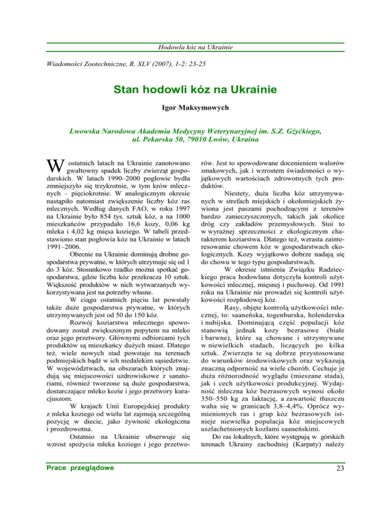 Hodowla kóz na Ukrainie Wiadomości Zootechniczne, R. XLV (2007), 1-2: 23-25 Stan hodowli kóz na Ukrainie Igor Maksymowych Lwowska Narodowa Akademia Medycyny Weterynaryjnej im. S.Z. Gźyćkiego, ul. Pekarska 50, 79010 Lwów, Ukraina W ostatnich latach na Ukrainie zanotowano gwałtowny spadek liczby zwierząt gospodarskich. W latach 1990–2000 pogłowie bydła zmniejszyło się trzykrotnie, w tym krów mlecznych – pięciokrotnie. W analogicznym okresie nastąpiło natomiast zwiększenie liczby kóz ras mlecznych. Według danych FAO, w roku 1997 na Ukrainie było 854 tys. sztuk kóz, a na 1000 mieszkańców przypadało 16,6 kozy, 0,06 kg mleka i 4,02 kg mięsa koziego. W tabeli przedstawiono stan pogłowia kóz na Ukrainie w latach 1991–2006. Obecnie na Ukrainie dominują drobne gospodarstwa prywatne, w których utrzymuje się od 1 dо 3 kóz. Stosunkowo rzadko moŜna spotkać gospodarstwa, gdzie liczba kóz przekracza 10 sztuk. Większość produktów w nich wytwarzanych wykorzystywana jest na potrzeby własne. W ciągu ostatnich pięciu lat powstały takŜe duŜe gospodarstwa prywatne, w których utrzymywanych jest od 50 dо 150 kóz. Rozwój koziarstwa mlecznego spowodowany został zwiększonym popytem na mleko oraz jego przetwory. Głównymi odbiorcami tych produktów są mieszkańcy duŜych miast. Dlatego teŜ, wiele nowych stad powstaje na terenach podmiejskich bądź w ich niedalekim sąsiedztwie. W województwach, na obszarach których znajdują się miejscowości uzdrowiskowe z sanatoriami, równieŜ tworzone są duŜe gospodarstwa, dostarczające mleko kozie i jego przetwory kuracjuszom. W krajach Unii Europejskiej produkty z mleka koziego od wielu lat zajmują szczególną pozycję w diecie, jako Ŝywność ekologiczna i prozdrowotna. Ostatnio na Ukrainie obserwuje się wzrost spoŜycia mleka koziego i jego przetwo- Prace przeglądowe rów. Jest to spowodowane docenieniem walorów smakowych, jak i wzrostem świadomości o wyjątkowych wartościach zdrowotnych tych produktów. Niestety, duŜa liczba kóz utrzymywanych w strefach miejskich i okołomiejskich Ŝywiona jest paszami pochodzącymi z terenów bardzo zanieczyszczonych, takich jak okolice dróg czy zakładów przemysłowych. Stoi to w wyraźnej sprzeczności z ekologicznym charakterem koziarstwa. Dlatego teŜ, wzrasta zainteresowanie chowem kóz w gospodarstwach ekologicznych. Kozy wyjątkowo dobrze nadają się do chowu w tego typu gospodarstwach. W okresie istnienia Związku Radzieckiego praca hodowlana dotyczyła kontroli uŜytkowości mlecznej, mięsnej і puchowej. Od 1991 roku na Ukrainie nie prowadzi się kontroli uŜytkowości rozpłodowej kóz. Rasy, objęte kontrolą uŜytkowości mlecznej, to: saaneńska, togenburska, holenderska i nubijska. Dominującą część populacji kóz stanowią jednak kozy bezrasowe (białe i barwne), które są chowane i utrzymywane w niewielkich stadach, liczących po kilka sztuk. Zwierzęta te są dobrze przystosowane do warunków środowiskowych oraz wykazują znaczną odporność na wiele chorób. Cechuje je duŜa róŜnorodność wyglądu (mieszane stada), jak i cech uŜytkowości produkcyjnej. Wydajność mleczna kóz bezrasowych wynosi około 350–550 kg za laktację, a zawartość tłuszczu waha się w granicach 3,8–4,4%. Oprócz wymienionych ras i grup kóz bezrasowych istnieje niewielka populacja kóz miejscowych uszlachetnionych kozłami saaneńskimi. Do ras lokalnych, które występują w górskich terenach Ukrainy zachodniej (Karpaty) naleŜy 23 I. Maksymowych takŜe zaliczyć kozę karpacką. Kozy importowane z krajów europejskich (saaneńska, alpejska) w warunkach miejscowych nie uzyskują oczekiwanych wydajności. U zwierząt tych często występują choroby niedoborowe, poniewaŜ nie adaptują się one dobrze do miejscowych warunków. Jednak, juŜ u otrzymanego od takich zwierząt potomstwa obserwuje się poprawę wydajności mlecznej i podwyŜszoną odporność na niektóre choroby. Takie zwierzęta potrzebne są do polepszenia cech produkcyjnych kóz ras miejscowych. Dlatego, nie naleŜy dąŜyć do importu nowych stad kóz, które nie są odporne na niekorzystne warunki środowiskowe, lecz zmierzać do uszlachetniania kóz ras miejscowych w celu otrzymania zdrowego i wydajnego pogłowia. STATE OF GOAT BREEDING IN UKRAINE Summary In recent years in Ukraine, total livestock numbers decreased sharply. During the period 1990–2000, the population of cattle decreased 3.3 times and that of cows – 4.9 times. The decrease in the total number of cattle in Ukraine is partly compensated by the development in Ukraine of dairy goat breeding. A total of 522,500 goats were recorded in Ukraine in 1991 and 879,500 goats were recorded in 2005. This increase was caused by the increased demand for goat’s milk and milk products. Among the breeds of goats used in different farms are Saanen, Toggenburg, Dutch and Nubian. Several goats of local breeds, which are kept in small farms, are predominant. The goats exported from western countries did not achieve desirable results because these animals are susceptible to diseases. It is better to use them for improving the productive characteristics of local animals. ….. 24 Prace przeglądowe Hodowla kóz na Ukrainie Liczba kóz na Ukrainie w latach 1991–2006 (tys. szt.)* – Goat population in Ukraine, 1991-2006 (thous. head)* Województwa Provinces AR Krym Winnica Wołyń Dniepropetrowsk Donieck śytomierz Zakarpacie ZaporoŜe Iwano-Frankowsk Kijów Kirowograd Ługańsk Lwów Mikołajów Odessa Połtawa Równe Sumy Tarnopol Charków Chersoń Chmielnicki Czerkasy Czerniowce Czernihów Razem - Total 1991 1996 2000 2001 2002 2003 2004 2005 2006 19,7 24,7 4,7 31,7 29,9 9,5 21,7 18,4 13,5 24,6 23,9 26,7 13,5 14,9 41,7 36,0 6,4 31,6 7,4 23,4 16,3 9,9 35,3 10,6 26,5 522,5 35,9 48,0 9,3 46,6 52,7 18,5 33,9 31,3 21,5 47,6 36,8 46,2 23,6 24,8 64,4 57,1 13,7 47,8 13,1 52,5 29,4 21,8 53,0 15,1 44,7 889,3 33,0 38,8 9,1 42,2 51,4 20,6 3