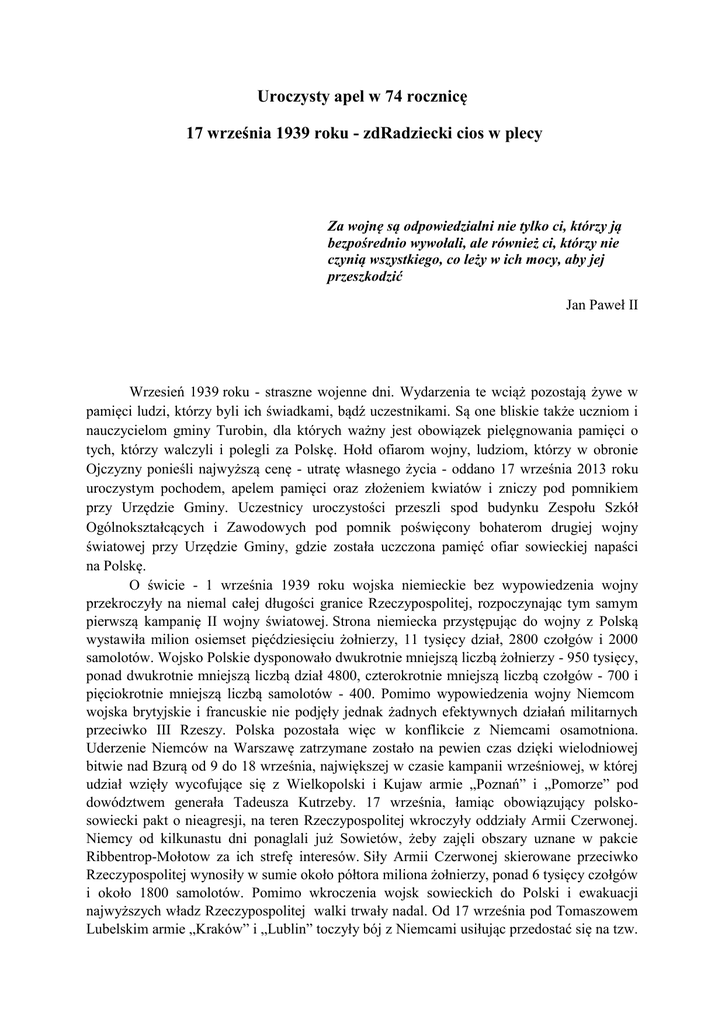 Uroczysty apel w 74 rocznicę 17 września 1939 roku - zdRadziecki cios w plecy Za wojnę są odpowiedzialni nie tylko ci, którzy ją bezpośrednio wywołali, ale również ci, którzy nie czynią wszystkiego, co leży w ich mocy, aby jej przeszkodzić Jan Paweł II Wrzesień 1939 roku - straszne wojenne dni. Wydarzenia te wciąż pozostają żywe w pamięci ludzi, którzy byli ich świadkami, bądź uczestnikami. Są one bliskie także uczniom i nauczycielom gminy Turobin, dla których ważny jest obowiązek pielęgnowania pamięci o tych, którzy walczyli i polegli za Polskę. Hołd ofiarom wojny, ludziom, którzy w obronie Ojczyzny ponieśli najwyższą cenę - utratę własnego życia - oddano 17 września 2013 roku uroczystym pochodem, apelem pamięci oraz złożeniem kwiatów i zniczy pod pomnikiem przy Urzędzie Gminy. Uczestnicy uroczystości przeszli spod budynku Zespołu Szkół Ogólnokształcących i Zawodowych pod pomnik poświęcony bohaterom drugiej wojny światowej przy Urzędzie Gminy, gdzie została uczczona pamięć ofiar sowieckiej napaści na Polskę. O świcie - 1 września 1939 roku wojska niemieckie bez wypowiedzenia wojny przekroczyły na niemal całej długości granice Rzeczypospolitej, rozpoczynając tym samym pierwszą kampanię II wojny światowej. Strona niemiecka przystępując do wojny z Polską wystawiła milion osiemset pięćdziesięciu żołnierzy, 11 tysięcy dział, 2800 czołgów i 2000 samolotów. Wojsko Polskie dysponowało dwukrotnie mniejszą liczbą żołnierzy - 950 tysięcy, ponad dwukrotnie mniejszą liczbą dział 4800, czterokrotnie mniejszą liczbą czołgów - 700 i pięciokrotnie mniejszą liczbą samolotów - 400. Pomimo wypowiedzenia wojny Niemcom wojska brytyjskie i francuskie nie podjęły jednak żadnych efektywnych działań militarnych przeciwko III Rzeszy. Polska pozostała więc w konflikcie z Niemcami osamotniona. Uderzenie Niemców na Warszawę zatrzymane zostało na pewien czas dzięki wielodniowej bitwie nad Bzurą od 9 do 18 września, największej w czasie kampanii wrześniowej, w której udział wzięły wycofujące się z Wielkopolski i Kujaw armie „Poznań” i „Pomorze” pod dowództwem generała Tadeusza Kutrzeby. 17 września, łamiąc obowiązujący polskosowiecki pakt o nieagresji, na teren Rzeczypospolitej wkroczyły oddziały Armii Czerwonej. Niemcy od kilkunastu dni ponaglali już Sowietów, żeby zajęli obszary uznane w pakcie Ribbentrop-Mołotow za ich strefę interesów. Siły Armii Czerwonej skierowane przeciwko Rzeczypospolitej wynosiły w sumie około półtora miliona żołnierzy, ponad 6 tysięcy czołgów i około 1800 samolotów. Pomimo wkroczenia wojsk sowieckich do Polski i ewakuacji najwyższych władz Rzeczypospolitej walki trwały nadal. Od 17 września pod Tomaszowem Lubelskim armie „Kraków” i „Lublin” toczyły bój z Niemcami usiłując przedostać się na tzw. przedmoście rumuńskie. 20 września, po wyczerpaniu amunicji, skapitulowały. 22 września, po wielodniowej walce z Niemcami, dowódca obrony Lwowa generał Władysław Langner poddał miasto Sowietom. Do 28 września broniła się Warszawa, a do 2 października załoga Helu. 6 października zakończyła walkę ostatnia duża polska formacja - Samodzielna Grupa Operacyjna „Polesie”, dowodzona przez generała Franciszka Kleeberga. Uroczystość 74 rocznicy agresji sowieckiej na Polskę rozpoczął Dyrektor Zespołu Szkół Ogólnokształcących i Zawodowych Pan Marek Majewski. Po słowie wprowadzenia wszyscy zgromadzeni odśpiewali hymn narodowy. Następnie głos zabrał Pan Tadeusz Albiniak – Przewodniczący Rady Gminy. Stwierdził on, że dzisiejsza lekcja historii pod pomnikiem przy Urzędzie Gminy ma nie tylko ogromną wartość patriotyczną, lecz także charakter więzi międzypokoleniowych oraz służy integracji lokalnego środowiska. W dalszej części uczniowie z Zespołu Szkół Ogólnokształcących i Zawodowych pod kierunkiem Marii Olech i Artura Lisa oraz uczniowie Szkoły Podstawowej pod opieką Bożeny Białek - zaprezentowali część artystyczną. Wyrażono w ten sposób wdzięczność bohaterom II wojny światowej za wywalczenie dla nas wolności i niepodległości. Pozwólmy sobie zacytować szerszy fragment odczytu dotyczącego sytuacji we wrześniu 1939 roku na ziemi turobińskiej: „W dniu 1 września 1939 roku, wczesnym rankiem radio podało informację o wybuchu wojny. W okresie wojny wrześniowej Turobin nie był bombardowany przez lotnictwo niemieckie. Przewinęło się tu wiele uchodźców z zachodnich terenów Polski, którzy spotkali się z życzliwością miejscowej ludności. Armie wroga wbijały kliny pancerne głęboko w linie polskich wojsk, które w obronie ruchomej cofały się pod naporem nieprzyjaciela. Oddział podpułkownika Stanisława Trzebuni wchodzący w skład grupy obronnej Stalowa Wola, znajdował się 16 września w Janowie Lubelskim i miał dołączyć do grupy Sandomierz. Kiedy jednak podpułkownik Trzebunia zauważył na swej drodze na wschód obecność nieprzyjaciela, skręcił na północ i nocą zamierzał przejść przez Turobin do Krasnegostawu. 17 września natknął się pod Turobinem na zaporę niemiecką. W wyniku heroicznej obrony oddziałów odwrotowych poległ porucznik Franciszek Duszczyński i pięciu kanonierów: Franciszek Kalemba, Kazimierz Worszczuk, Franciszek Maczagowski, Marian Motyka i jeden nieznany żołnierz z piątej baterii szóstego Pułku Artylerii Lekkiej. W tej sytuacji podpułkownik Trzebunia zarządził wycofanie oddziału z powrotem do lasu na południowy zachód od Turobina, gdzie stoczono ciężki bój z Niemcami. Oddział został rozbity i rozproszony. Po bitwie wojsko niemieckie wkroczyło do Turobina. Żołnierzom polskim, którym nie udało się wycofać ze swoim oddziałem, społeczeństwo osady pospieszyło z pomocą, ukrywając ich lub odstępując ubrania cywilne. Zdawano sobie sprawę, iż ludzie ci będą potrzebni 